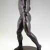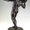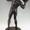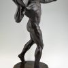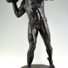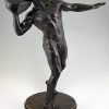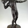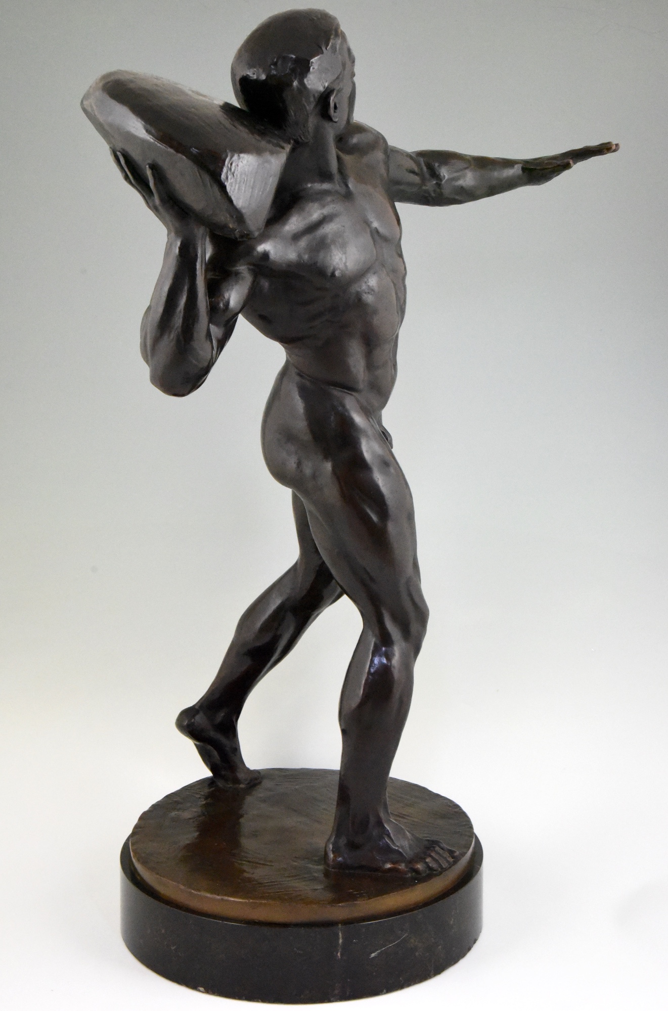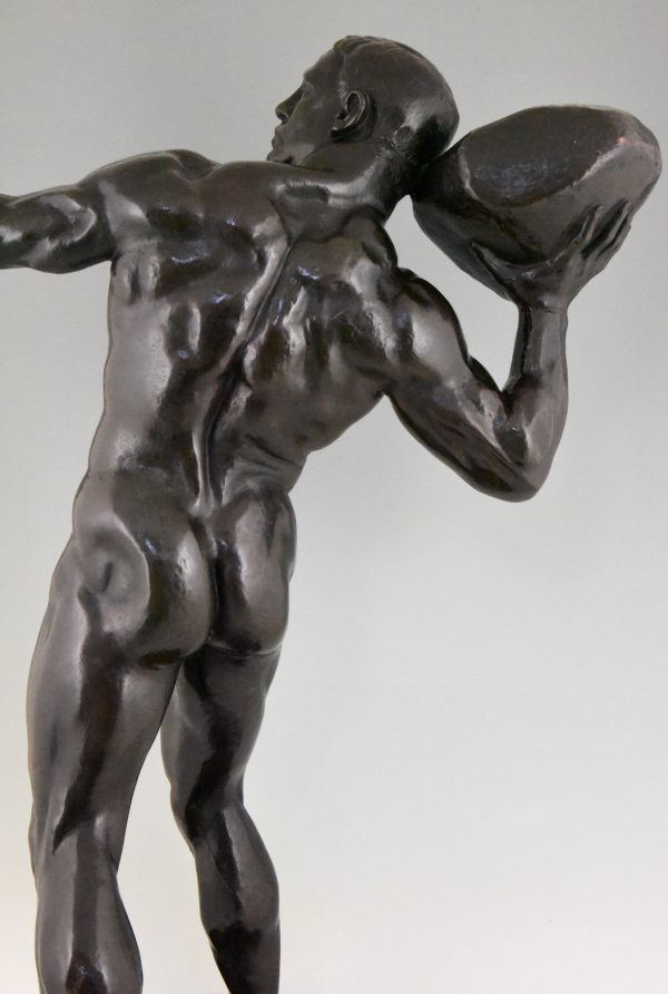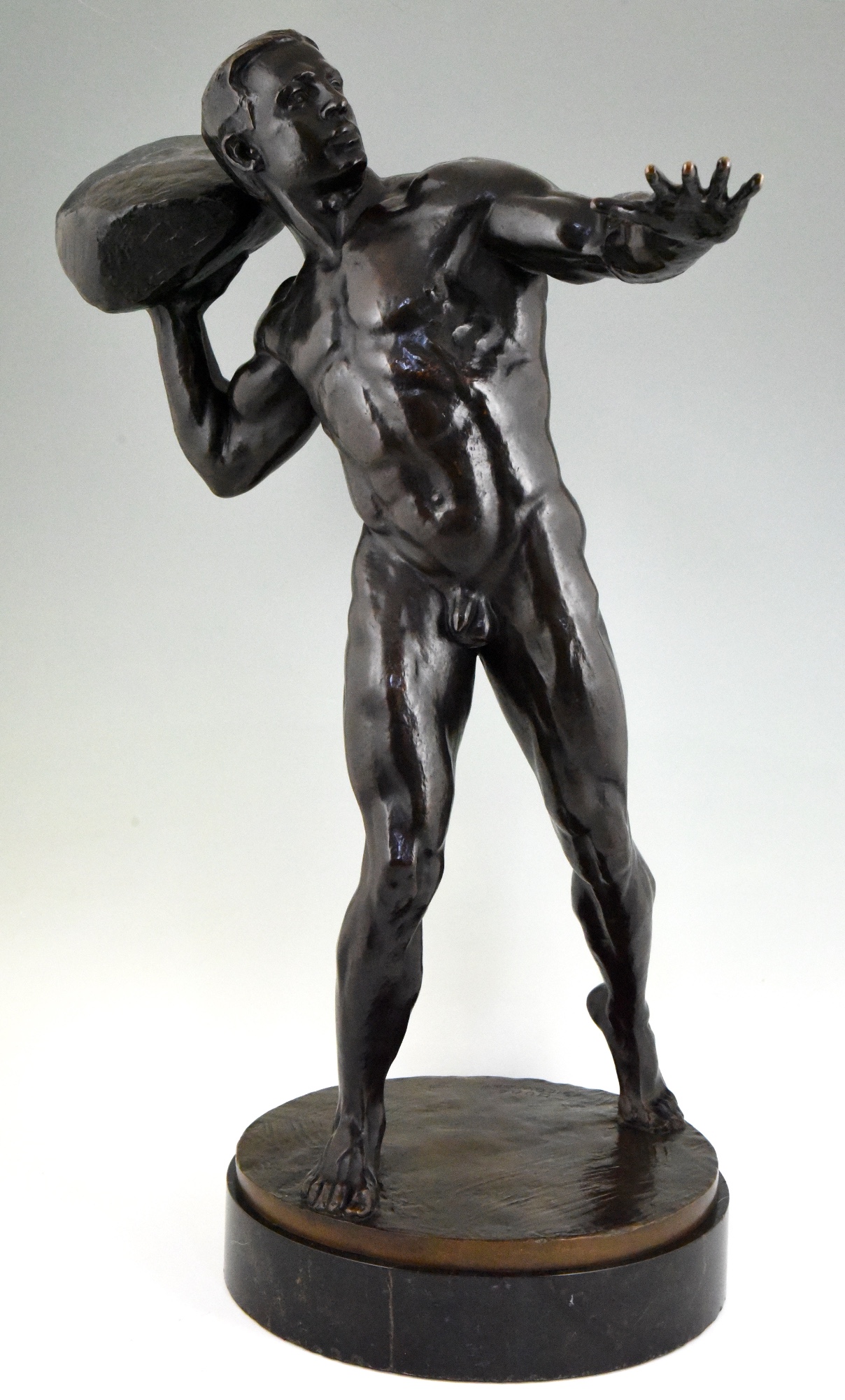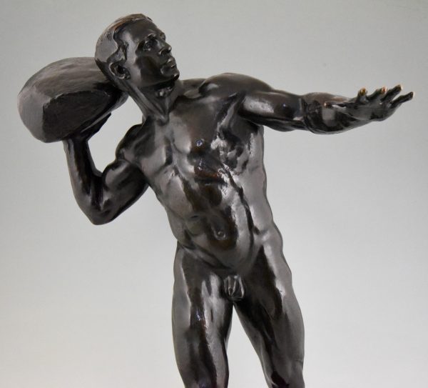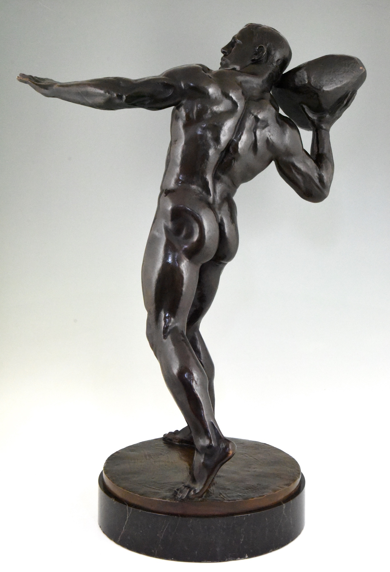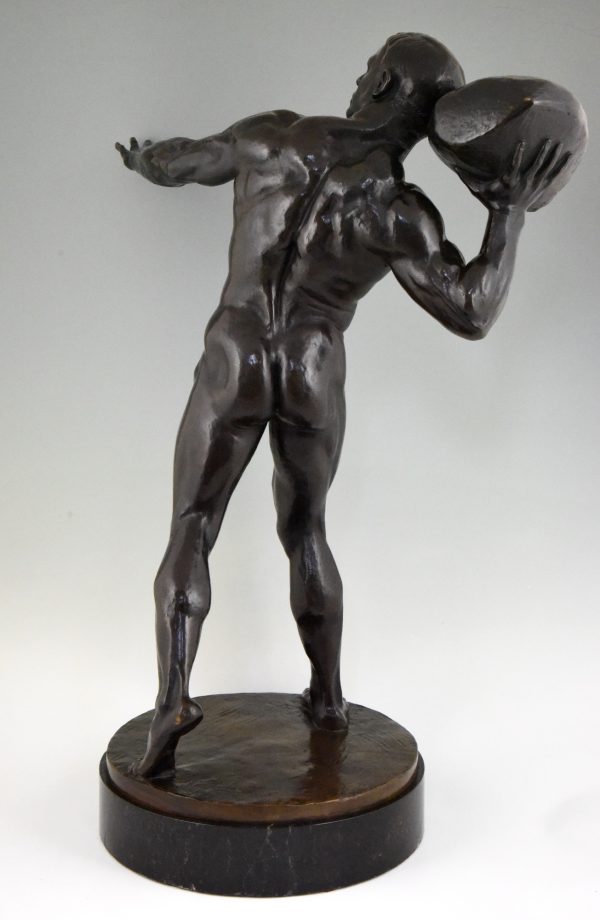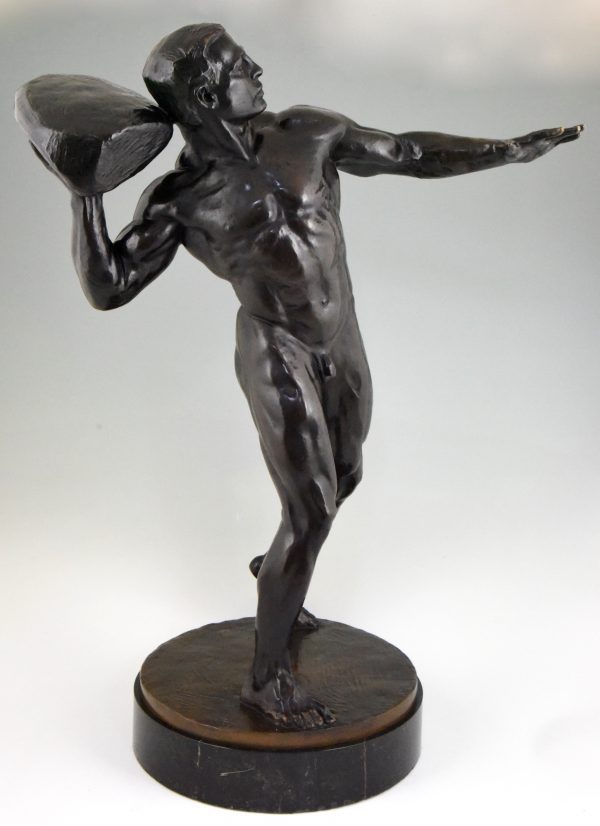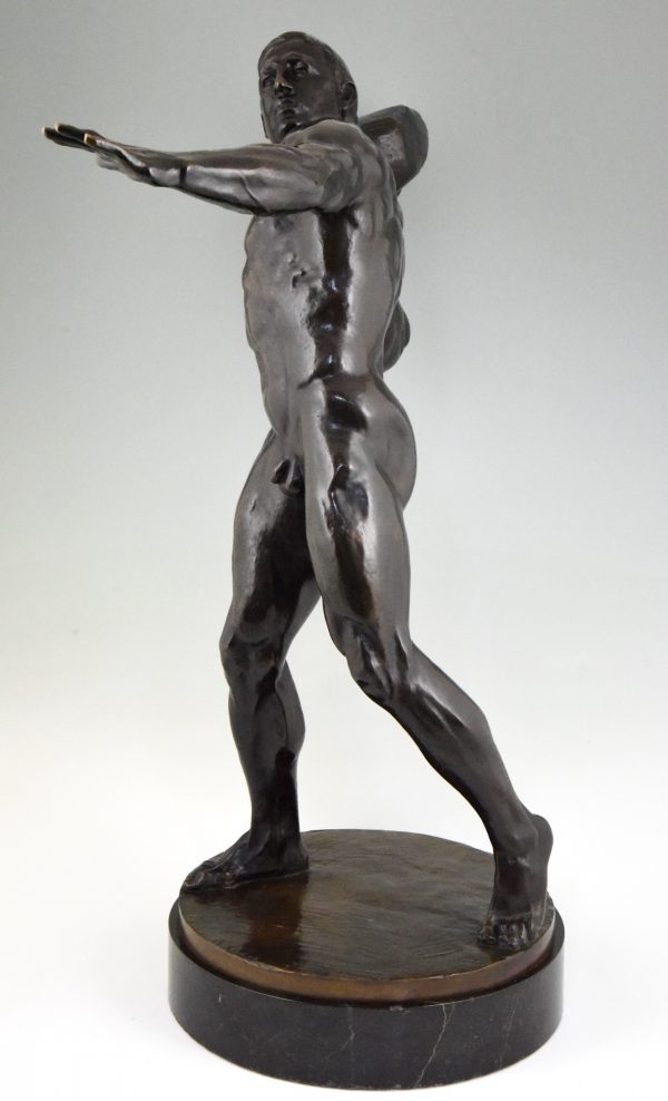 Impressive Antique sculpture of a male nude throwing a stone by the Swiss artist Hugo Siegwart (1865-1938) He worked in Germany and France.