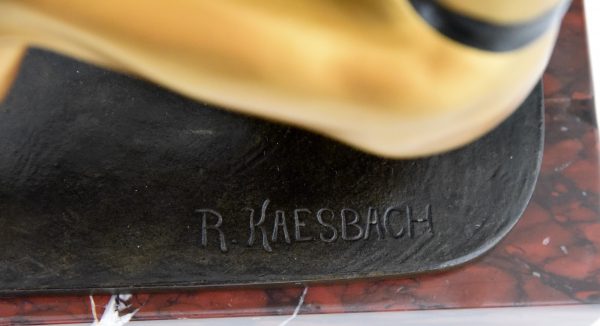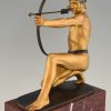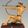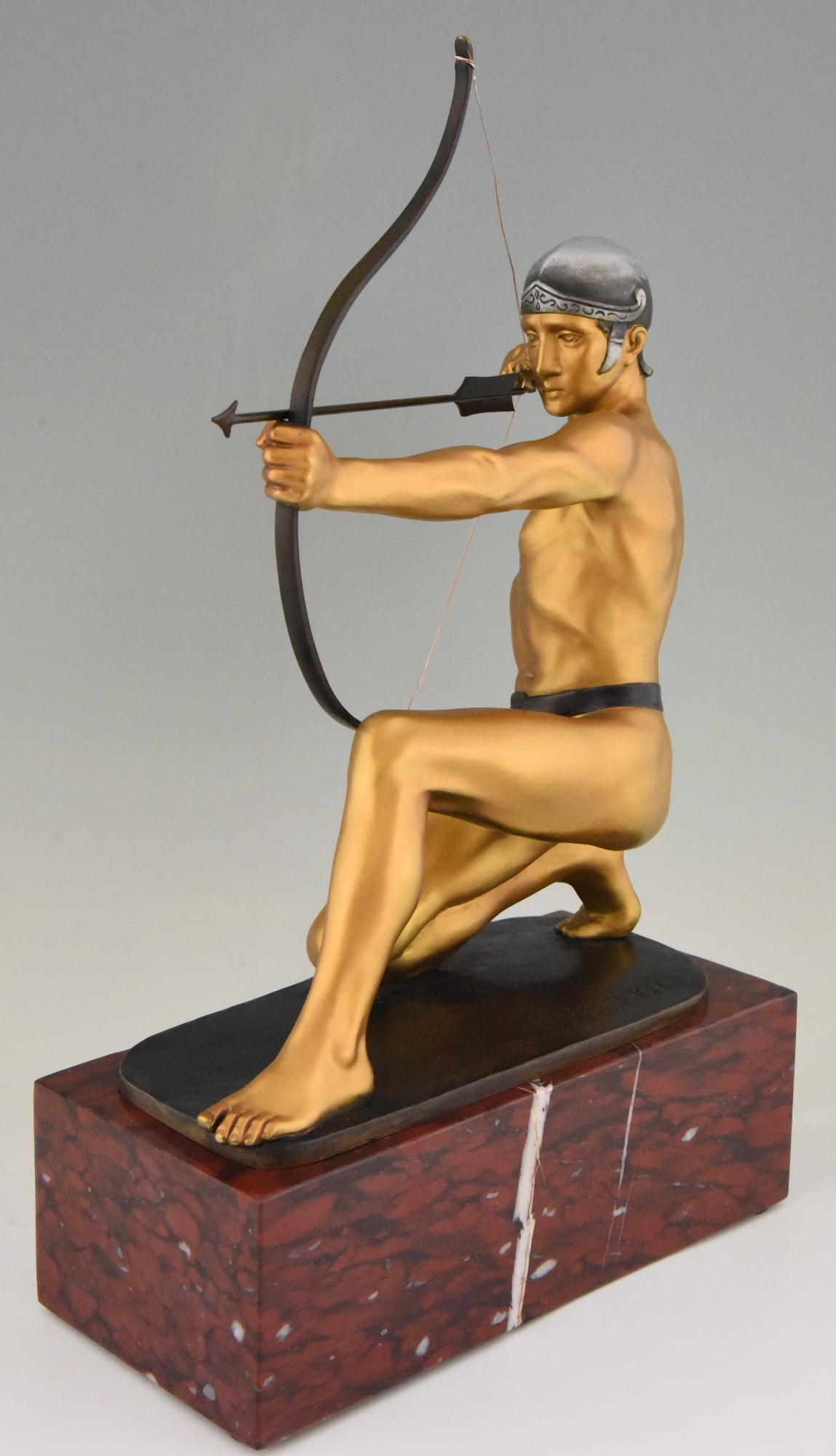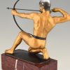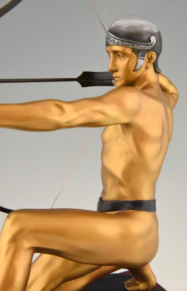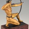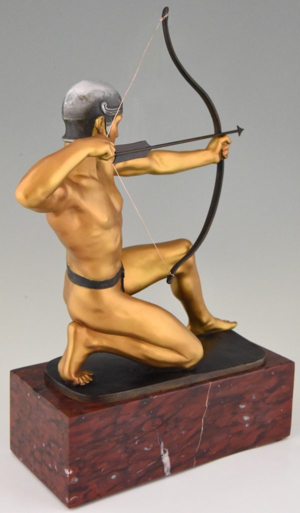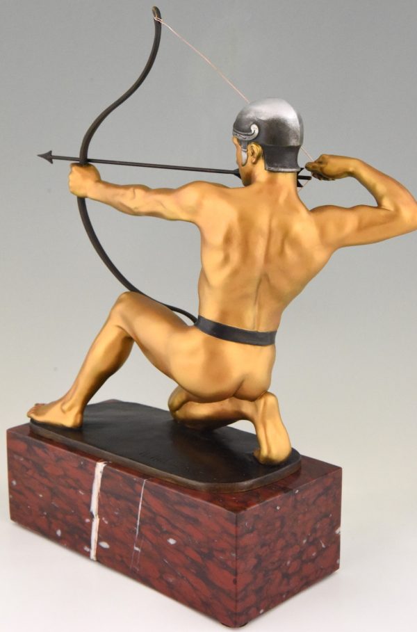 Antique bronze sculpture of an archer with bow by the German sculptor Rudolf Kaesbach. The male nude is aiming in a kneeled pose and is wearing a silver helmet.