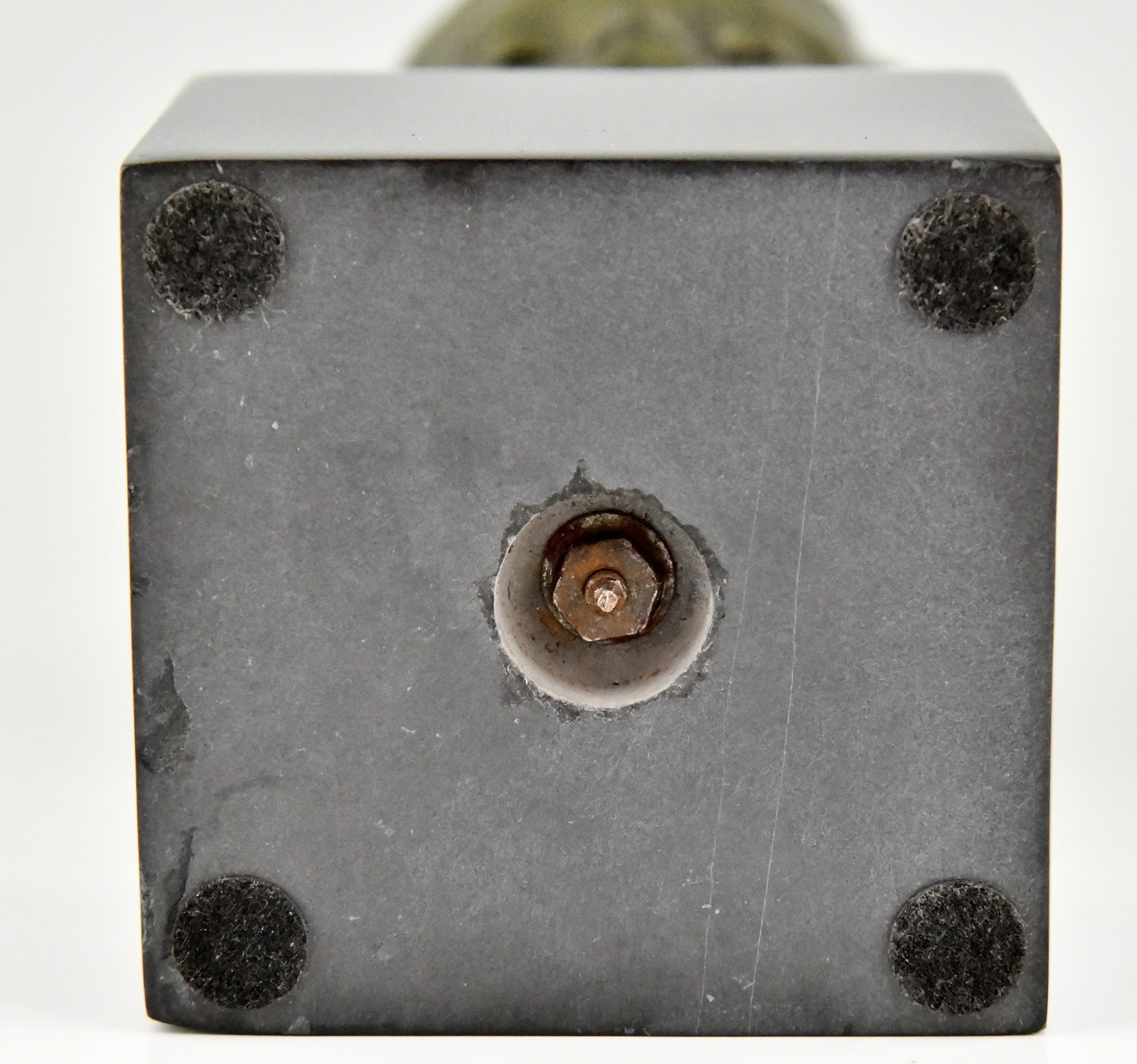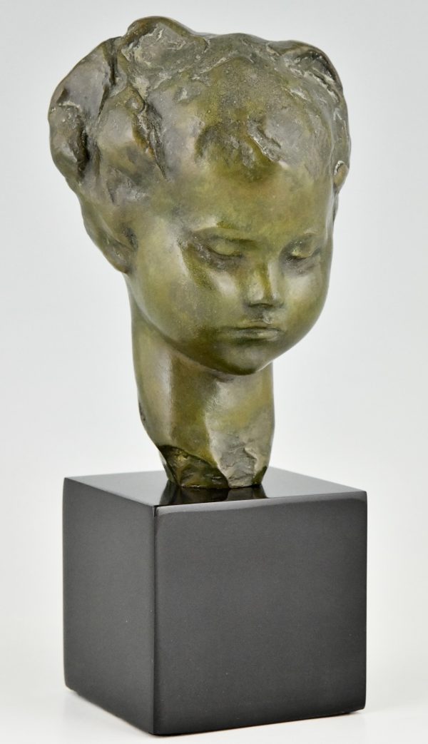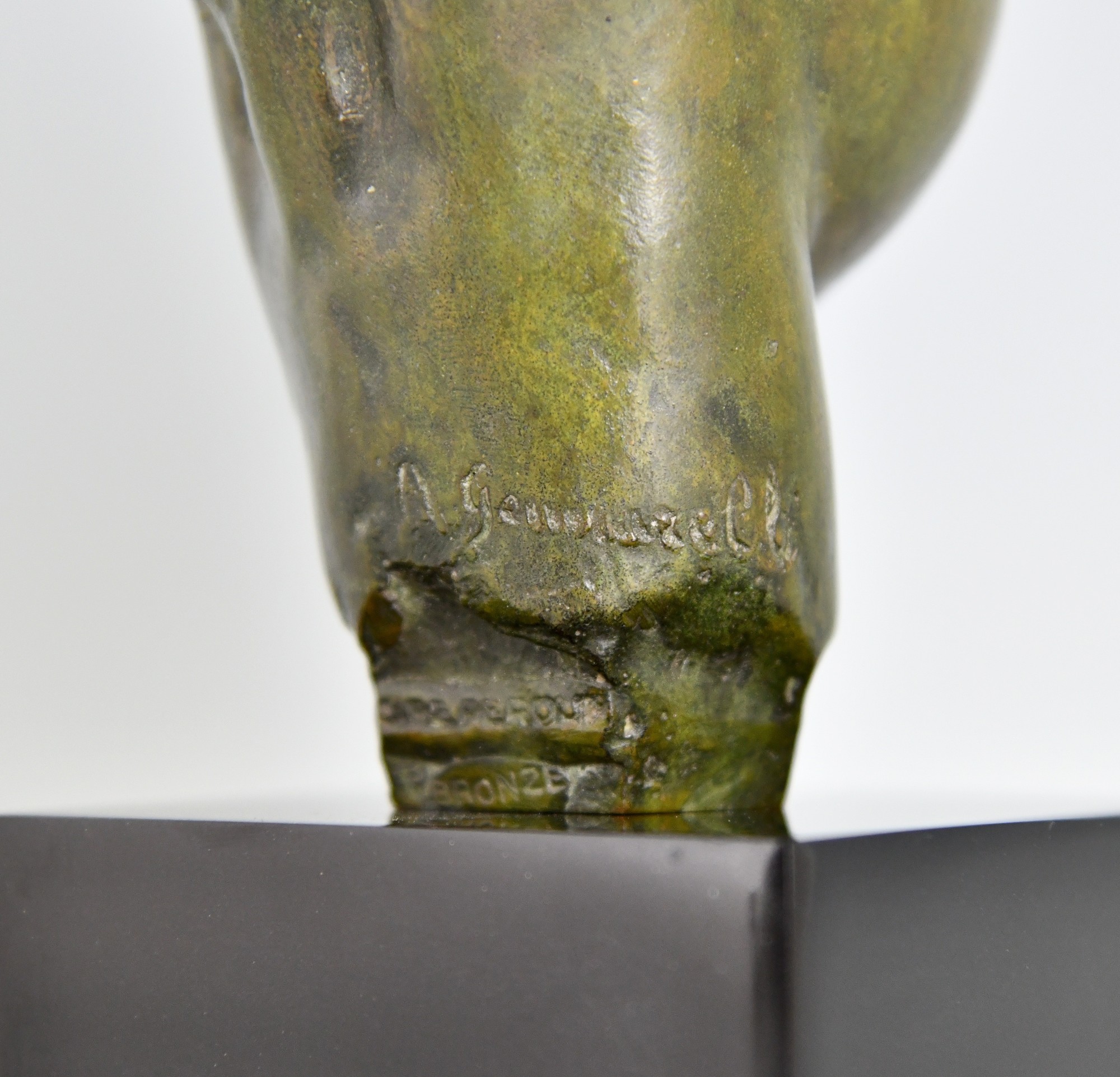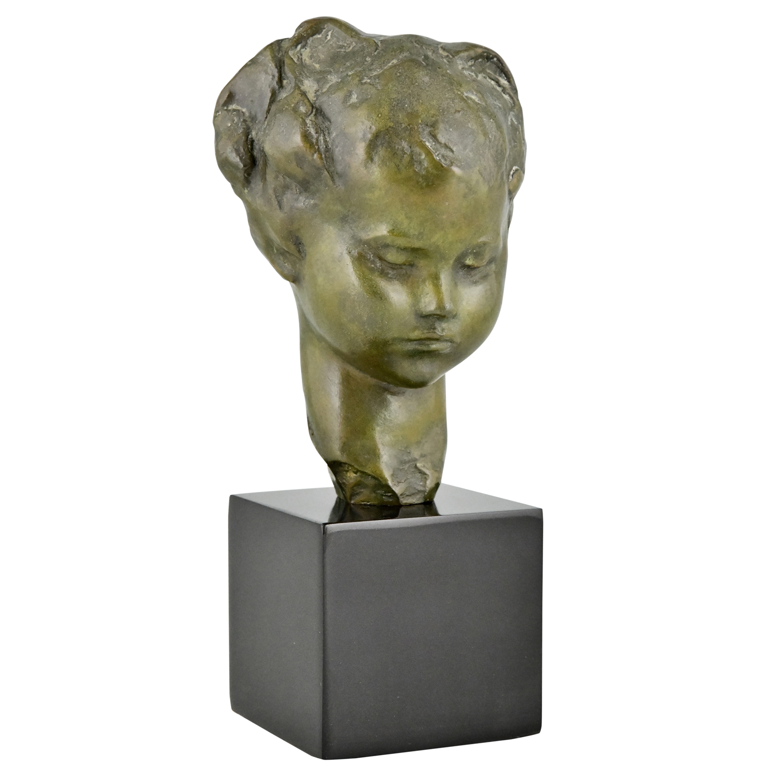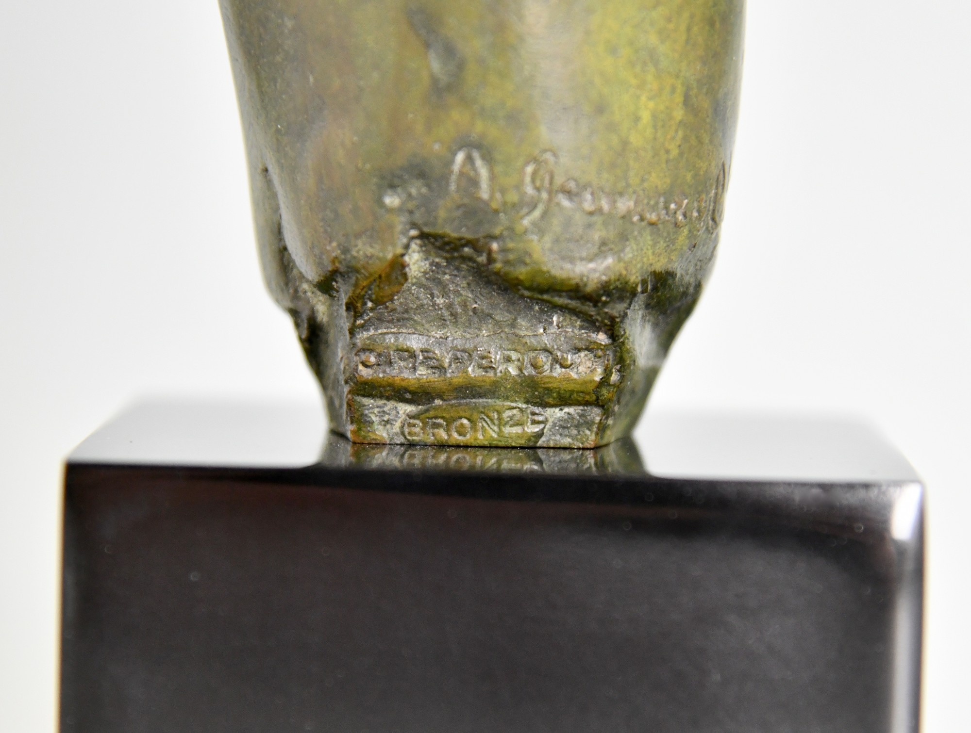 Art Deco bronze sculpture bust of a girl by the artist Amadeo Gennarelli, who was born in Napels and worked in France The bust is cast in the lost wax technique, cire perdue. Ca. 1920.  The patinated bronze head stands on a Belgian Black marble base.