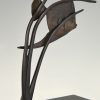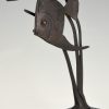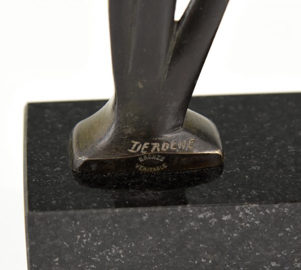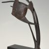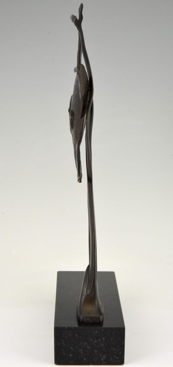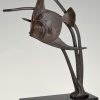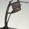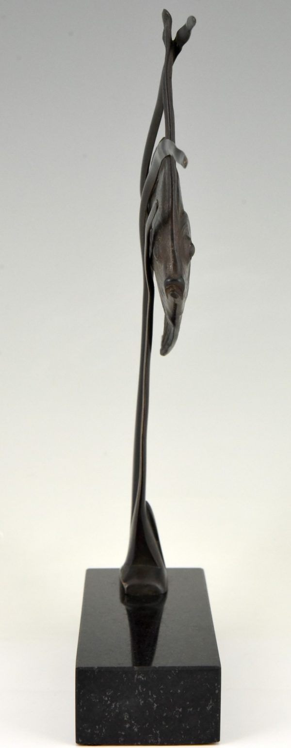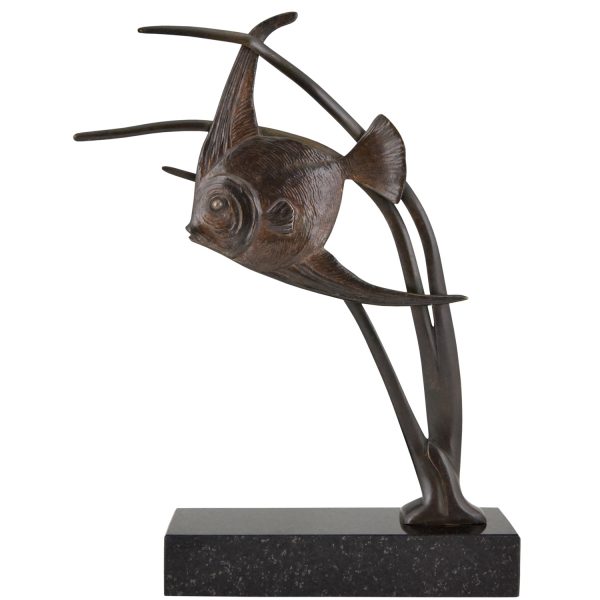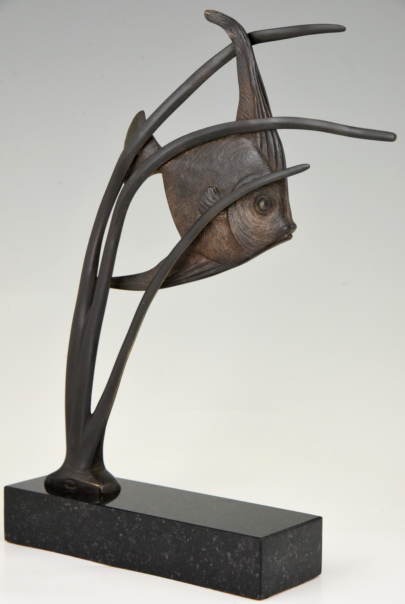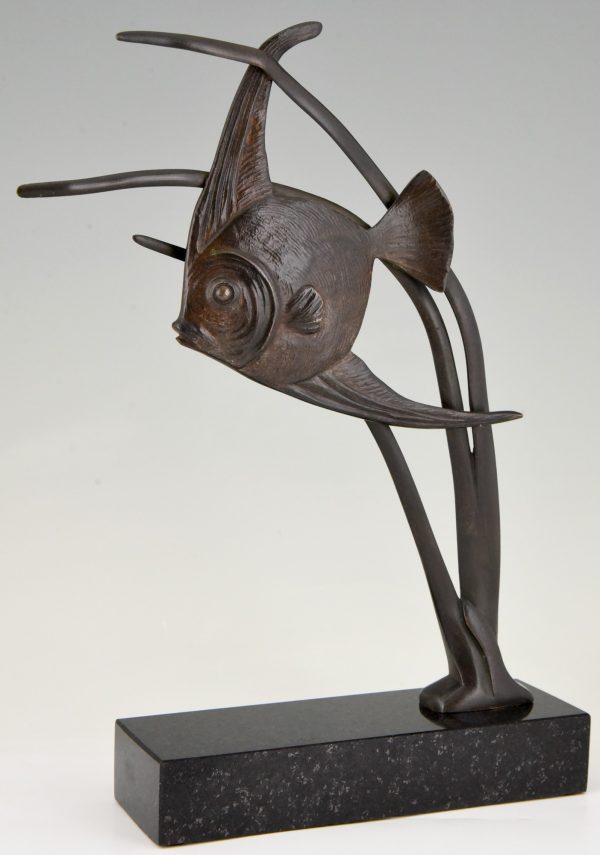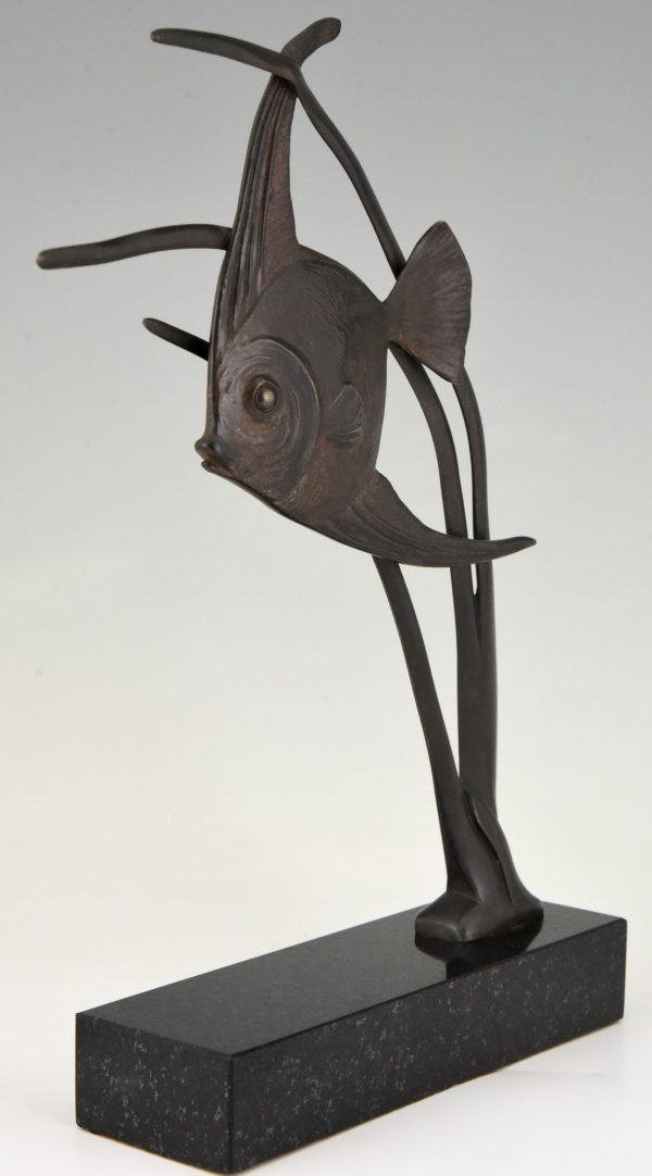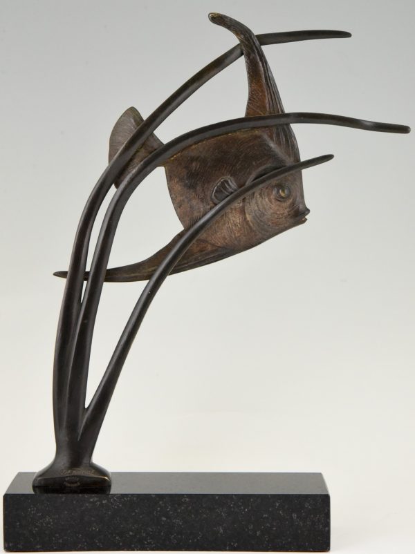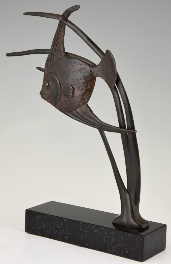 Art Deco bronze sculpture of a fish and waterplants on a Belgian black marble base signed by the French artist De Roche.