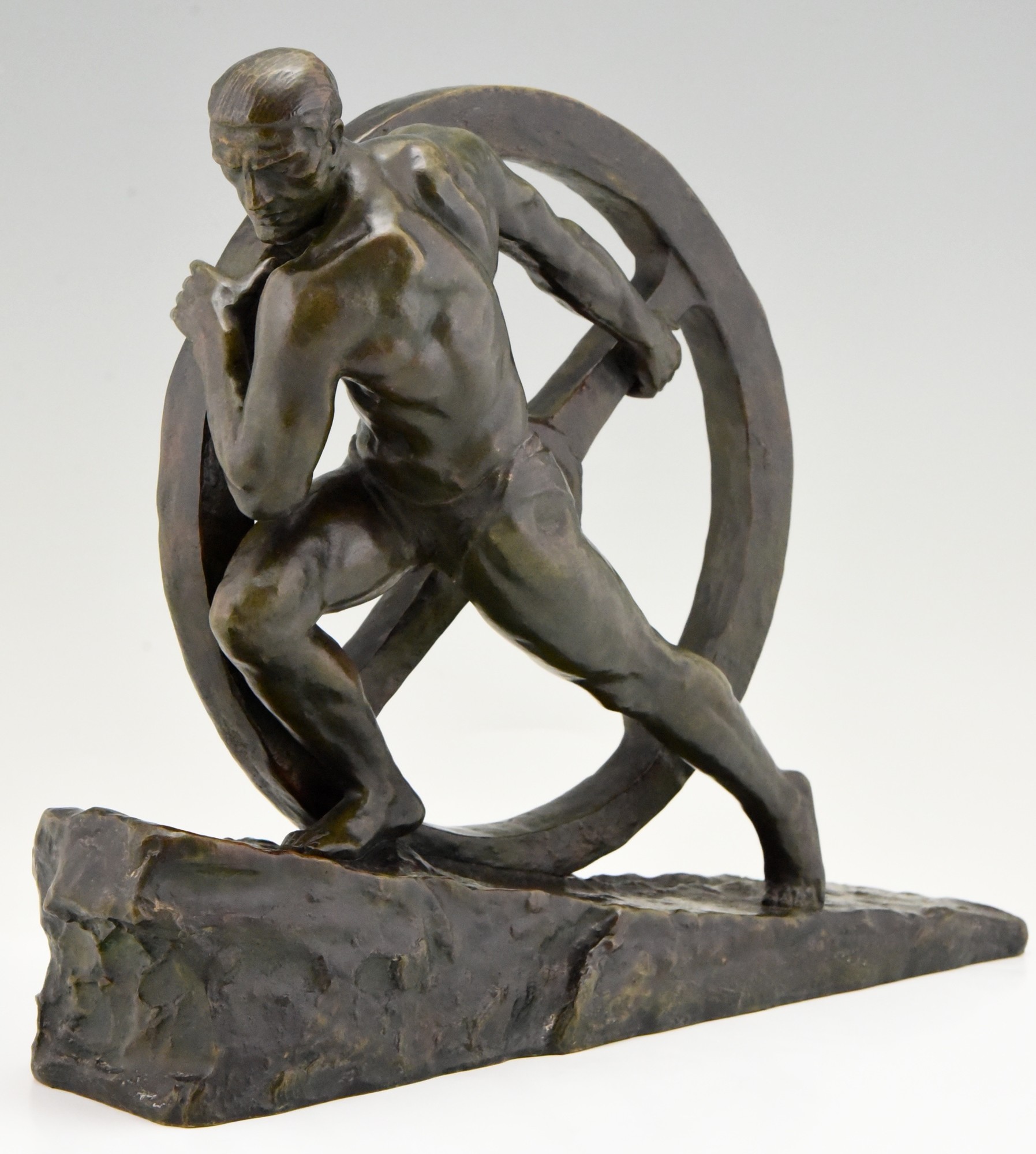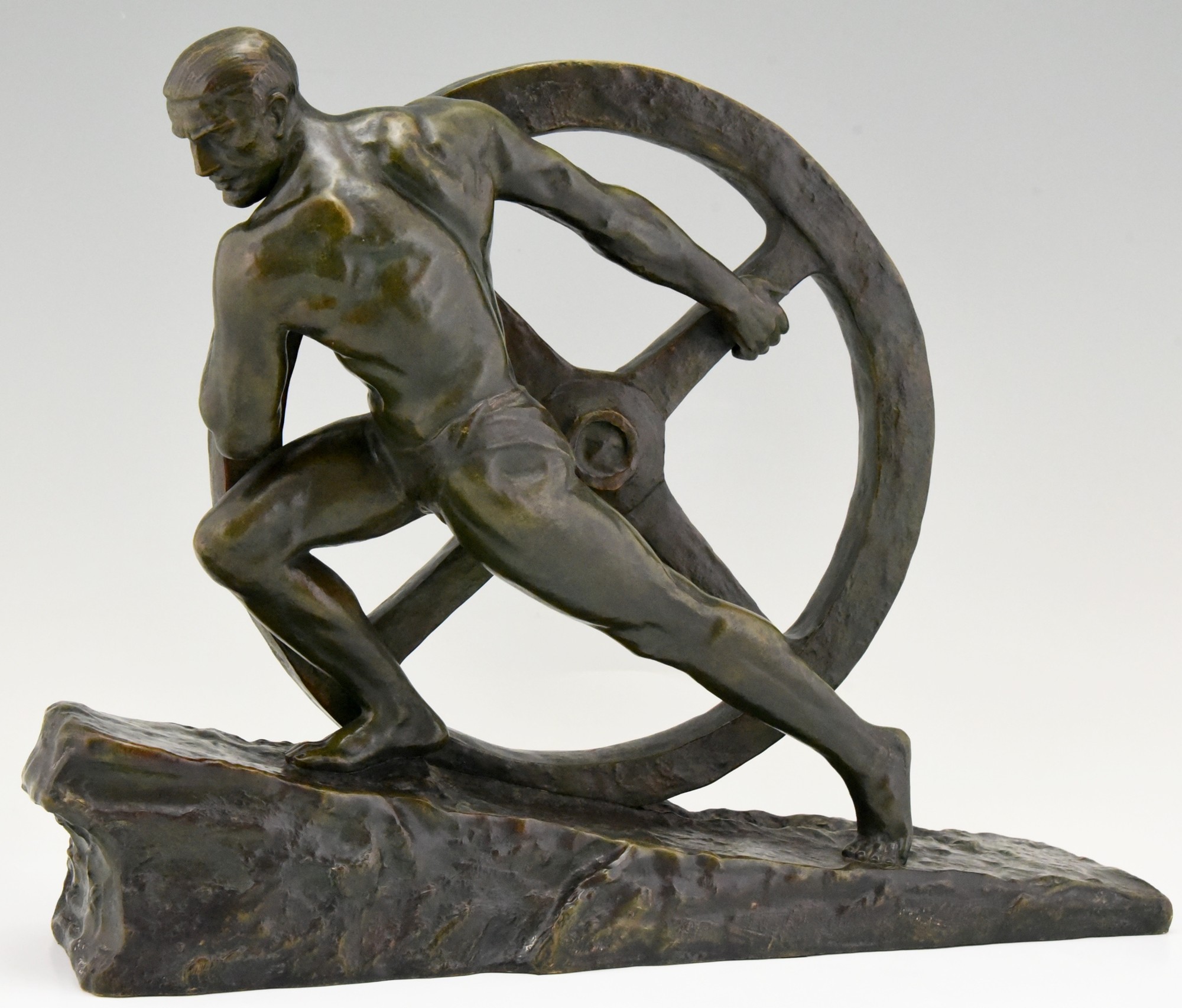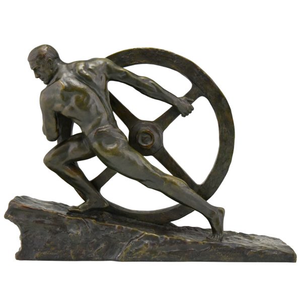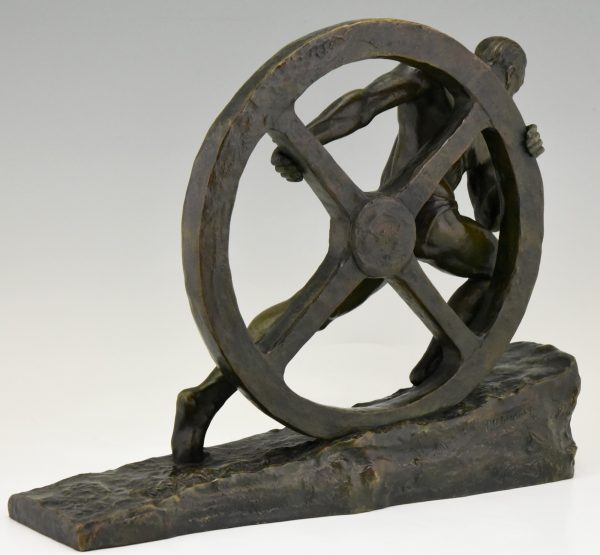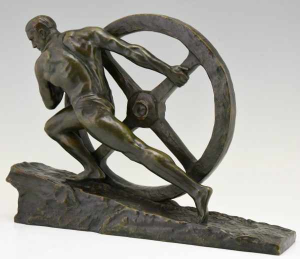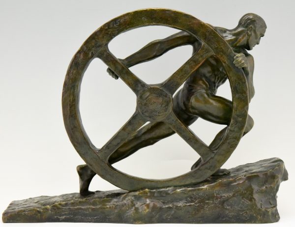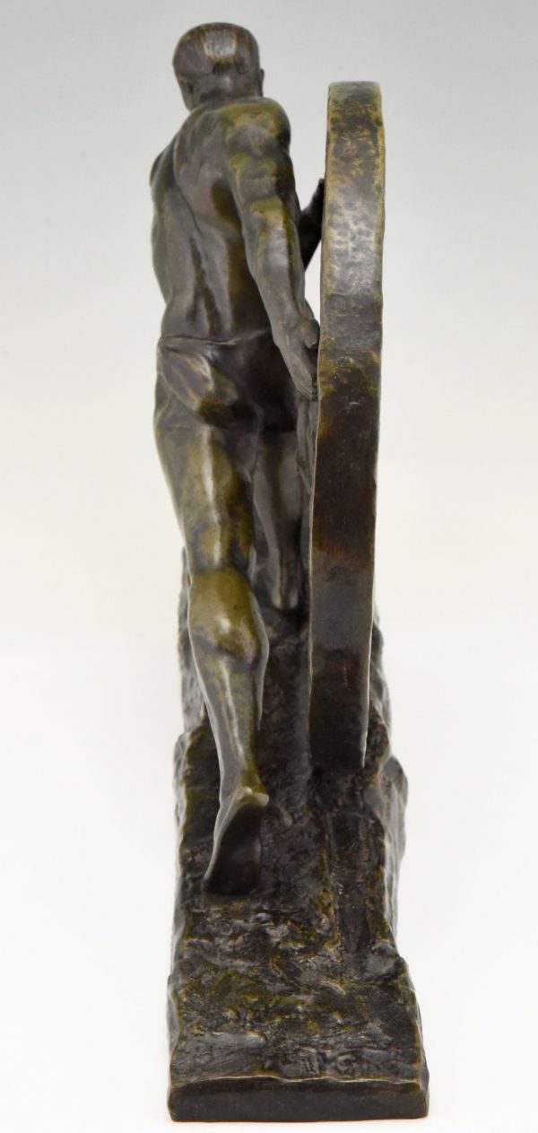 Art Deco bronze sculpture of a male nude athlete pushing a wheel "Strenght". Signed by the French artist Pierre Le Faguays. The bronze statue has a green patina with lighter shades. Ca. 1930.