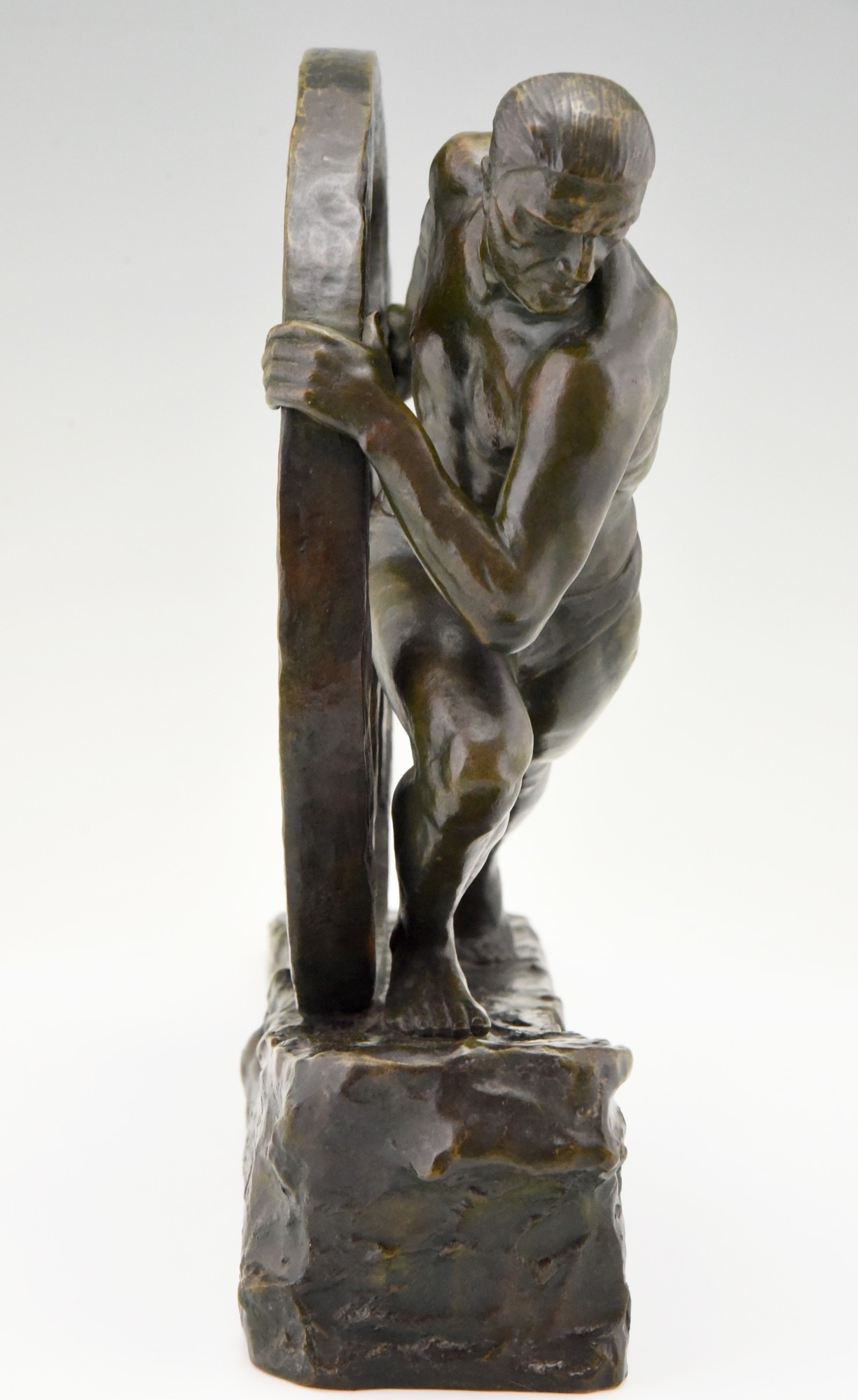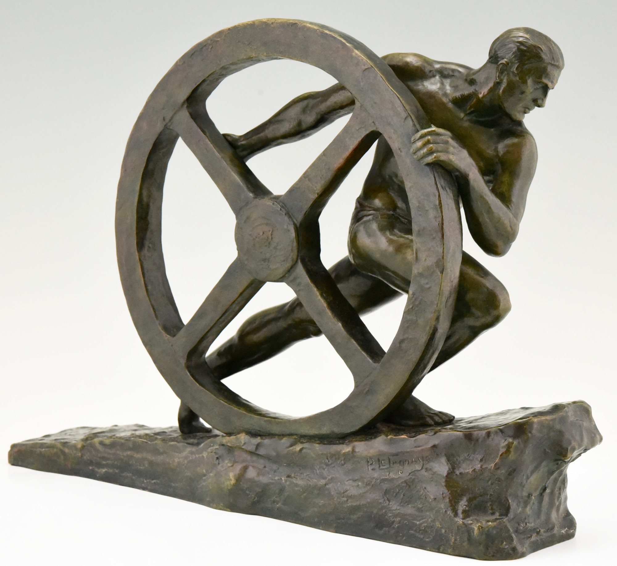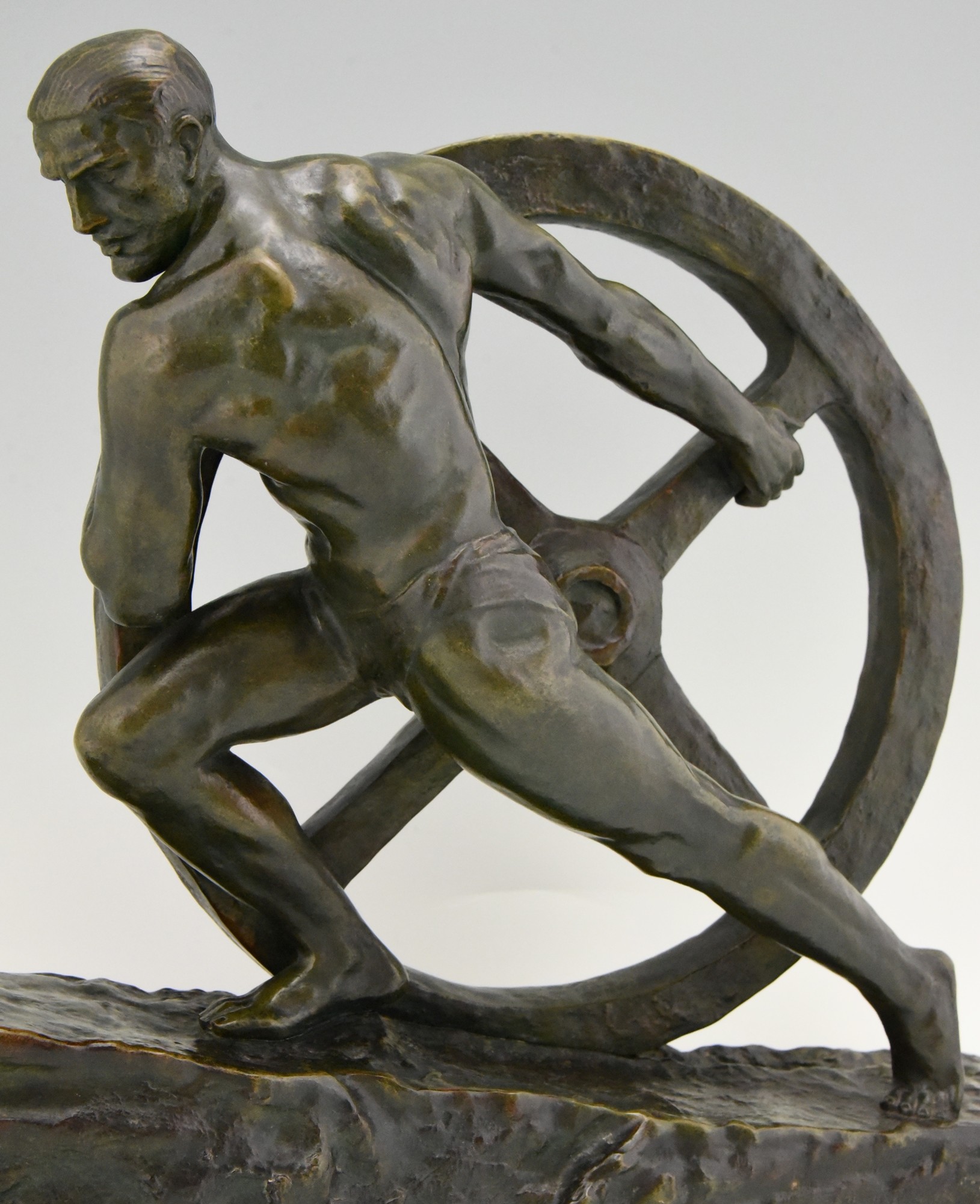 Art Deco bronze sculpture of a male nude athlete pushing a wheel "Strenght". Signed by the French artist Pierre Le Faguays. The bronze statue has a green patina with lighter shades. Ca. 1930.