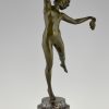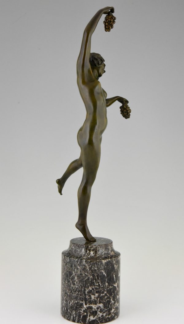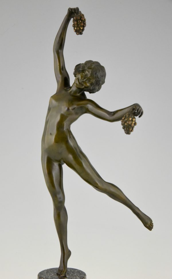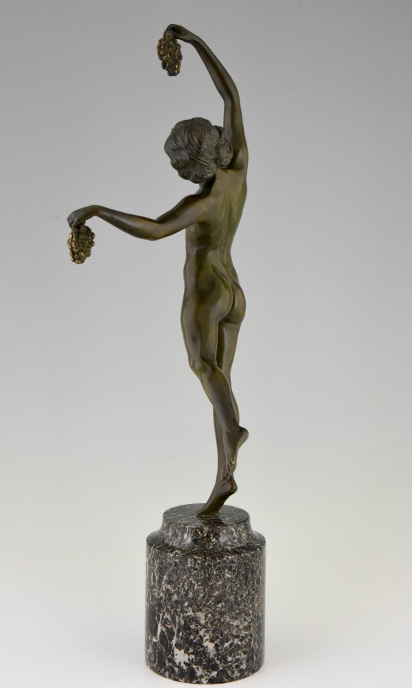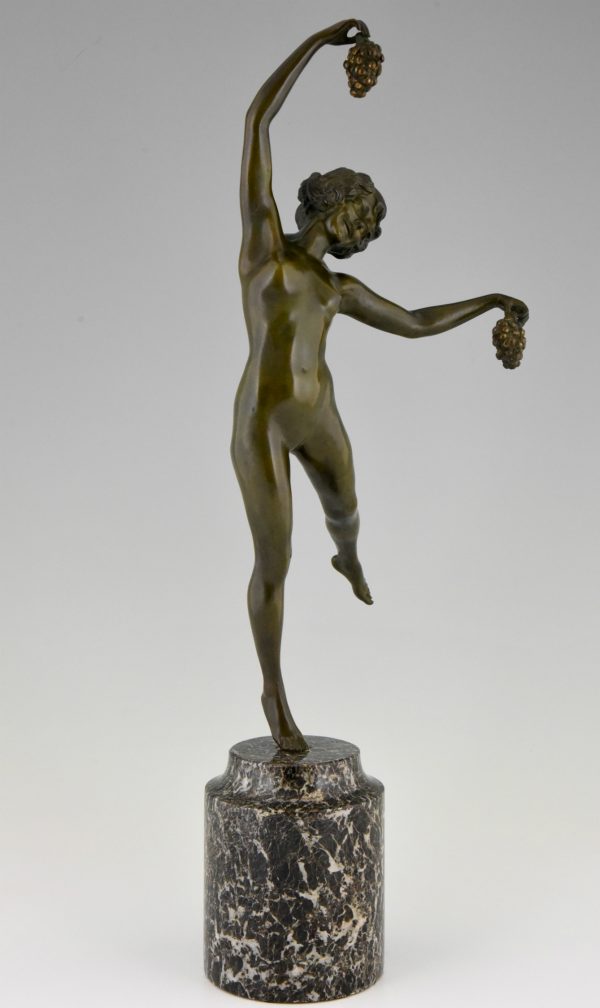 A fine bronze Art Deco figure of a dancing nude with grapes by the French artist Pierre Le Faguays on a green marble base.