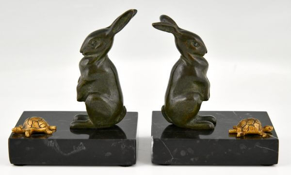 Art Déco Buchstützen Bronze der Hase und die Schildkröte