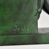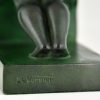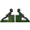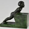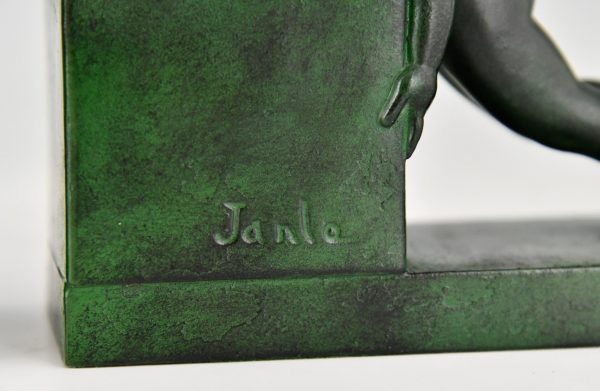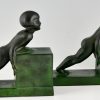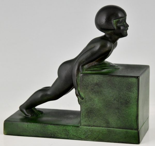 Art Deco child bookends, little girls pushing a cube. The pair is signed Janle and cast at the Max Le Verrier foundry in Paris, France ca. 1930 Patinated Art Metal.