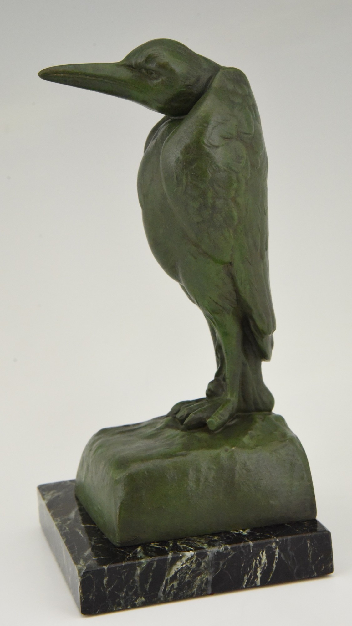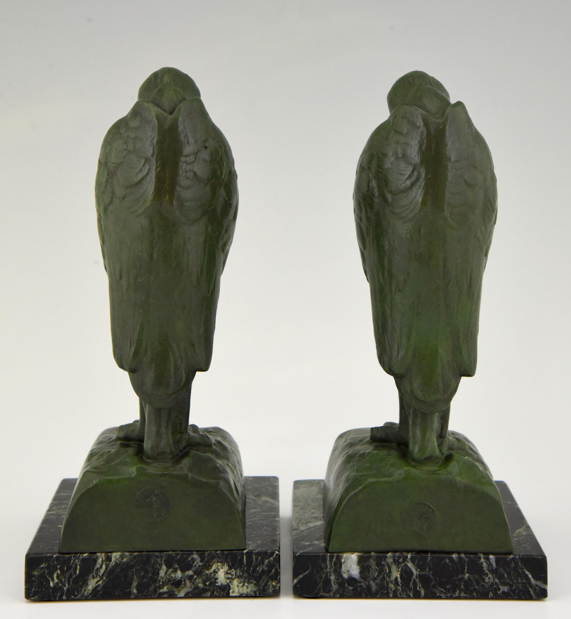 Belgian artist born in 1878 worked in France. The bird sculptures are in Art Metal with a dark green patina and are mounted on green marble bases.