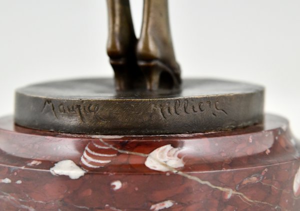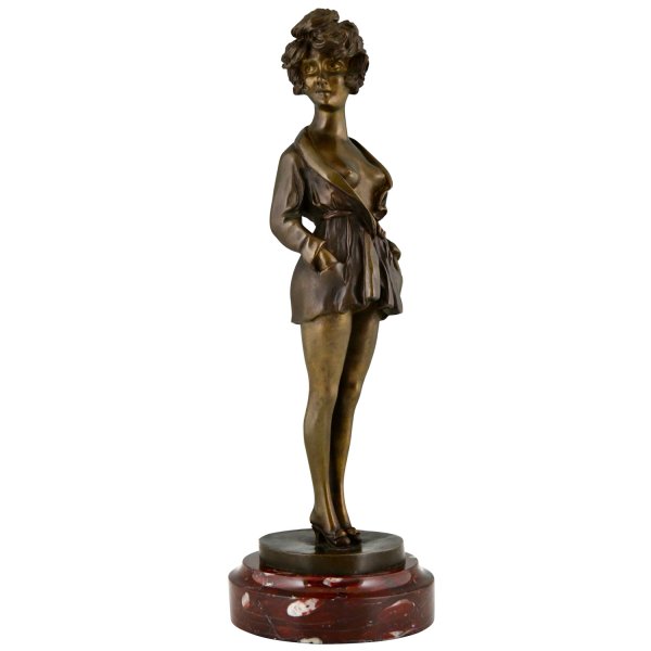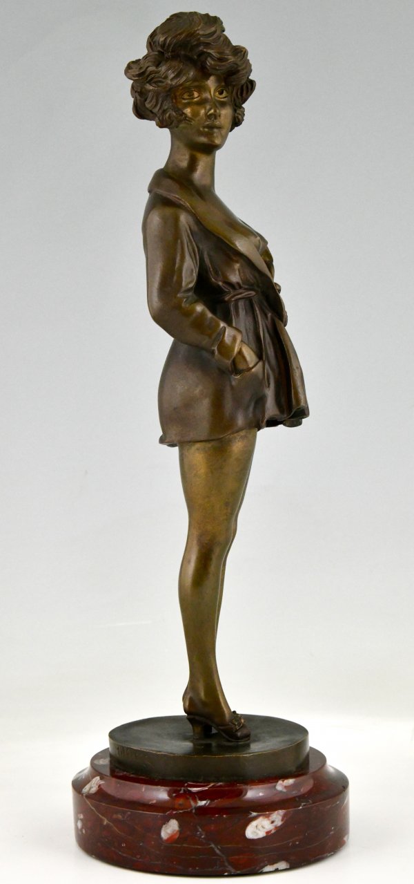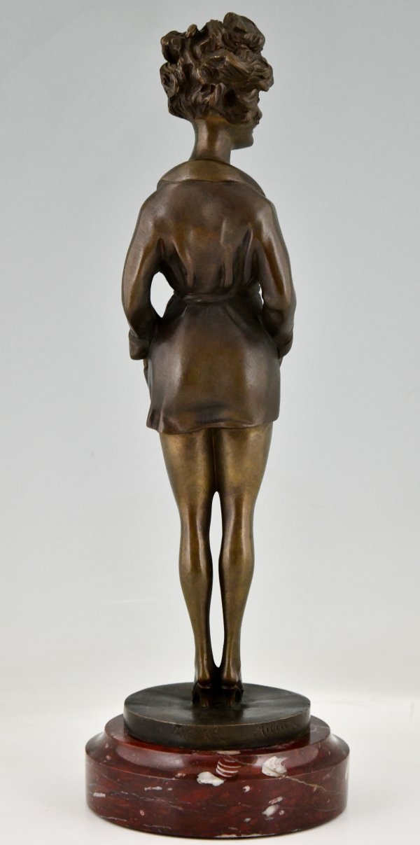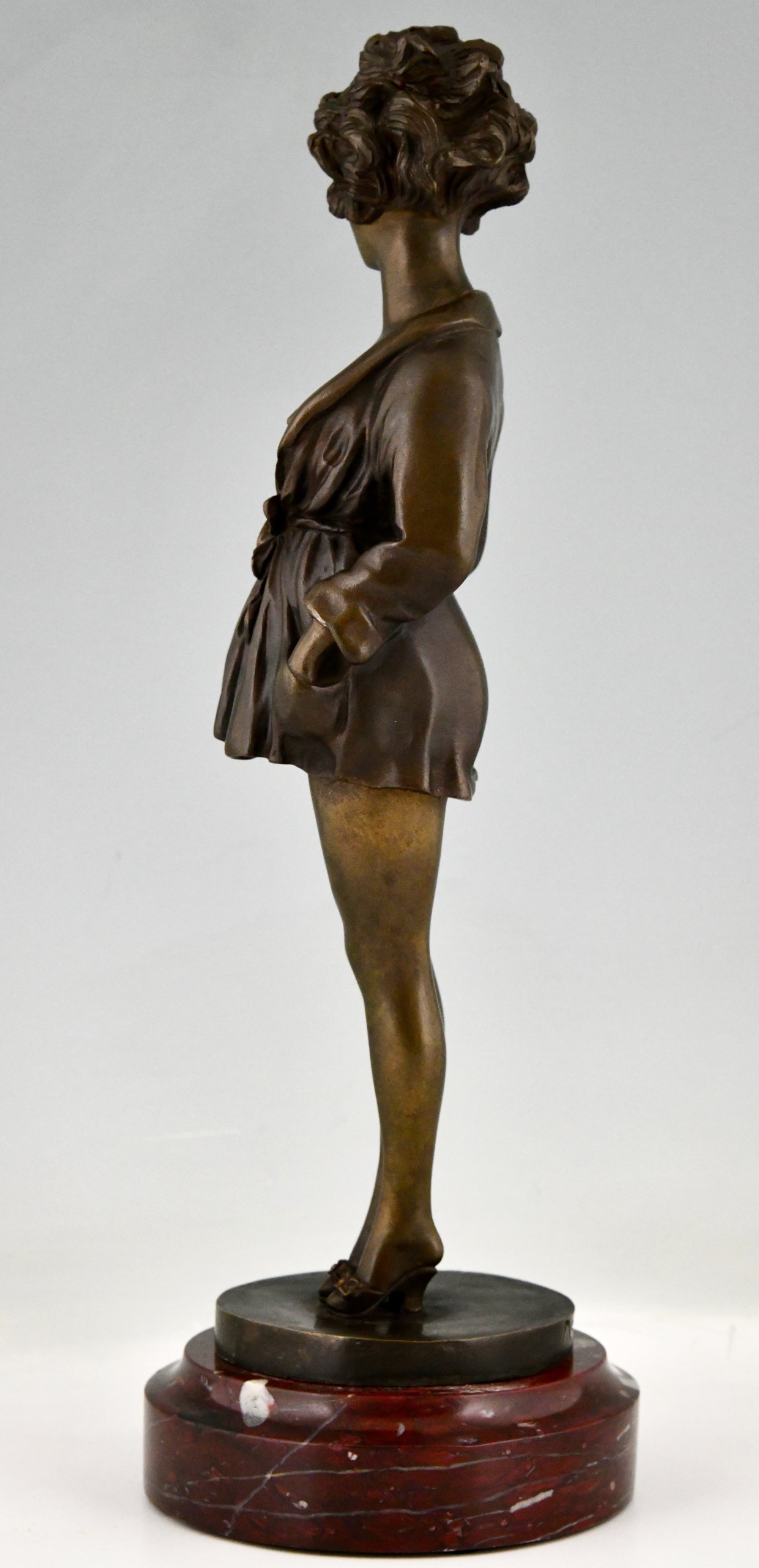 Art Deco erotischer Bronzeakt im Morgenmantel, La Parisienne von Maurice Milliere auf rotem Marmorsockel