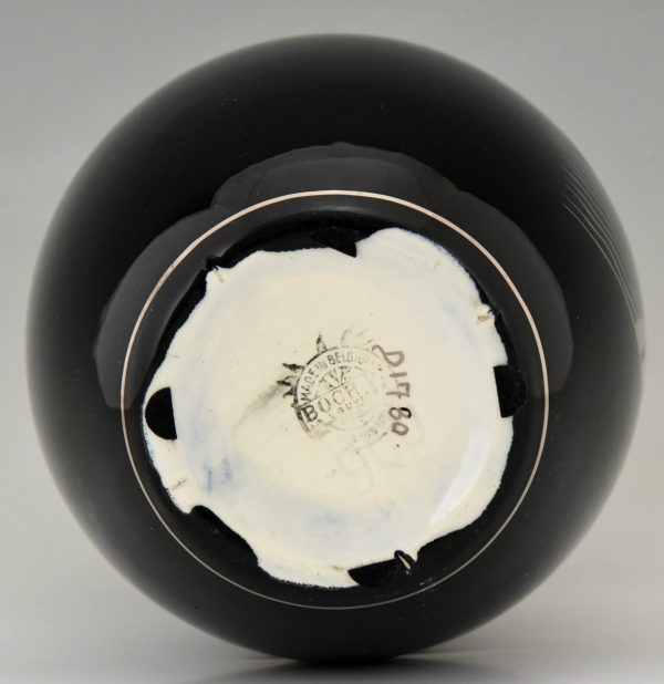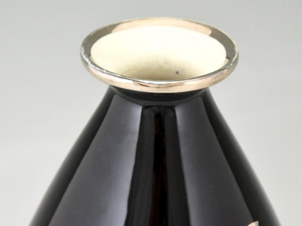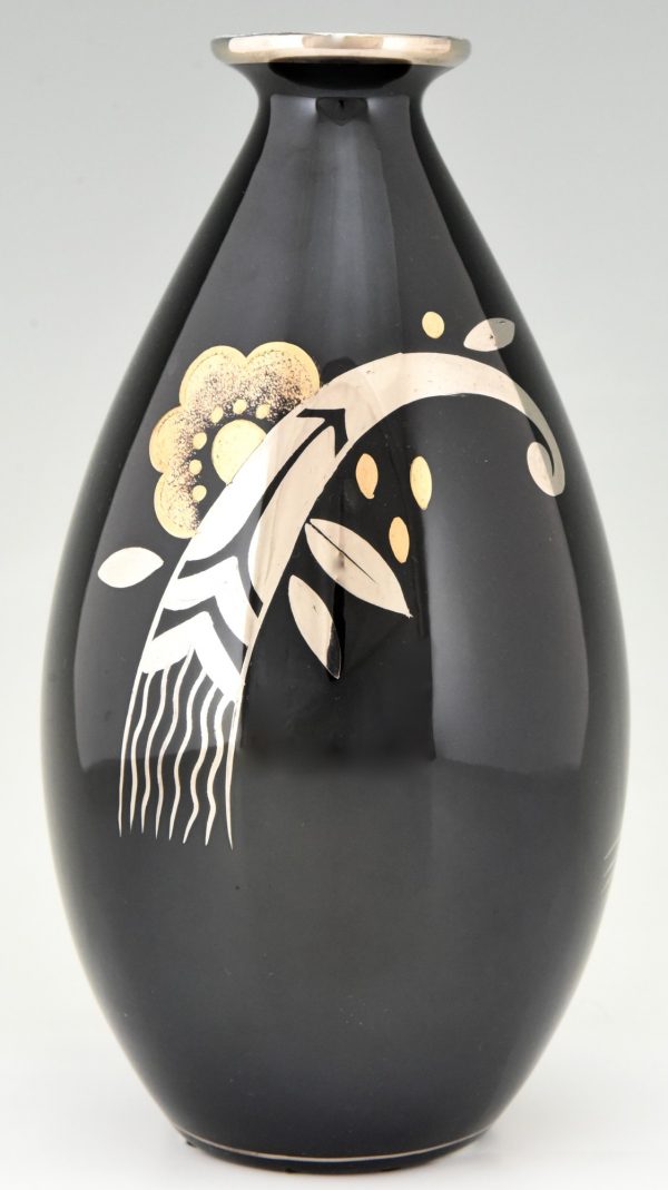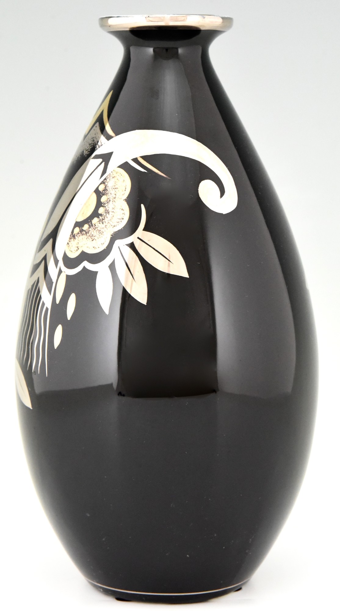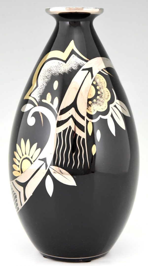 Ceramic vase with Art Deco pattern in silver and gold on a black shiny glaze by Boch Frères, La Louvière Belgium 1931/1932.