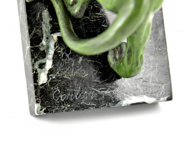Art Deco Löwen Buchstützen signiert Emile Carlier. Metallguss, patiniert, Marmor Sockel. Frankreich 1930.