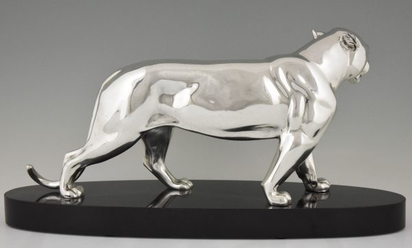 Very nice silvered bronze sculpture of a walking panther by Irenee Rochard on an oval Belgian black marble base.
