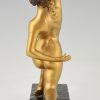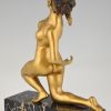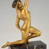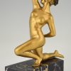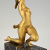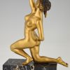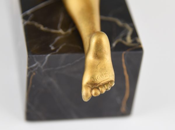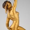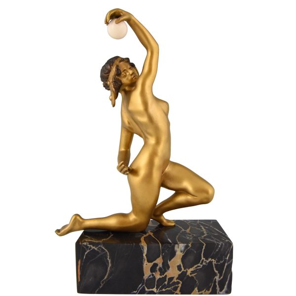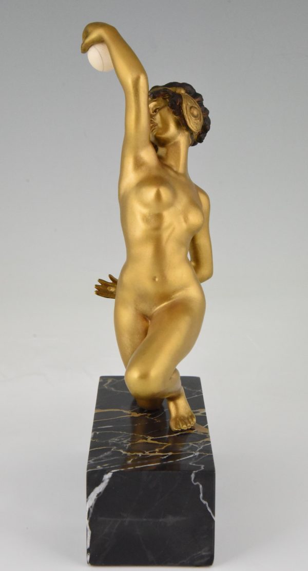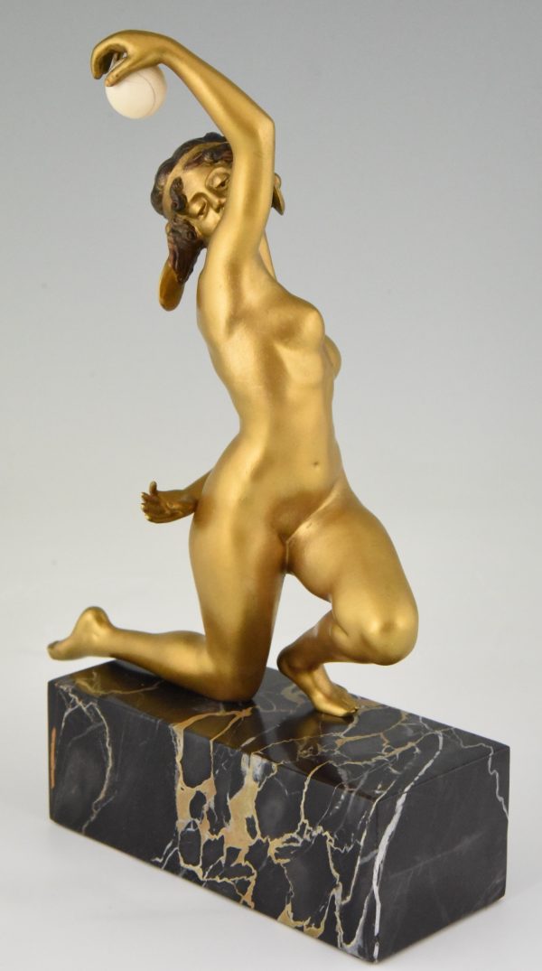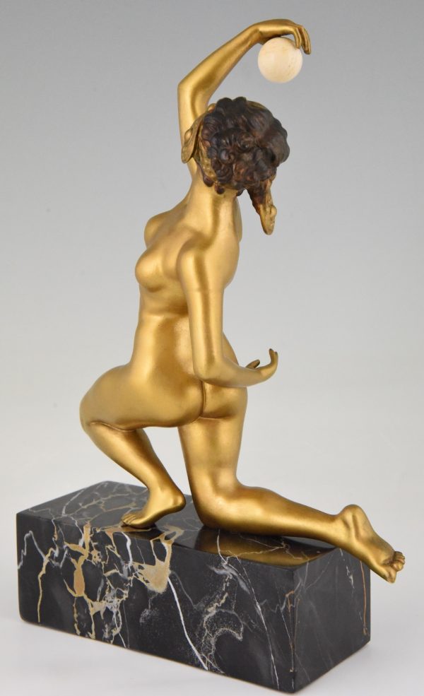 Art Deco bronze sculpture of a kneeling nude juggling with a ball. The bronze has a golden patina and is signed by the French/Italian artist Affortunato Gory.