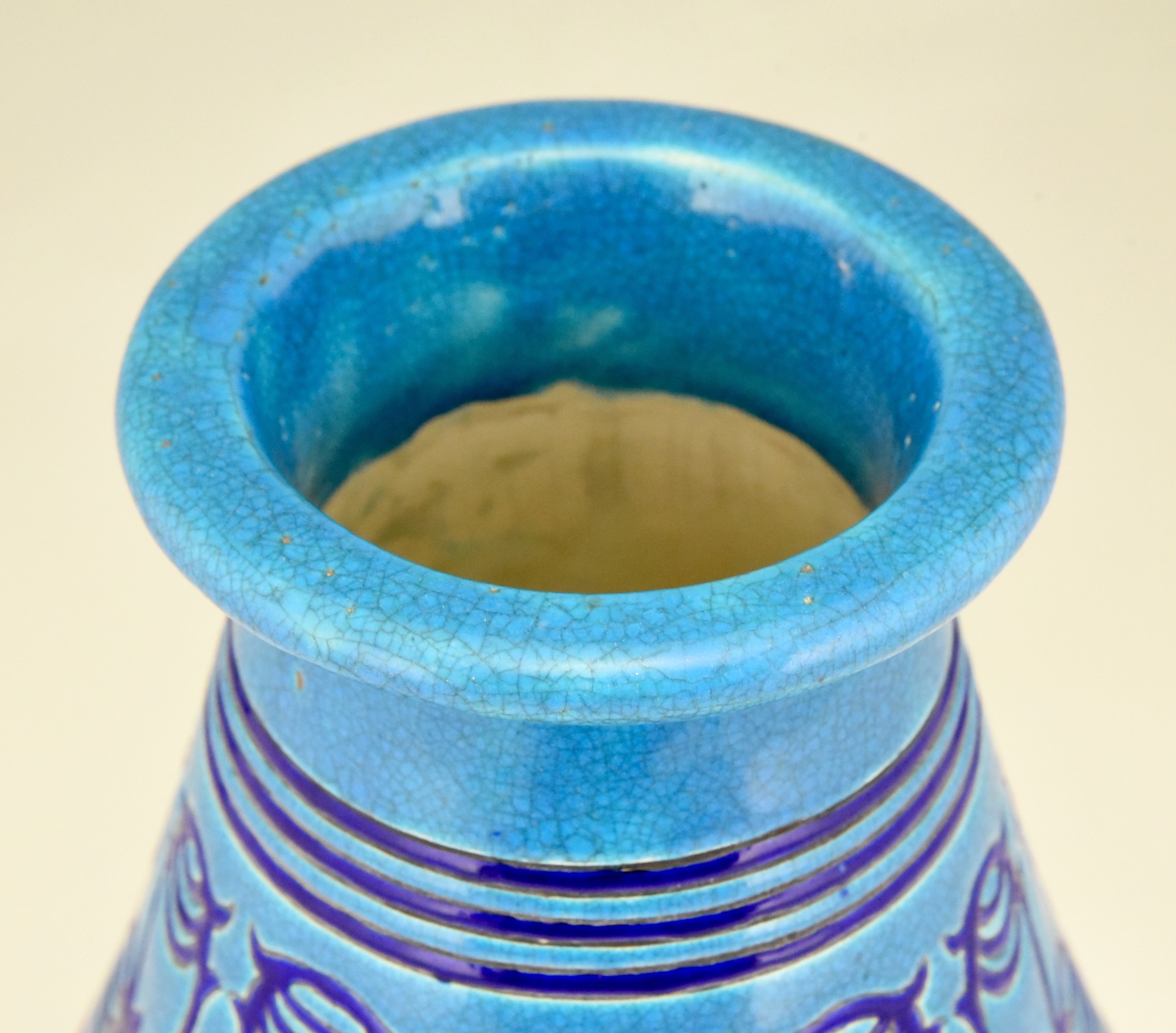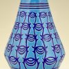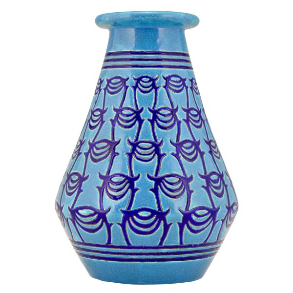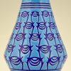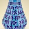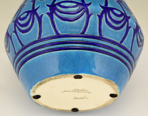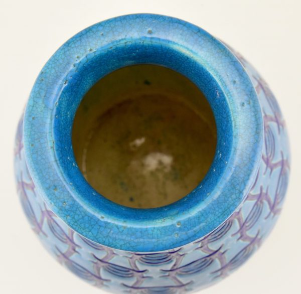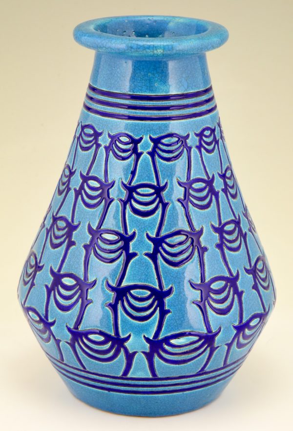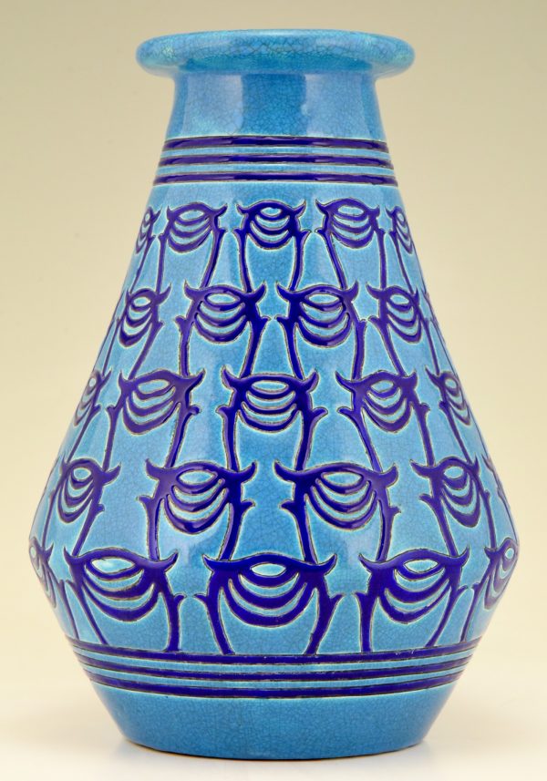 Longwy Primavera Art Deco ceramic vase in turquoise blue with dark blue pattern. France 1925.