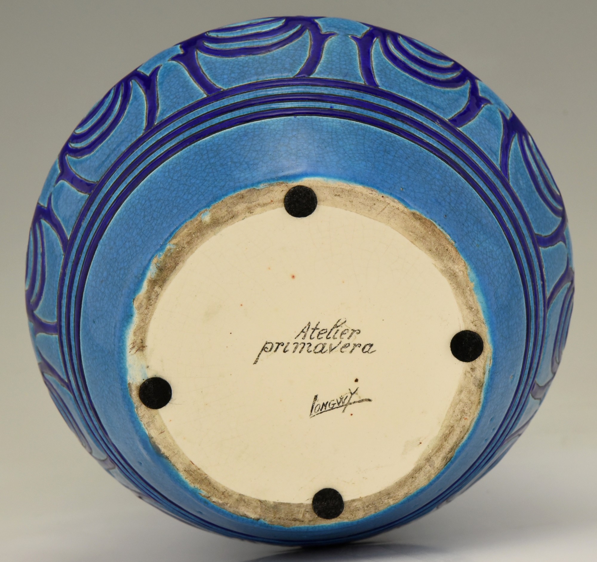 This French Art Deco vase was made by Longwy for Atelier Primavera, the design studio of the Paris department store “Les Grands Magasins du Printemps”.