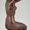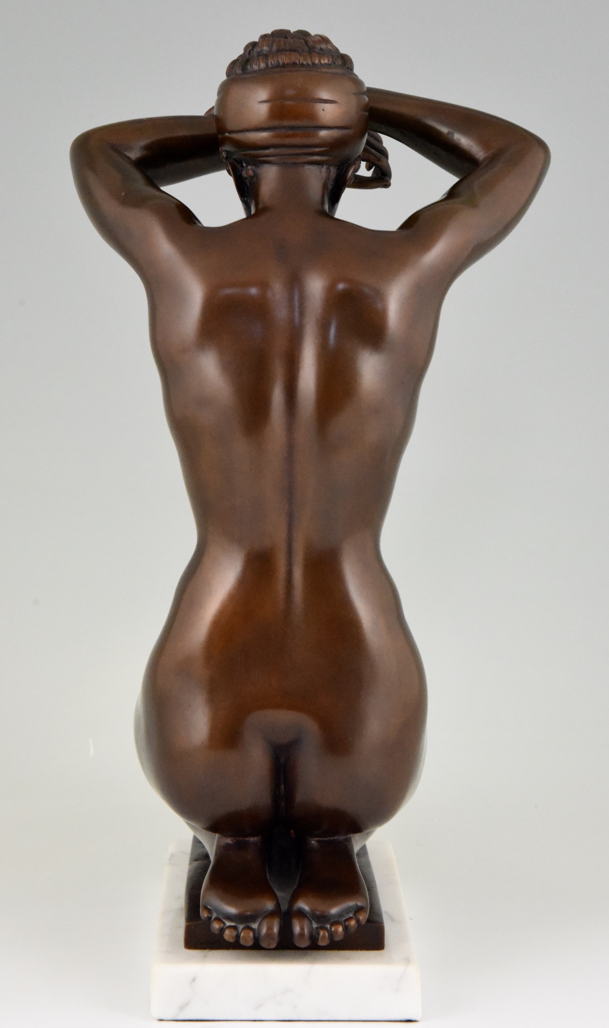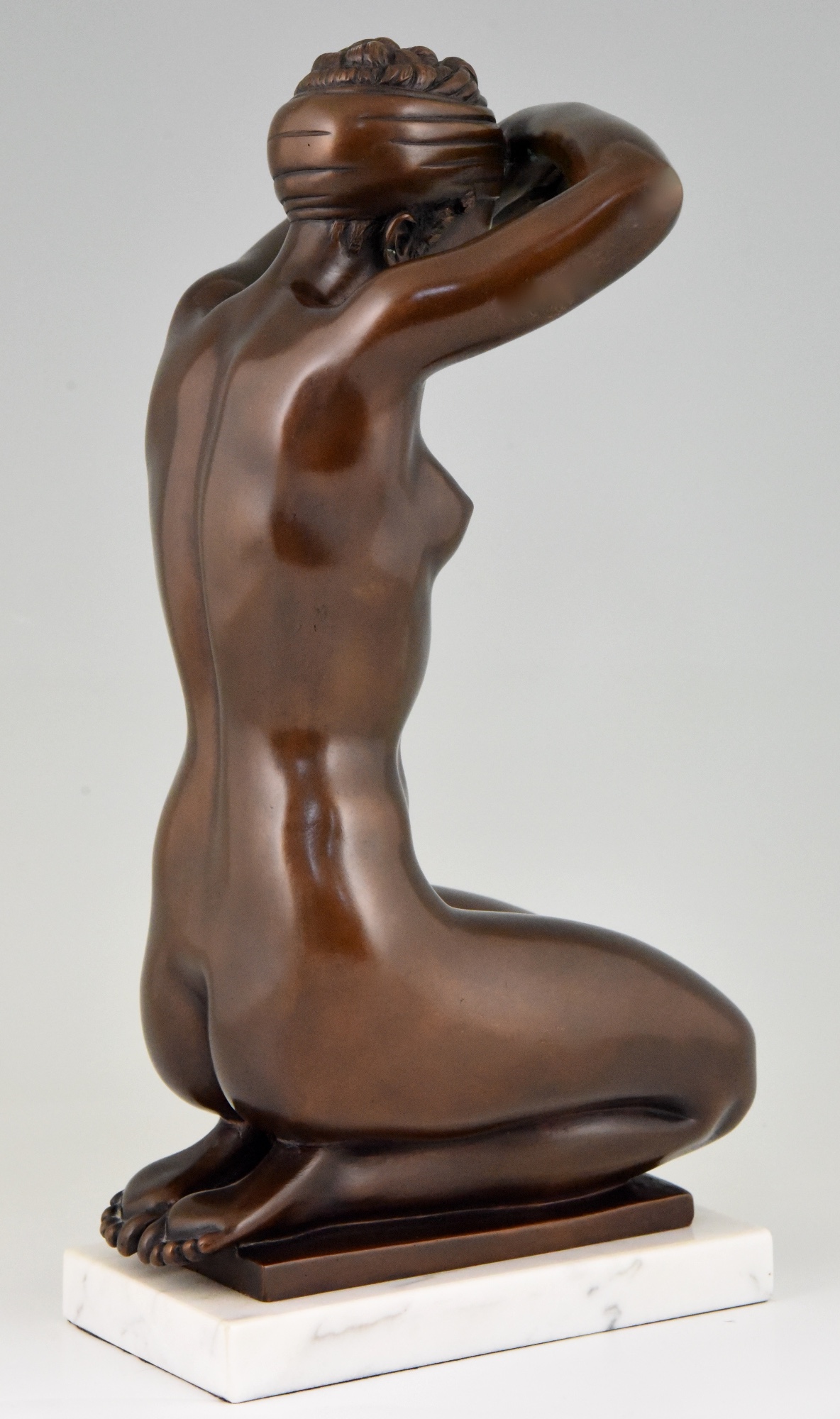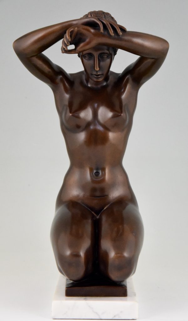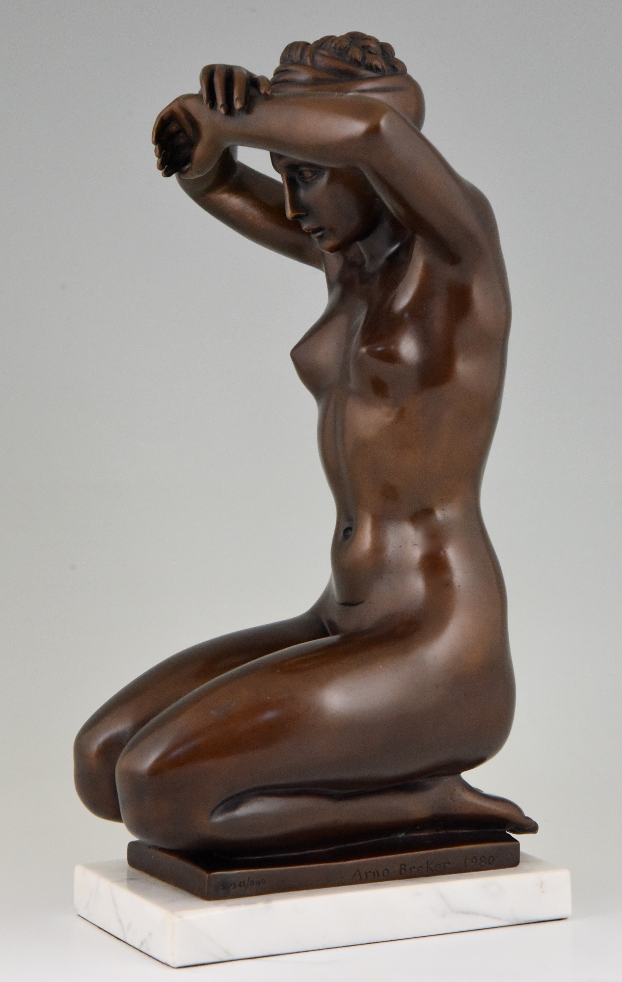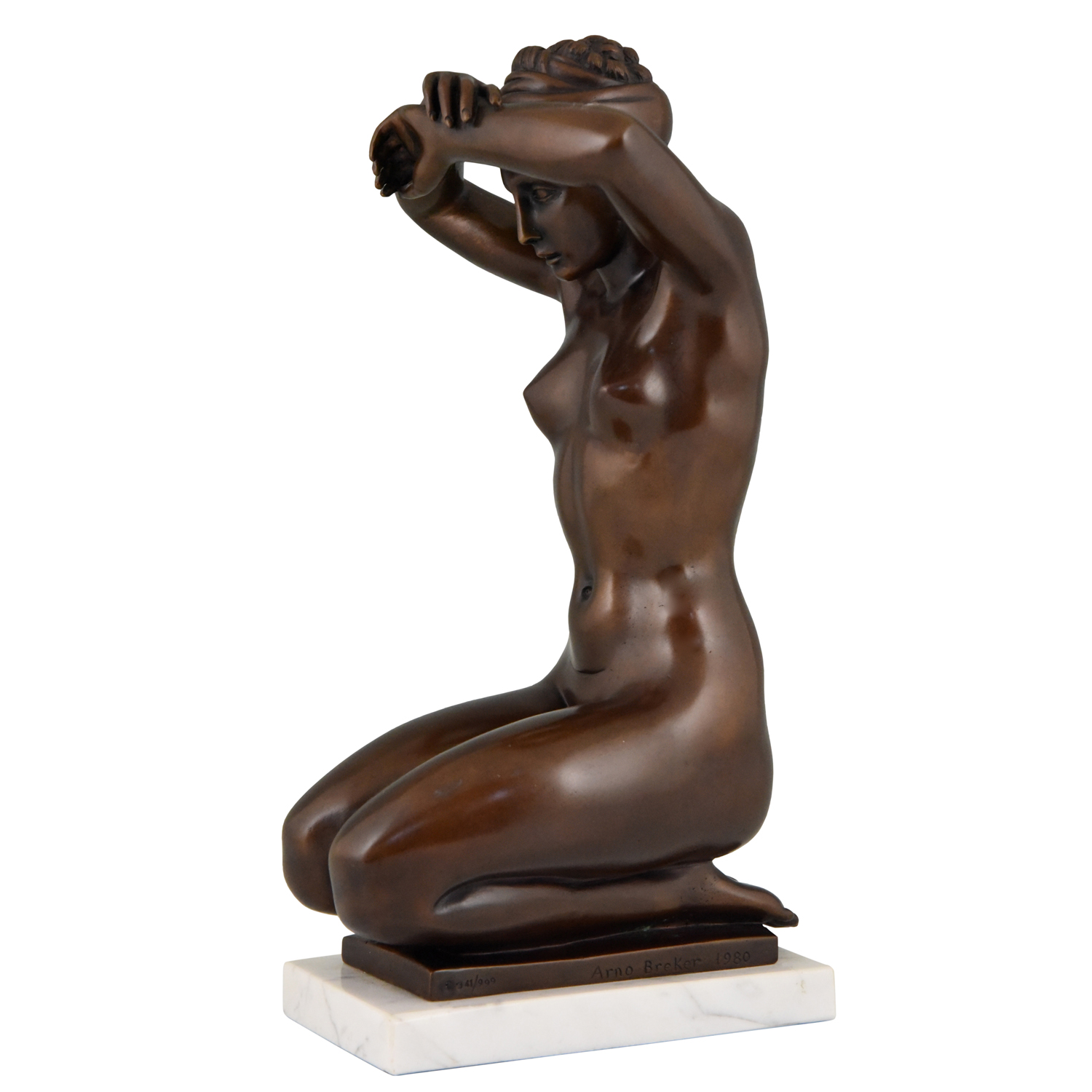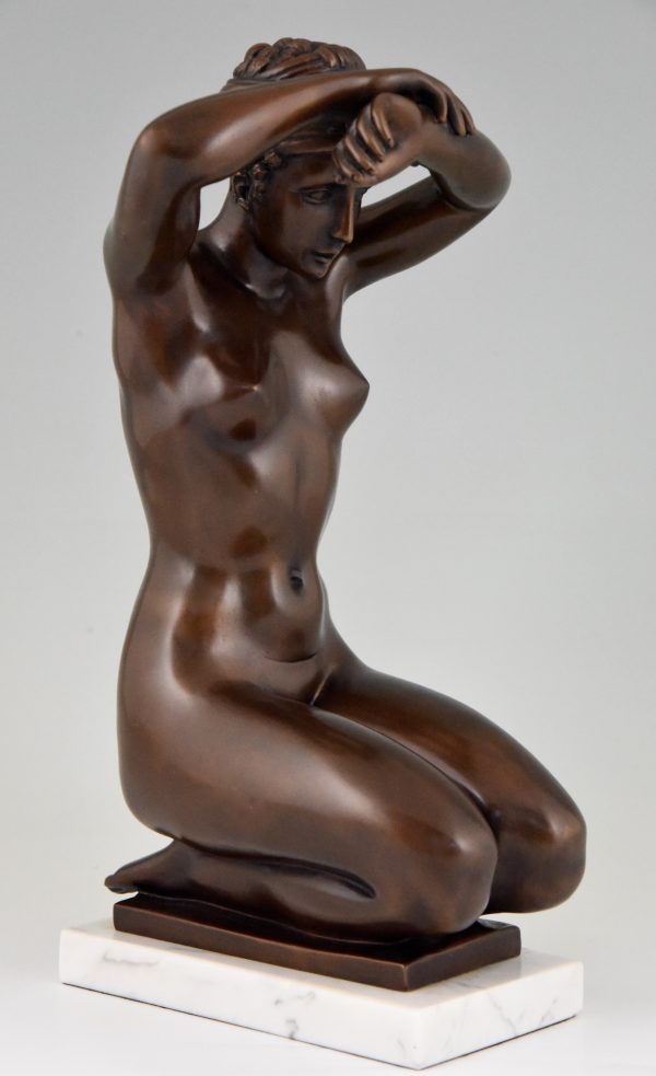 Elegant bronze sculpture of a kneeling nude by Arno Breker Germany 1980. Lovely brown patina, on a white marble base.