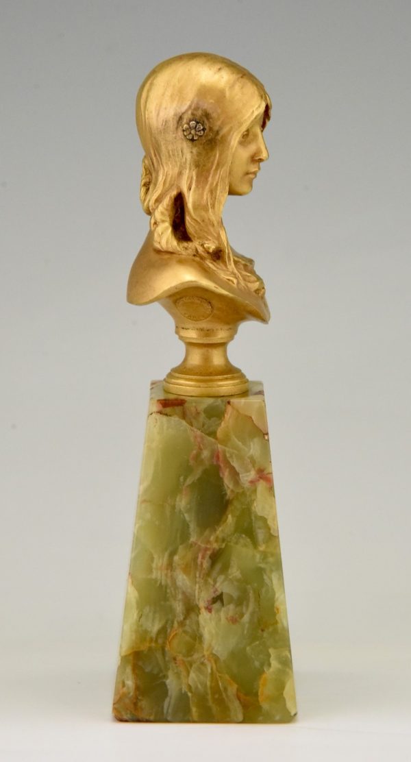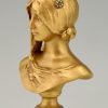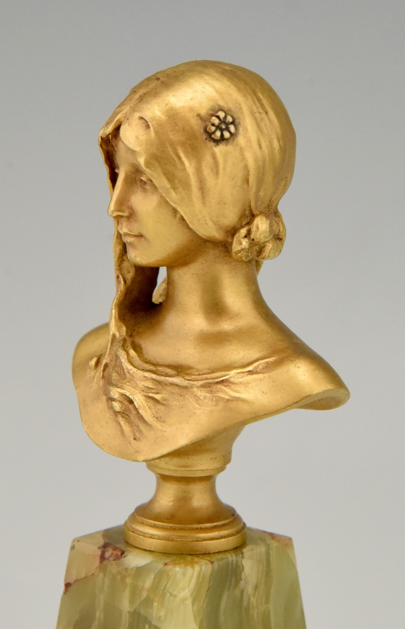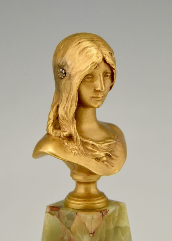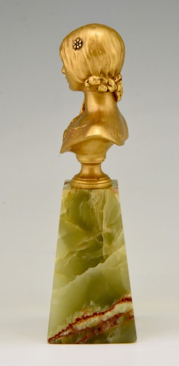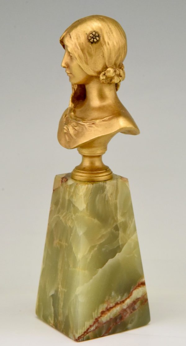 Lovely gilt bronze bust of a young woman with flower in her hair.