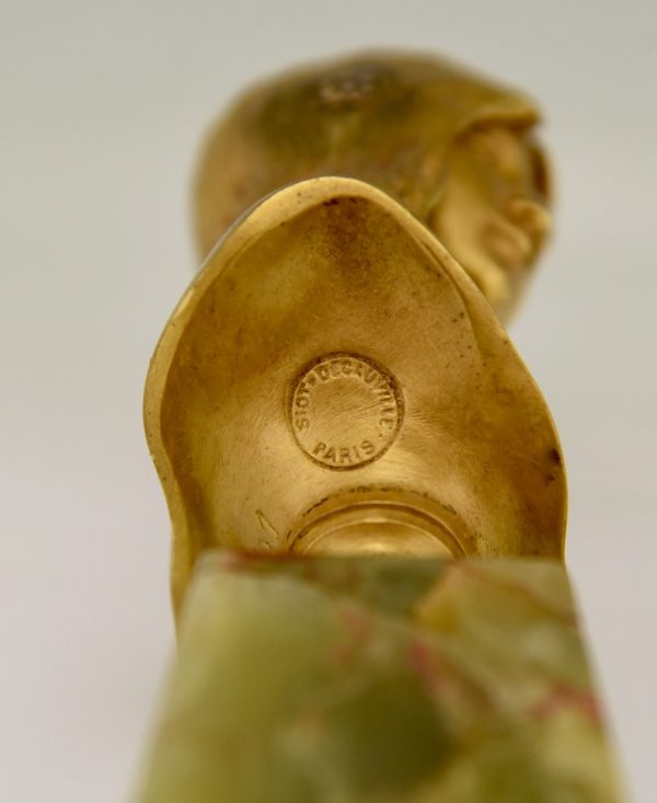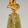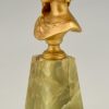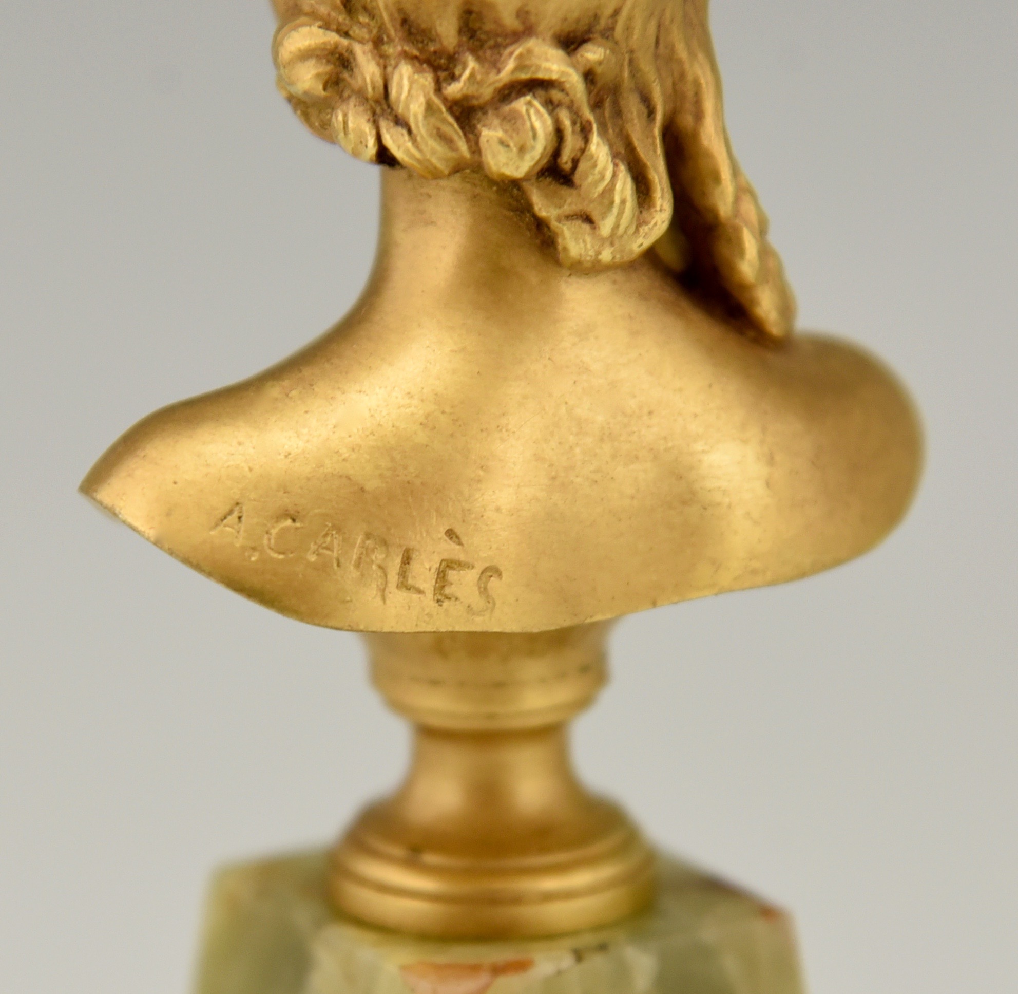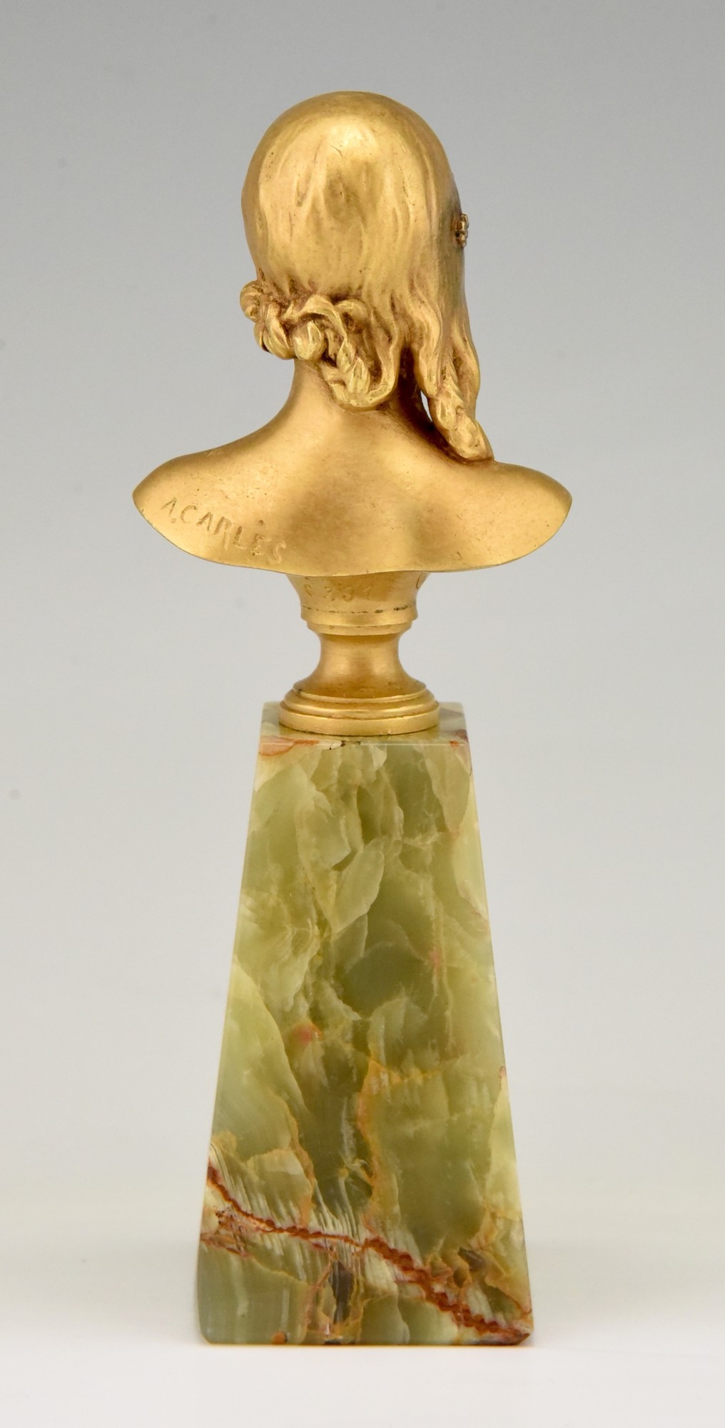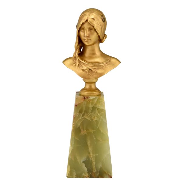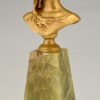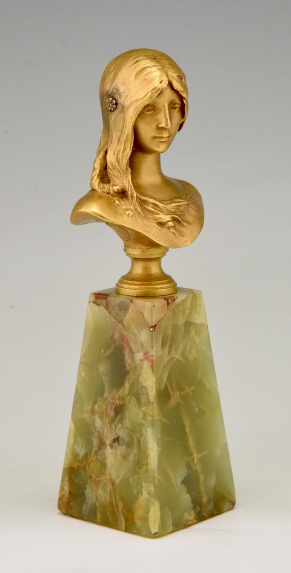 Lovely gilt bronze bust of a young woman with flower in her hair.