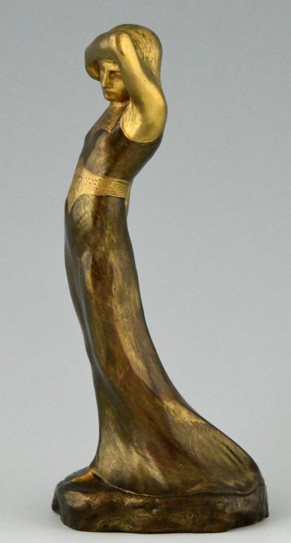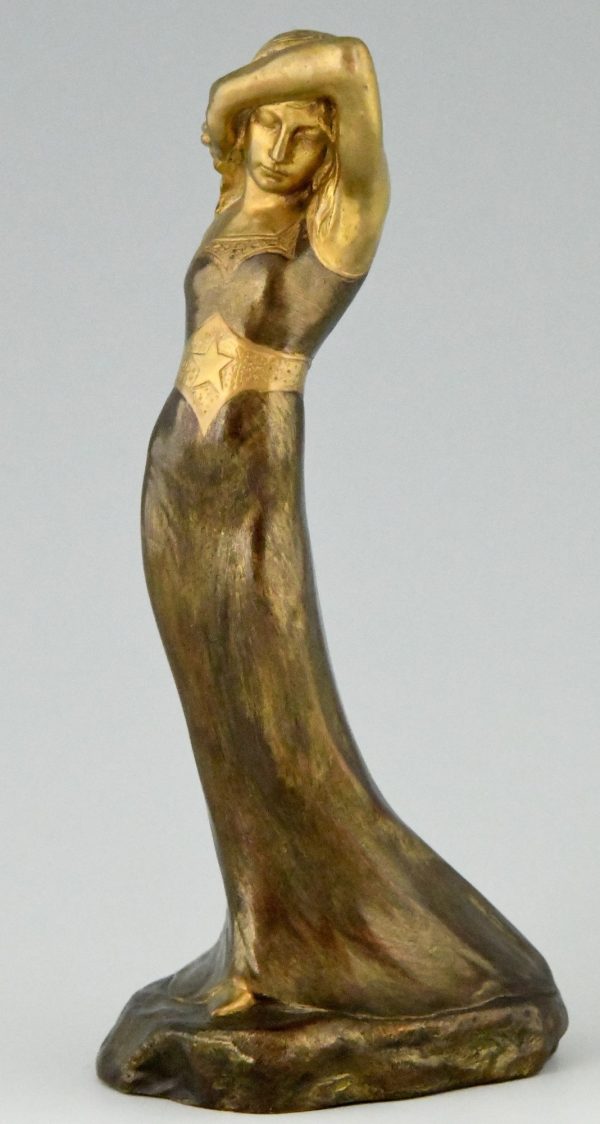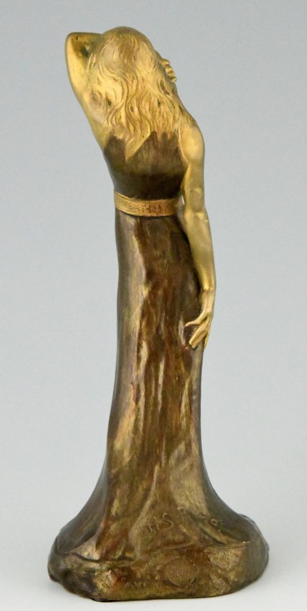 Fine Art Nouveau bronze sculpture of a Sarah Bernhardt, standing lady in a long dress by the artist Harald Sorensen Ringi. The sculpture has a lovely multi color patina and has been cast by Louchet Paris in 1899.