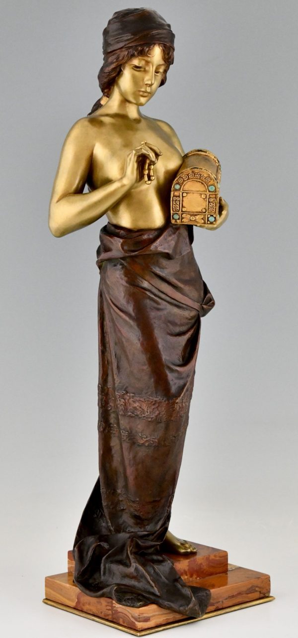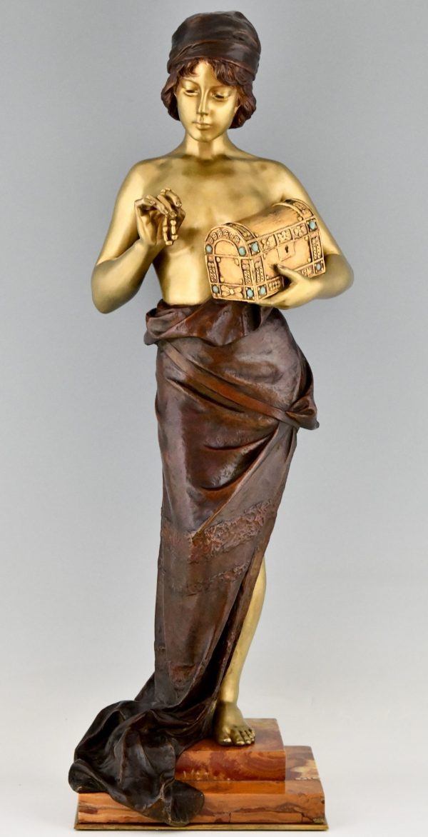 Art Nouveau bronze sculpture of a semi nude lady holding a jewelry casket by Emmanuel Villanis. impressive size.