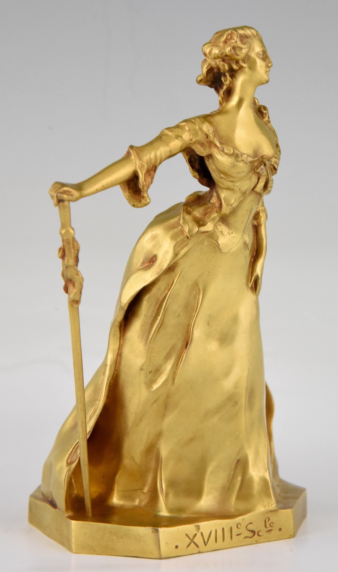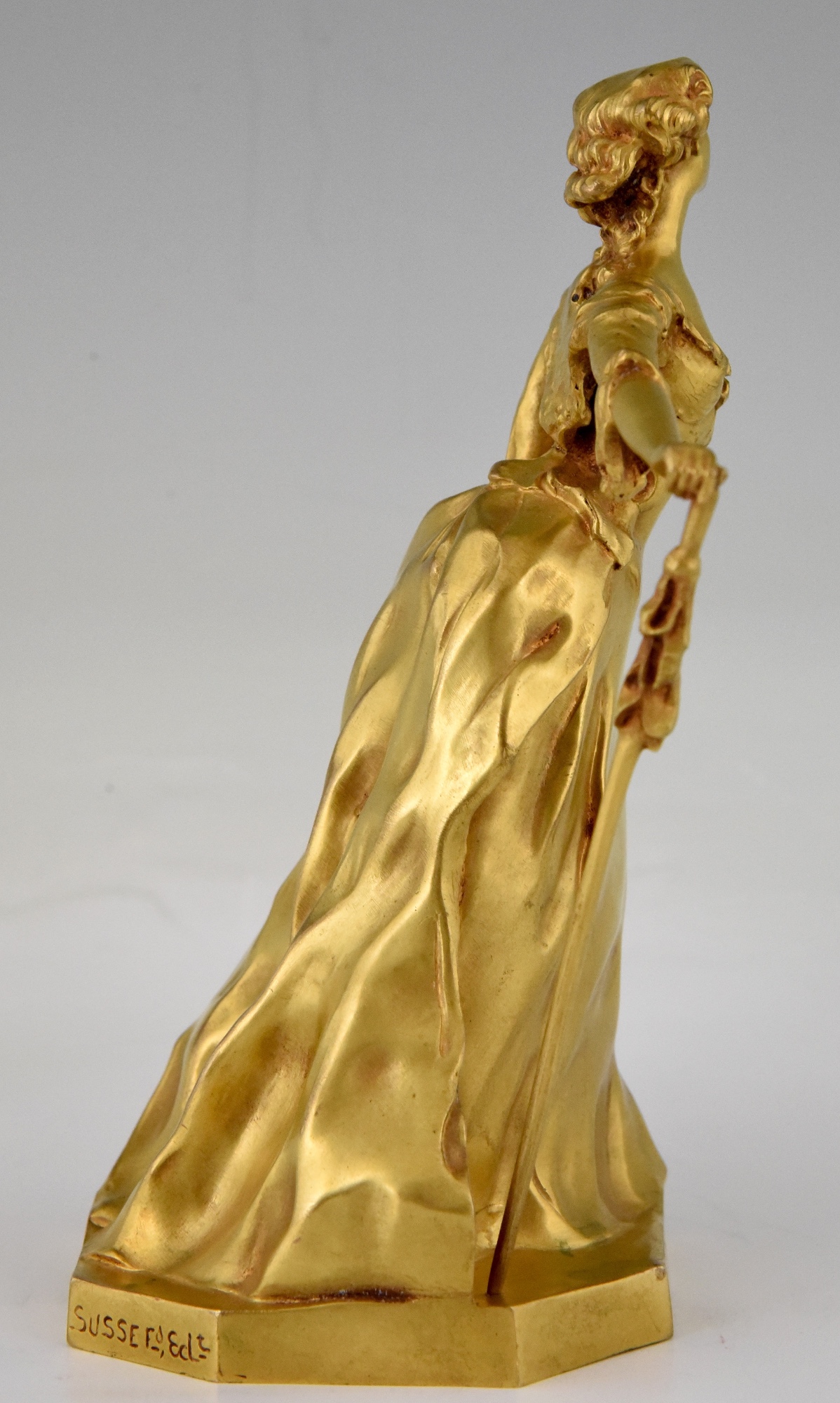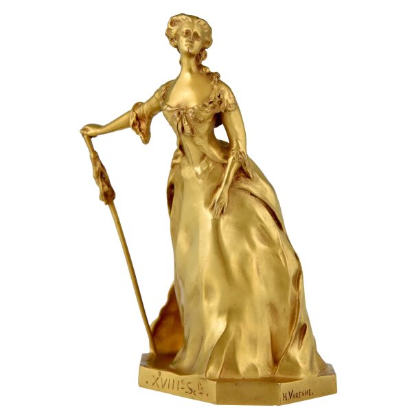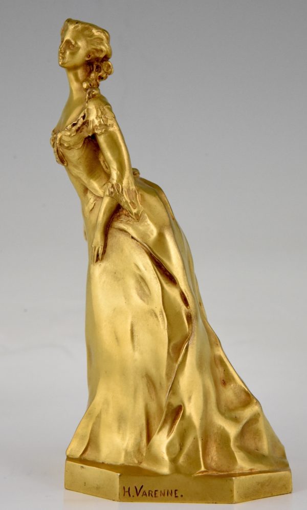 Art Nouveau gilt bronze sculpture of an elegant woman entitled Parisienne of the 18th century. This beautiful bronze is signed by Henri Frederic Varenne and bears the Susse Freres foundry mark, cast in France ca. 1900.