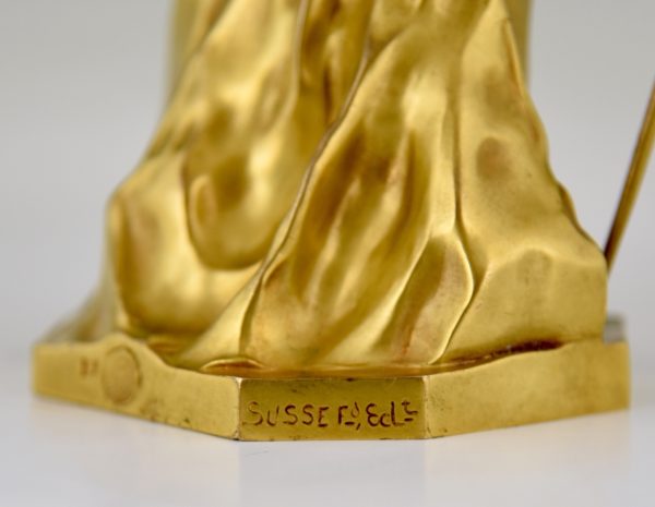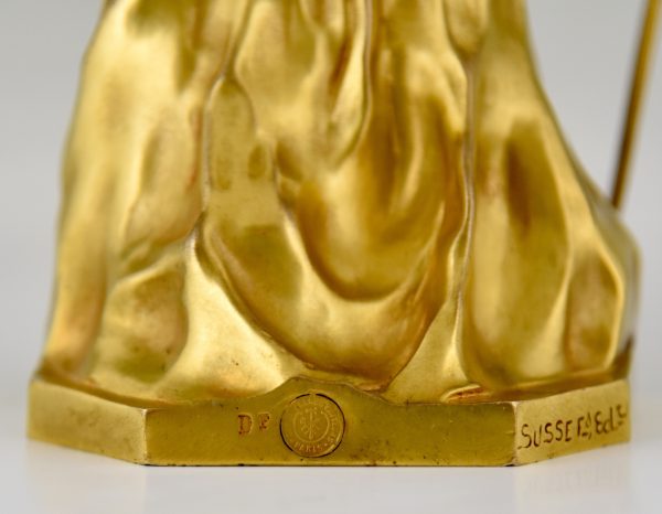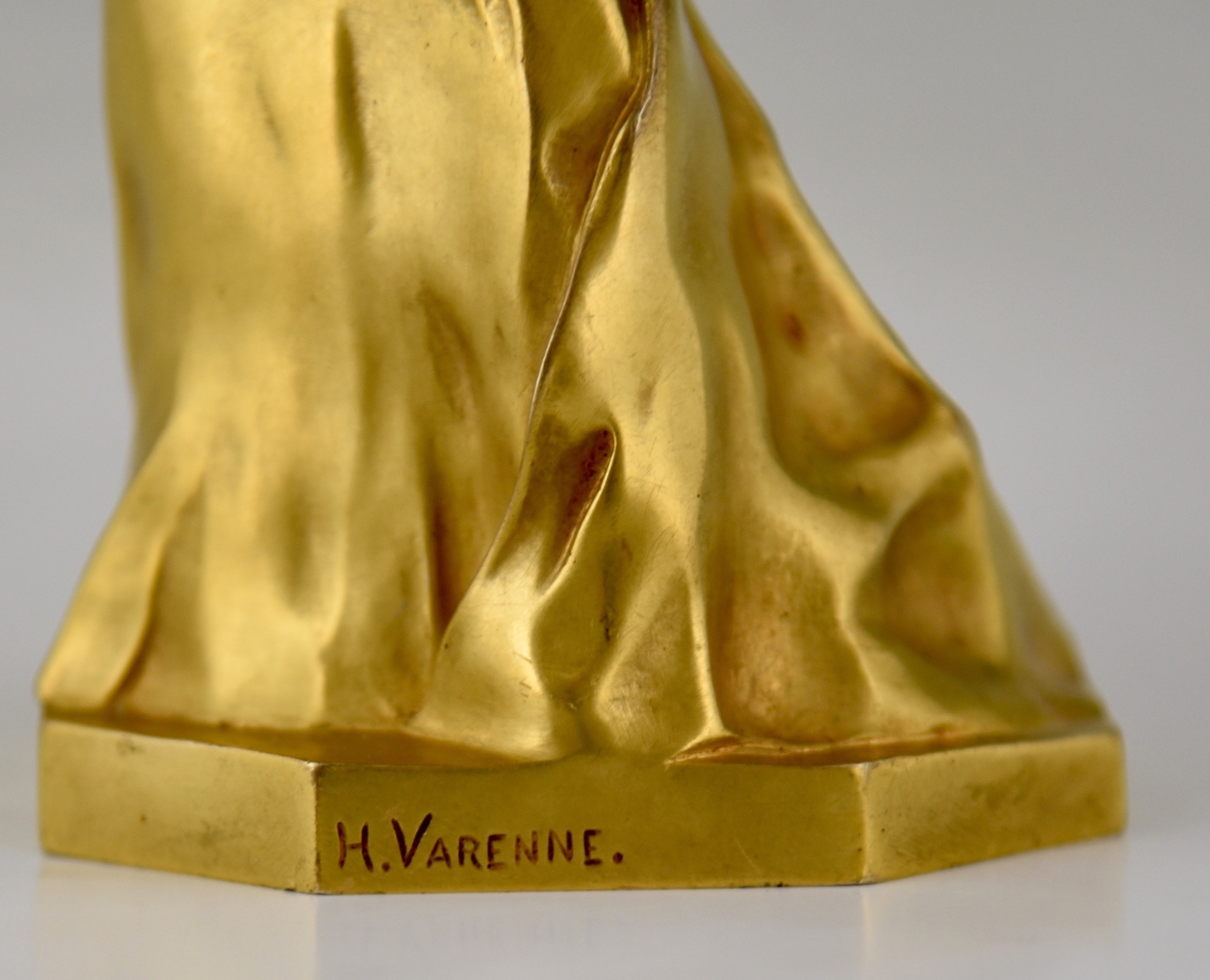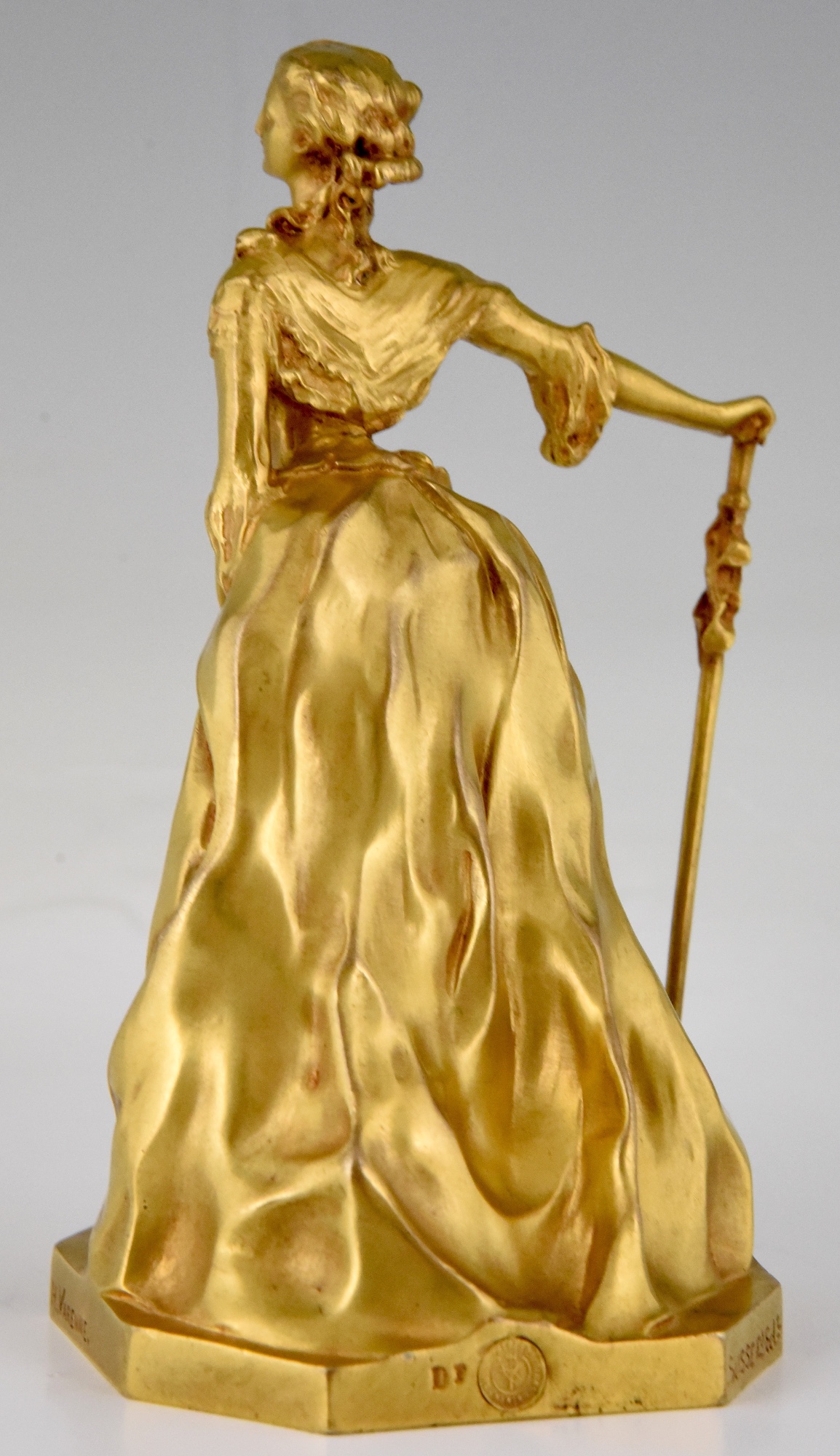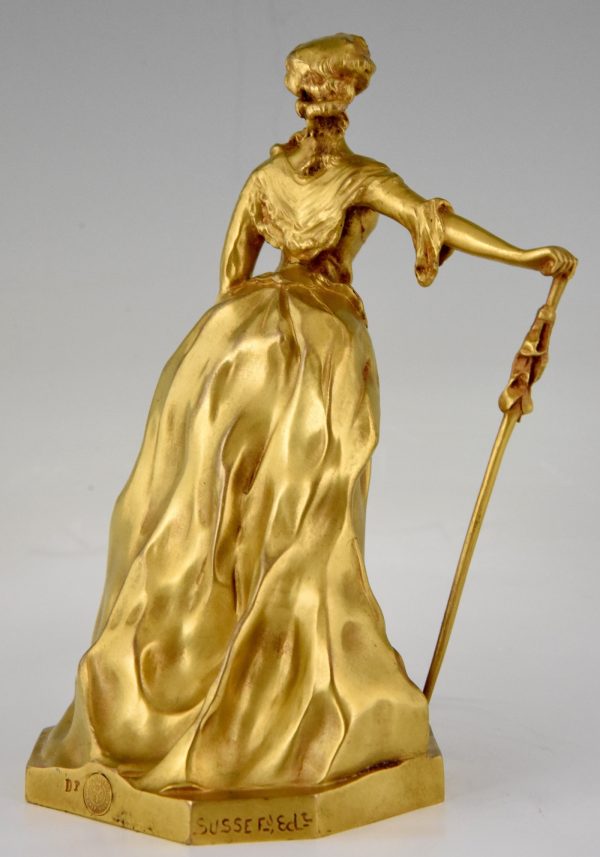 Art Nouveau gilt bronze sculpture of an elegant woman entitled Parisienne of the 18th century. This beautiful bronze is signed by Henri Frederic Varenne and bears the Susse Freres foundry mark, cast in France ca. 1900.