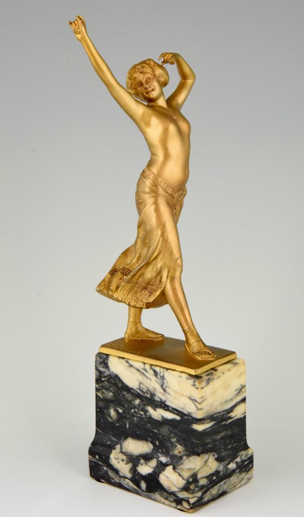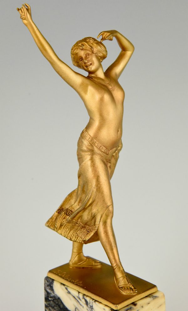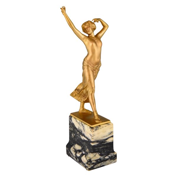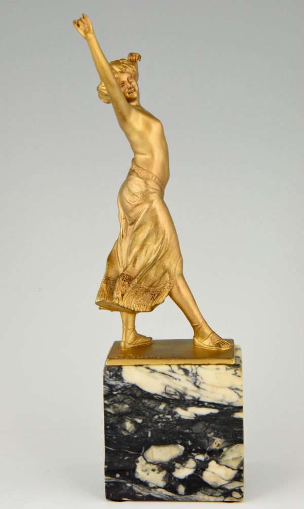 Art Nouveau gilt bronze sculpture of a semi-nude harem dancer with castanets, wearing long skirt and sandals on a marble base, signed by Franz Peleschka.