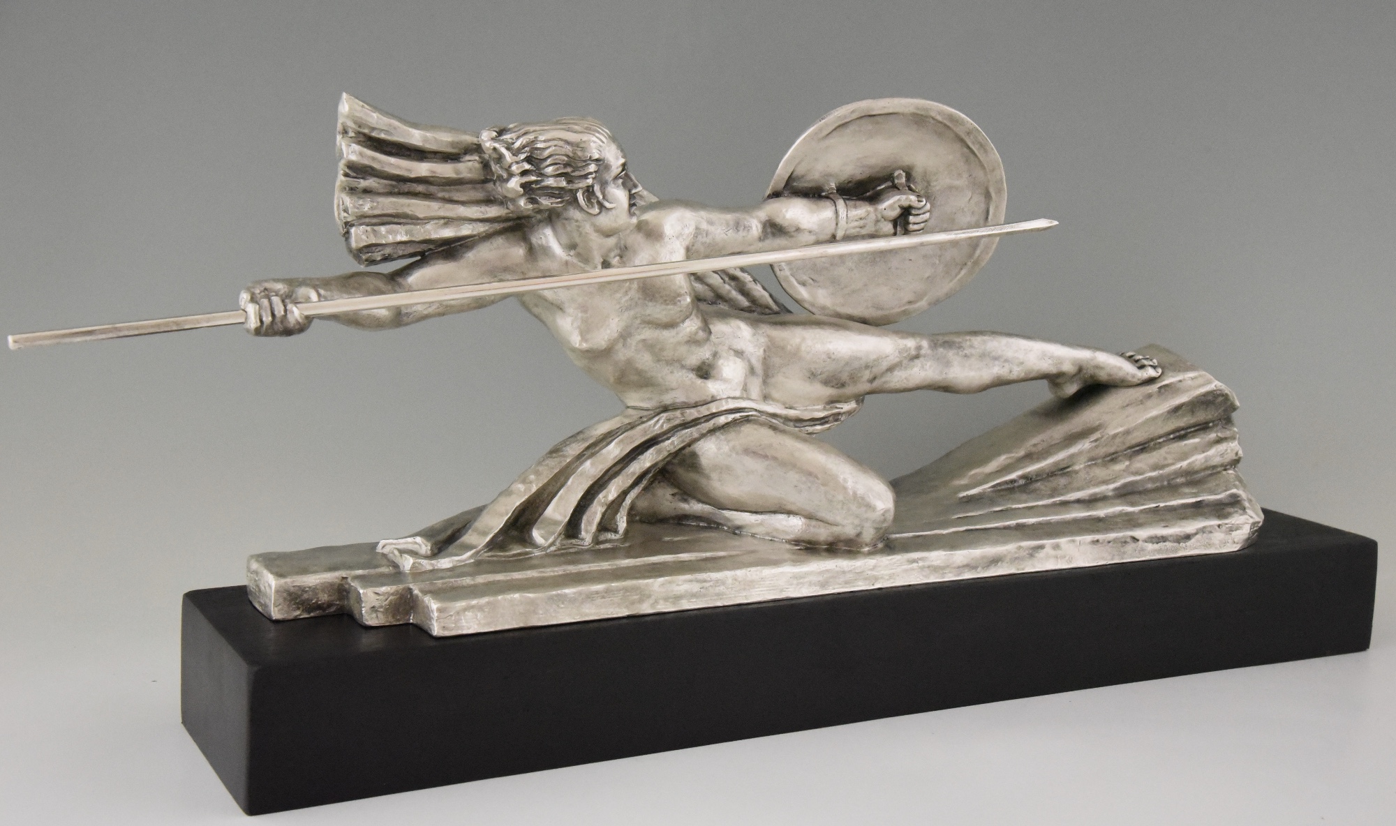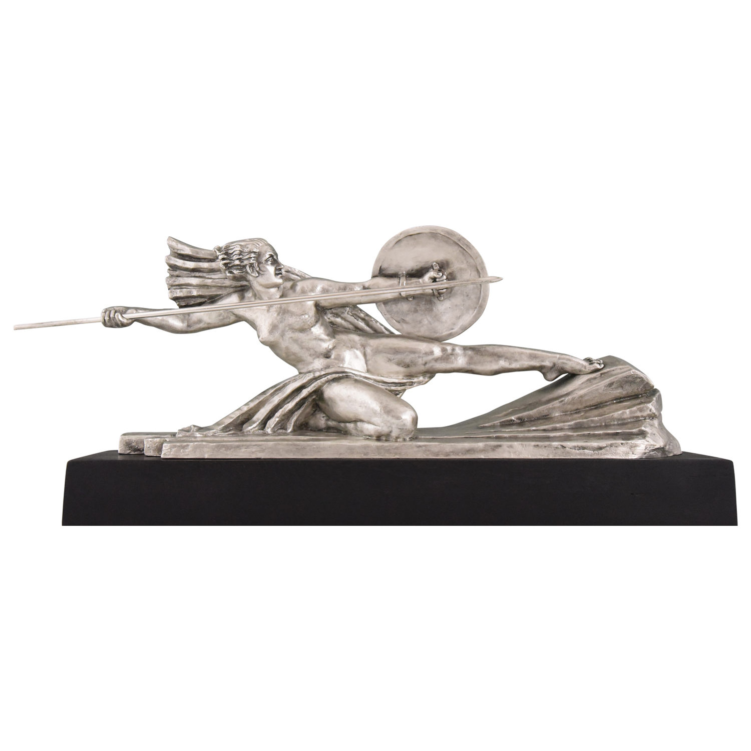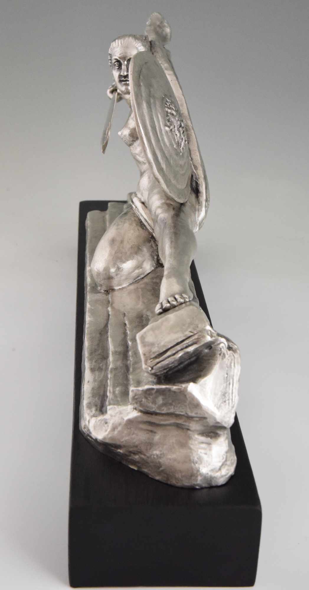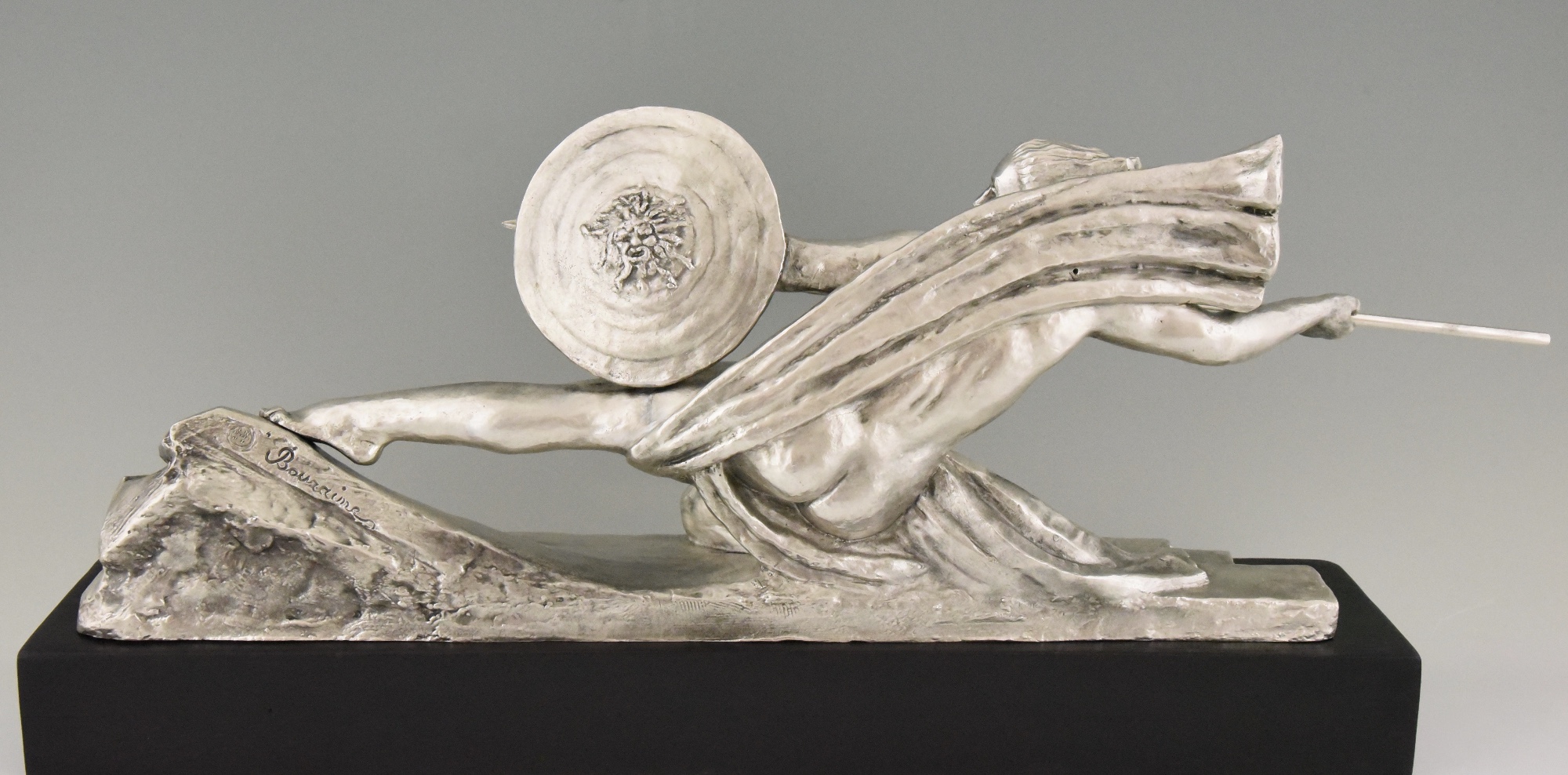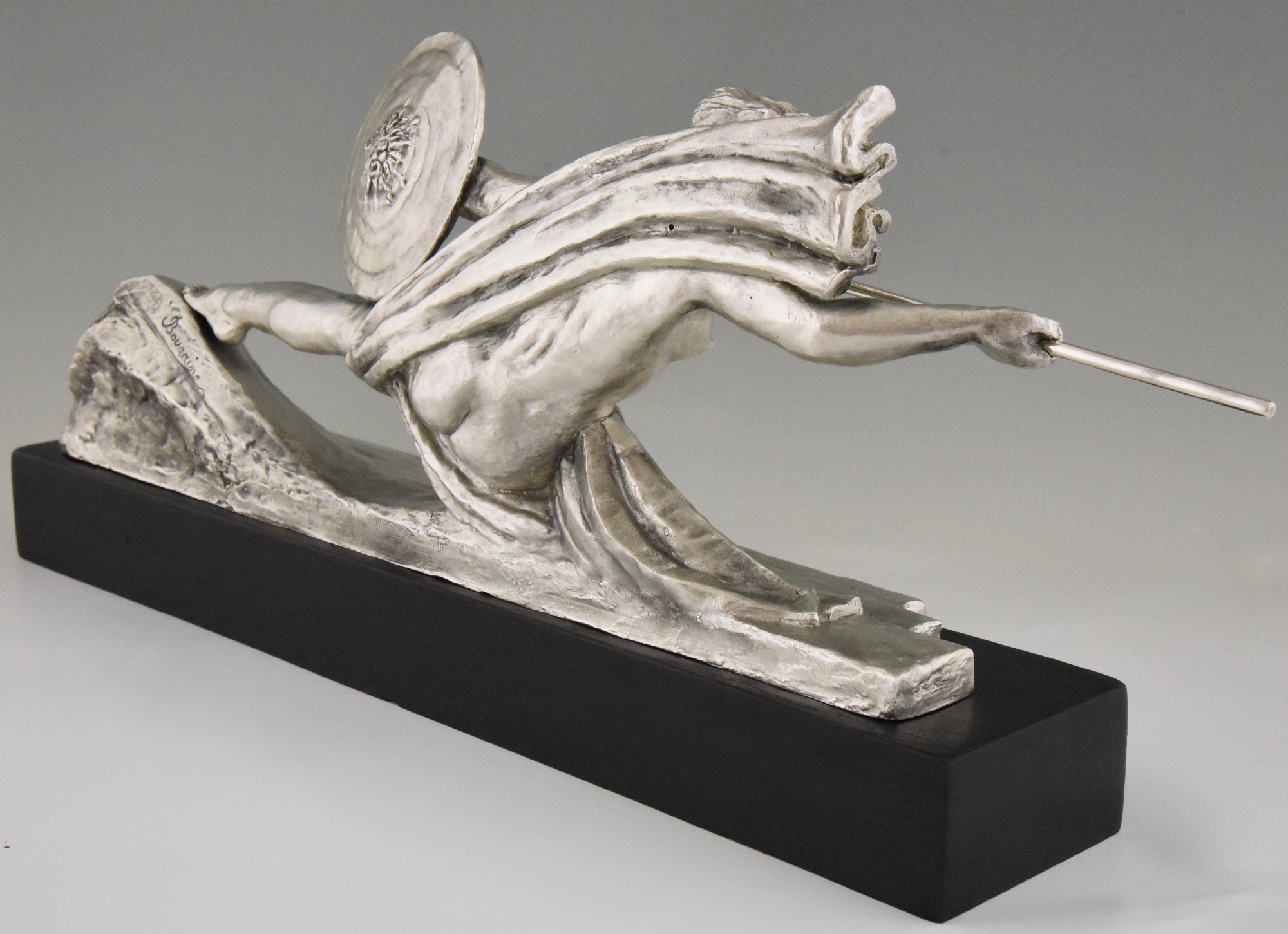 Amazone, Impressive Art Deco silvered bronze sculpture of a female nude warrior with spear and shield on a black woorden base. The sculpture is signed by Marcel André Bouraine and has the "Les Neveux de Lehman" foundry seal.