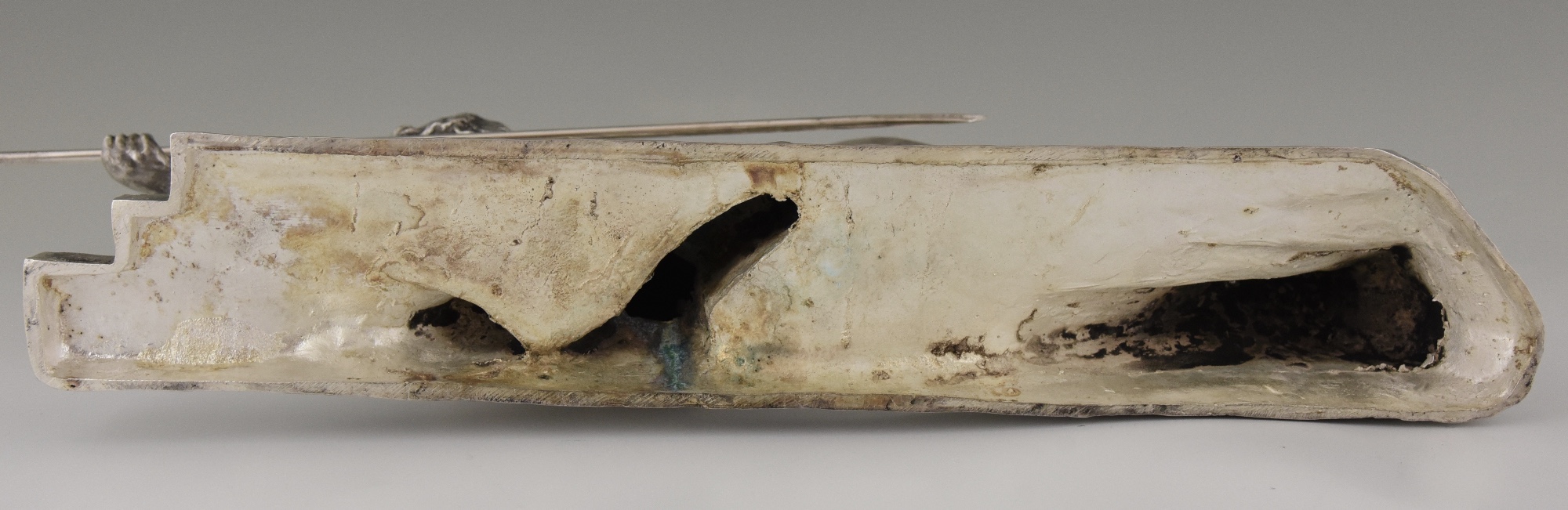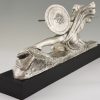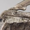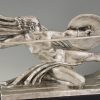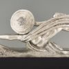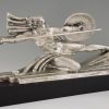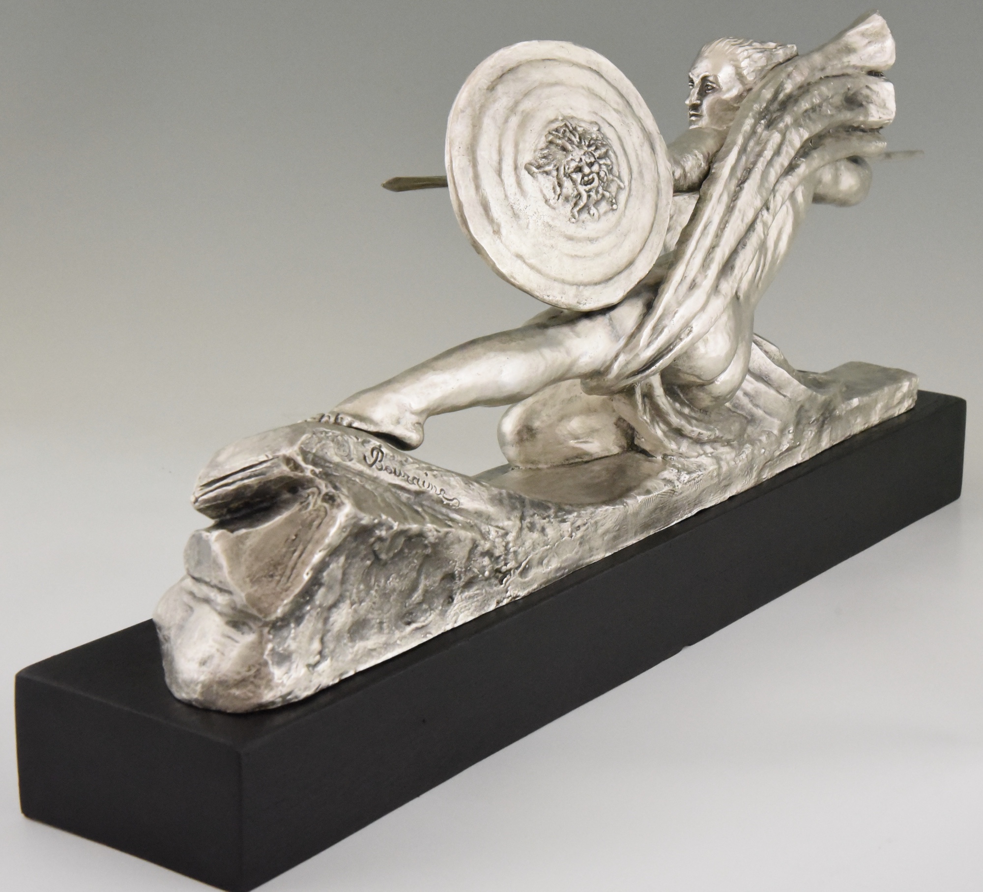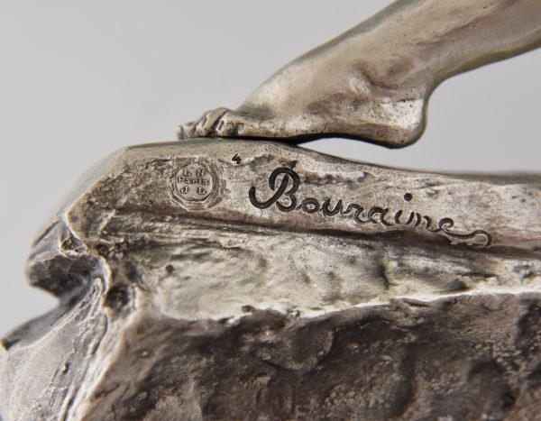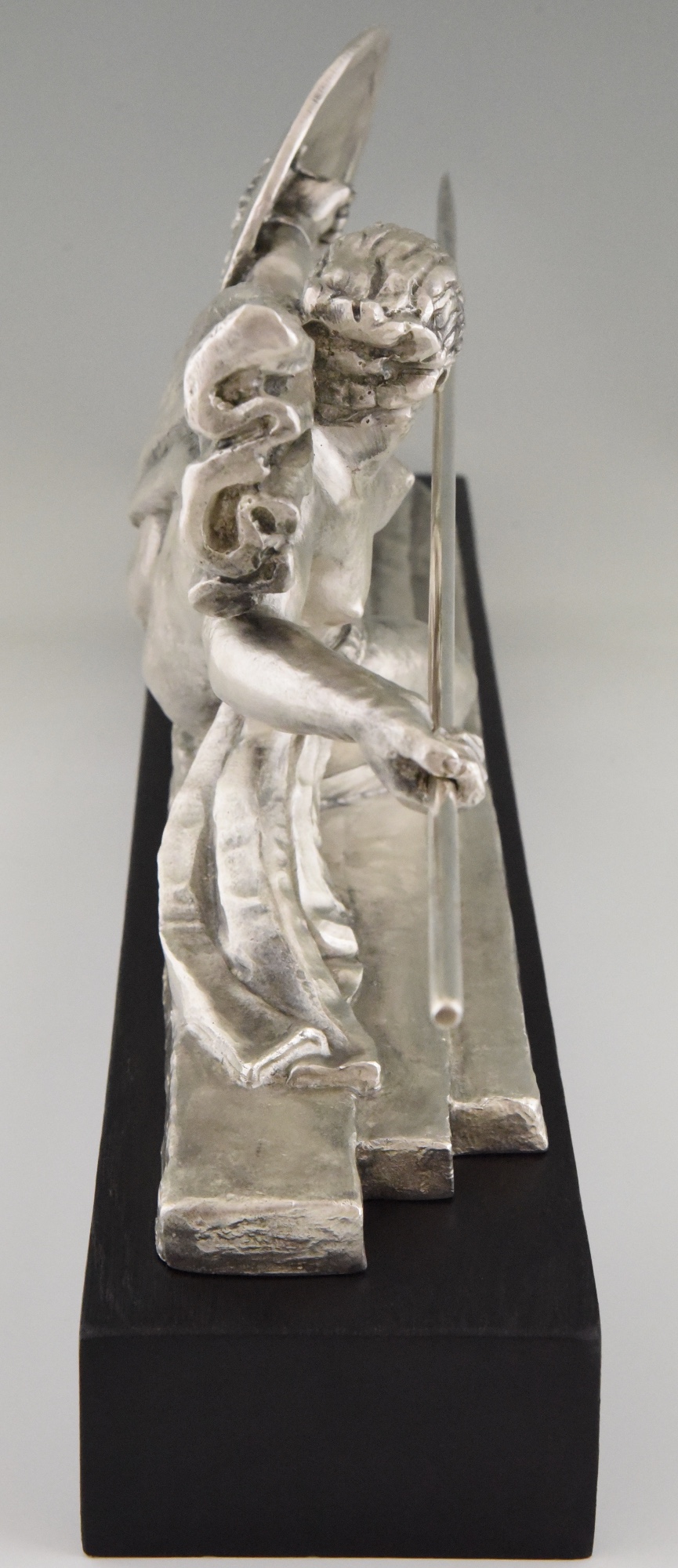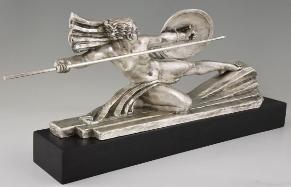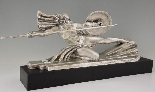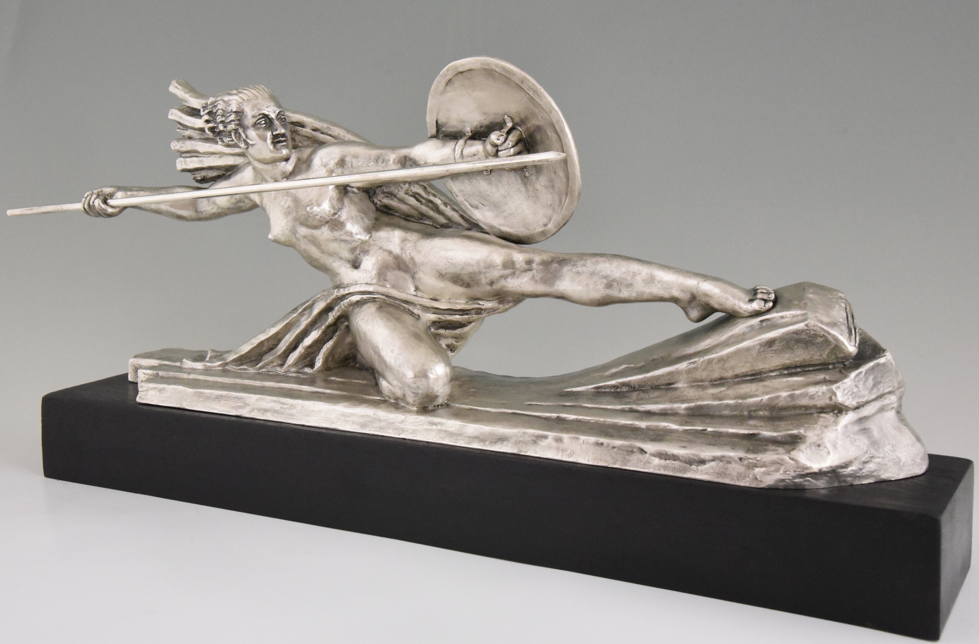 Amazone, Impressive Art Deco silvered bronze sculpture of a female nude warrior with spear and shield on a black woorden base. The sculpture is signed by Marcel André Bouraine and has the "Les Neveux de Lehman" foundry seal.
