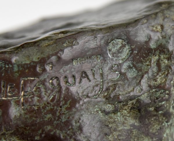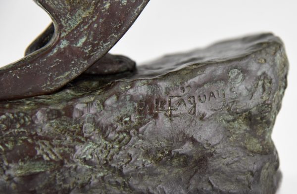 Art Deco bronze sculpture of a male nude athlete pushing a wheel. Signed by the French artist Pierre Le Faguays. The bronze statue has a bronw patina with lighter shades. Stamped with foundry seal Les Neveux de Lehmann. Ca. 1930.