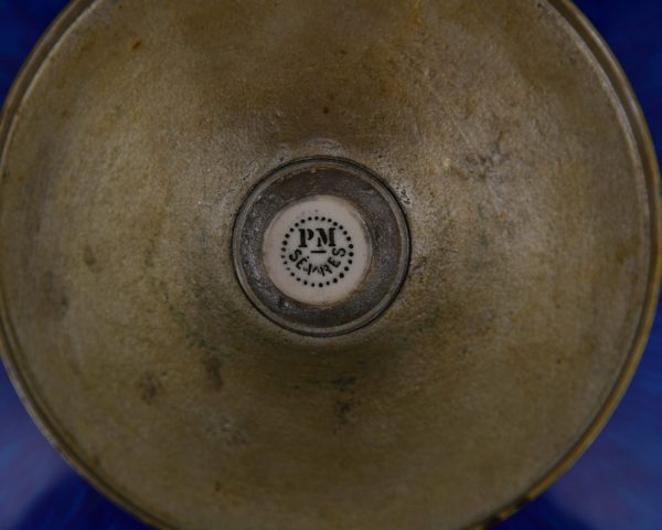 Coupe à fruits Art Déco en céramique bleue et chrome de Paul Milet pour Sèvres. Paul Millet (1870-1950) était le fils d'Optat Milet. Le plat a le logo du cercle en pointillé pour Sèvres. France 1930.