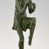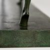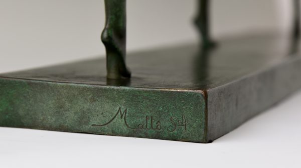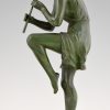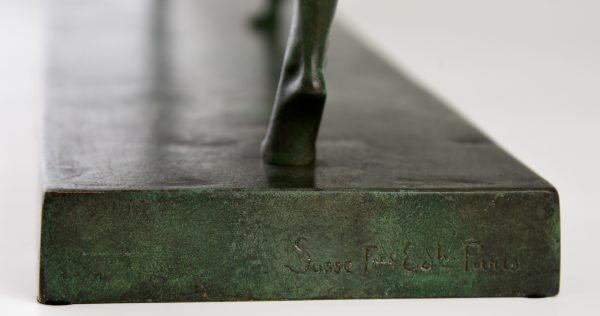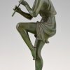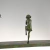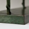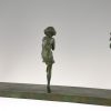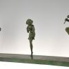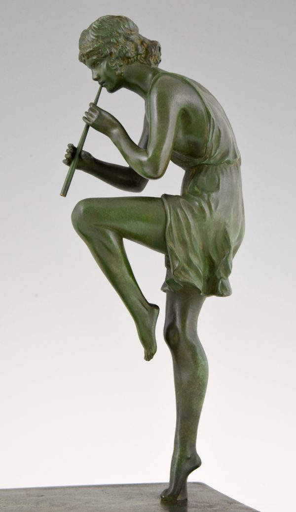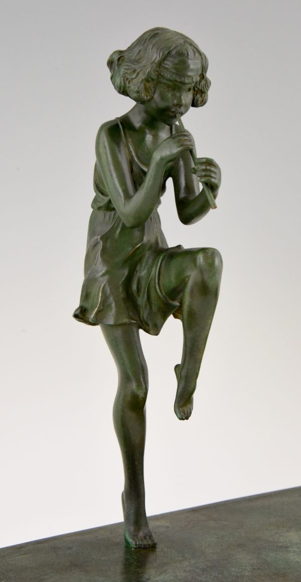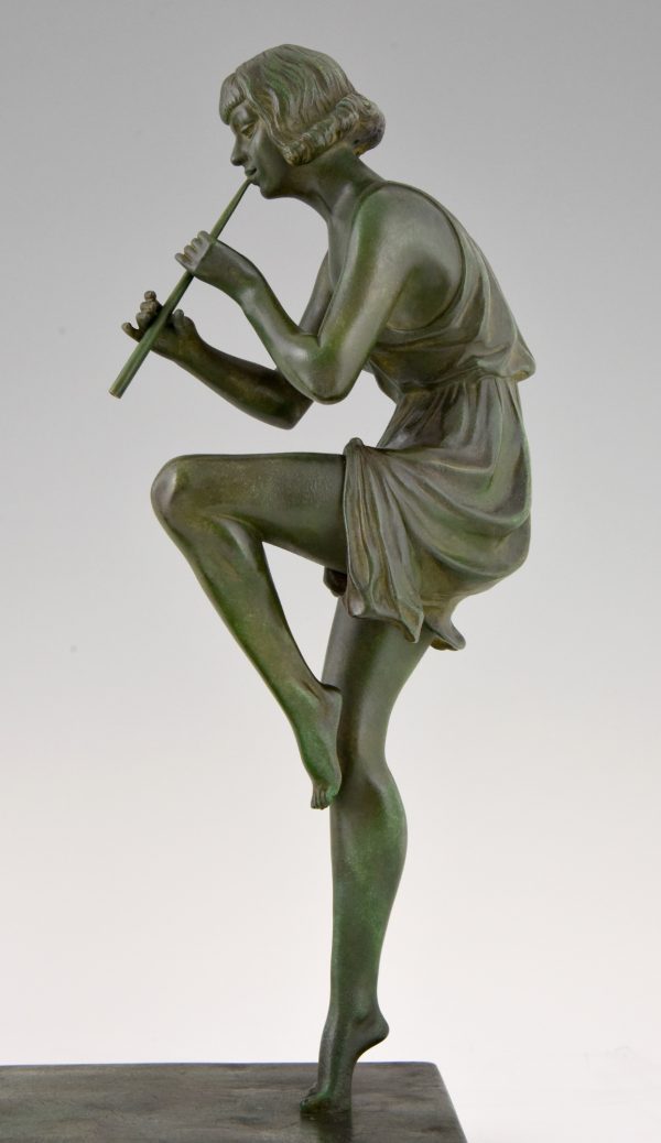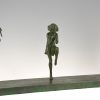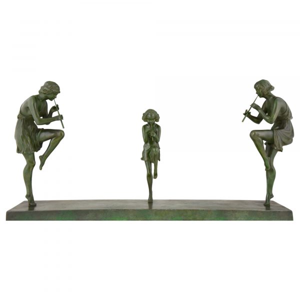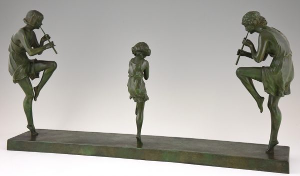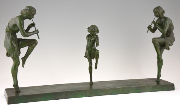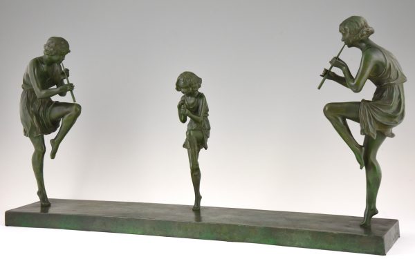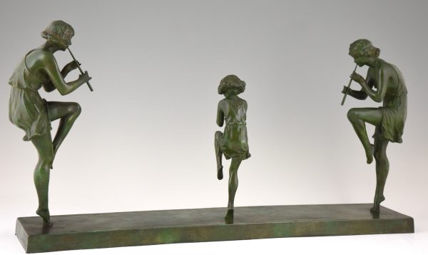 Impressive bronze group of two young women and a young girl, wearing short floaty dresses, each balancing on one leg while playing a flute by Matto, Marcel Bouraine.