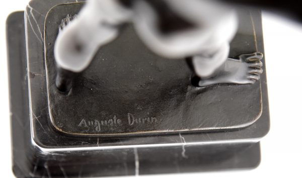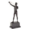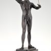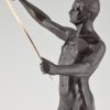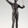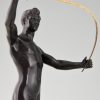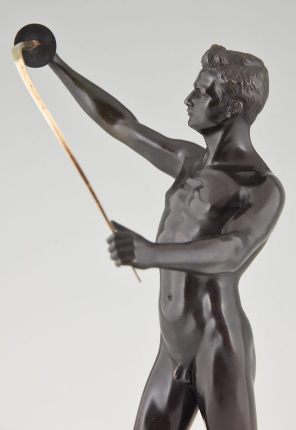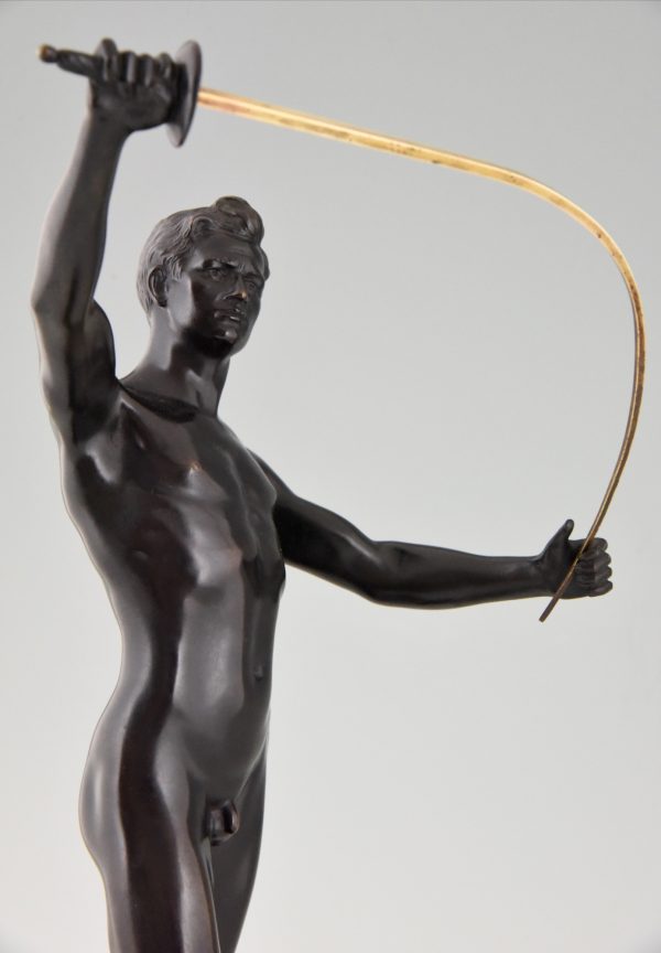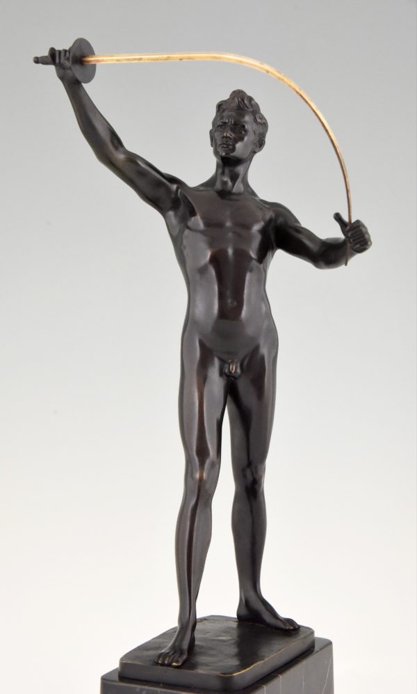 Art Deco sculpture of a standing male nude fencer holding and flexing an épée, on marble plinth.