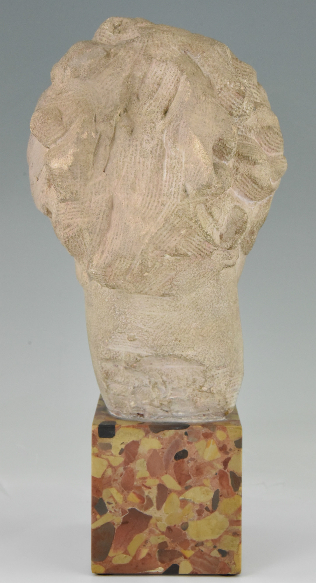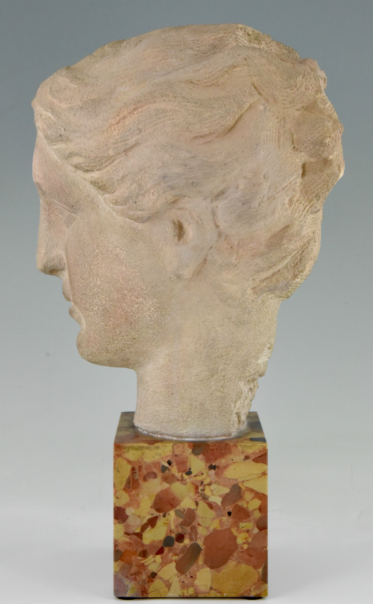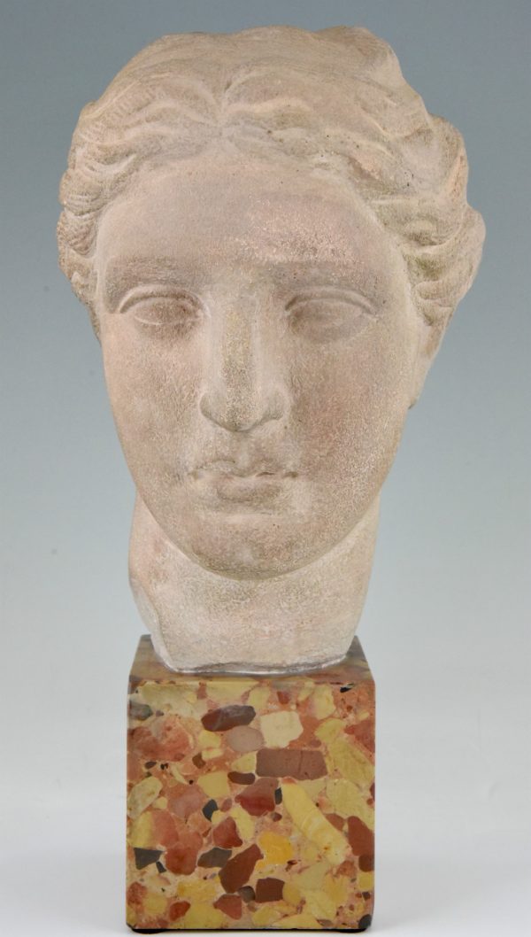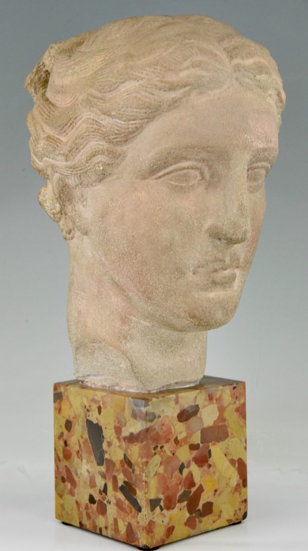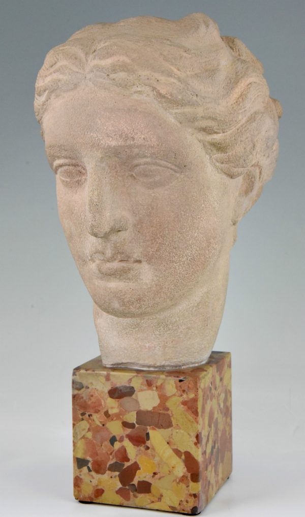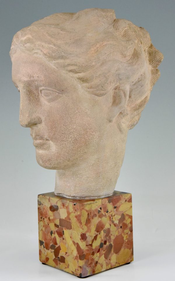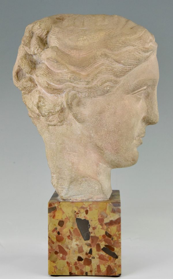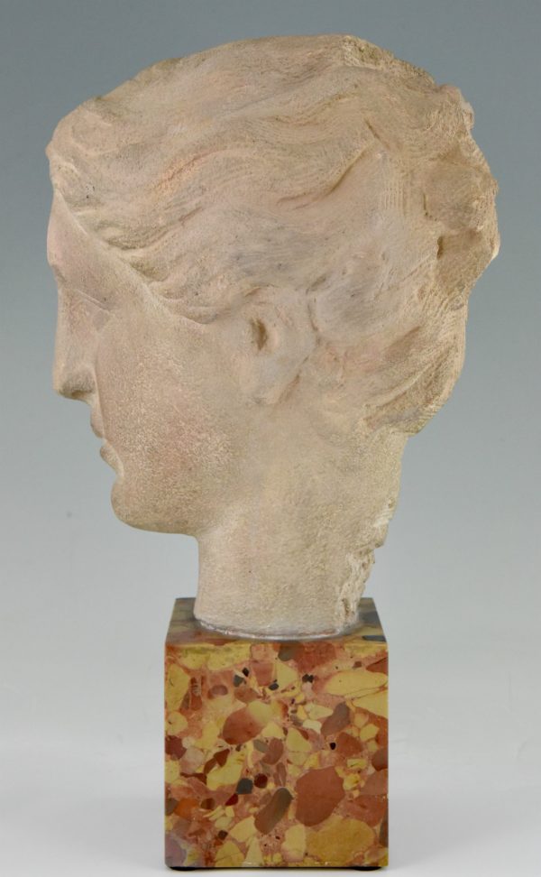 Art Deco bust of a woman in stone on a marble base, France 1940.
