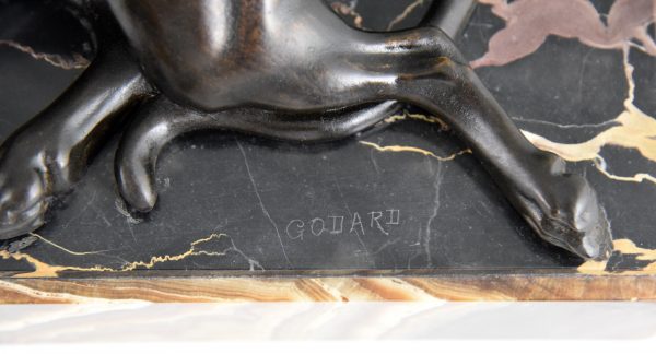 Impressive Art Deco group of a lady with two panthers. This large sculpture has a lovely patina and is mounted on a beautiful marble base. This version with two panthers is very hard to find. Signed by the French artist Armand Godard, ca. 1930