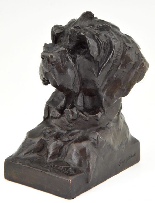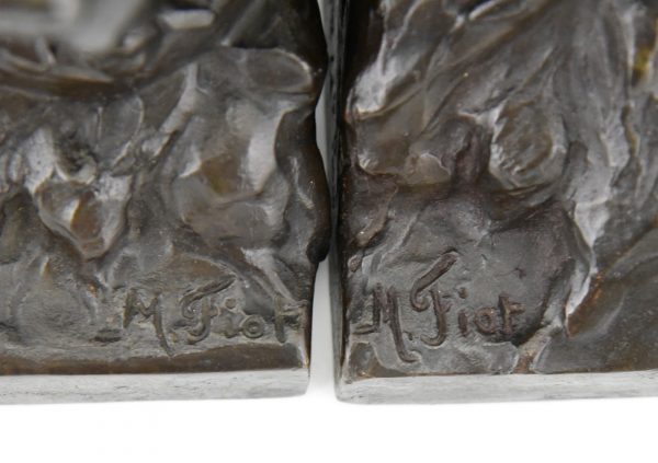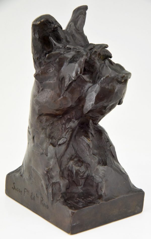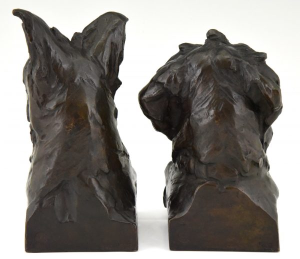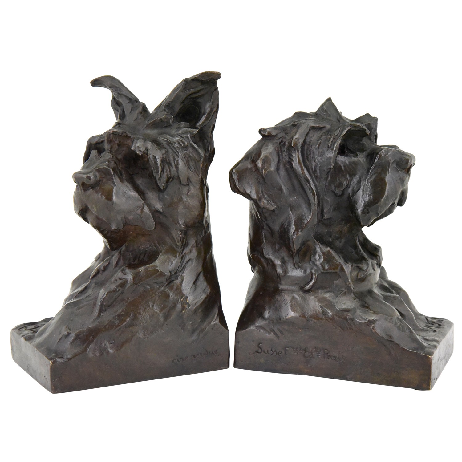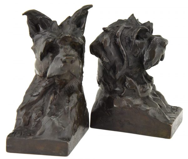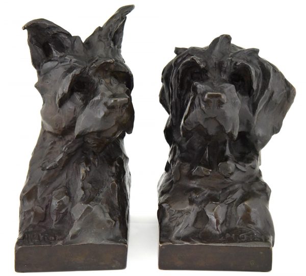 Pair of bronze bookends in the shape of terrier dog heads by the French artist Maximilien Louis Fiot, 1886-1953.  The sculptures have a beautiful patina and are signed by the artist as well as by the founder, Susse Freres. The dog busts are cast in the so called lost wax technique, Cire perdue.