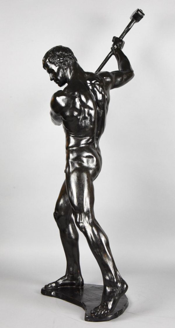 Impressive half size cast iron sculpture by Gerhard Adolf Janensch of a male nude with sledgehammer, dated 1920. The artist was born in Berlin in 1860, died in 1933. Work in musea in Germany.