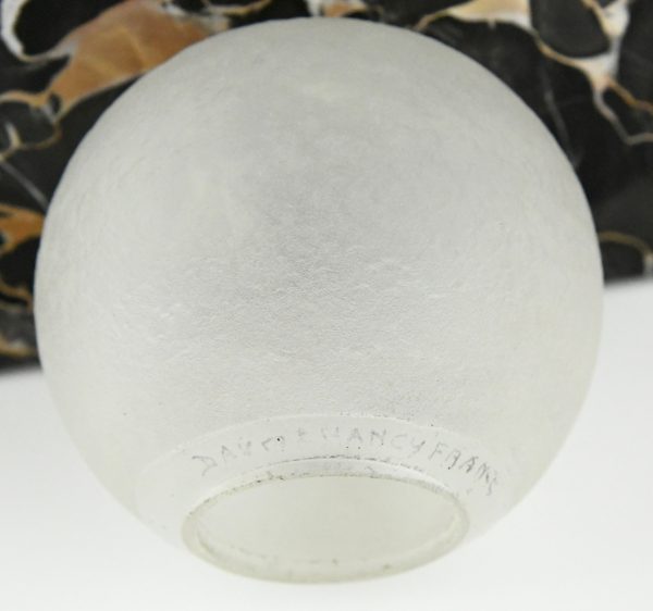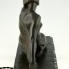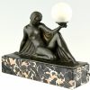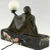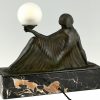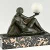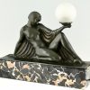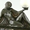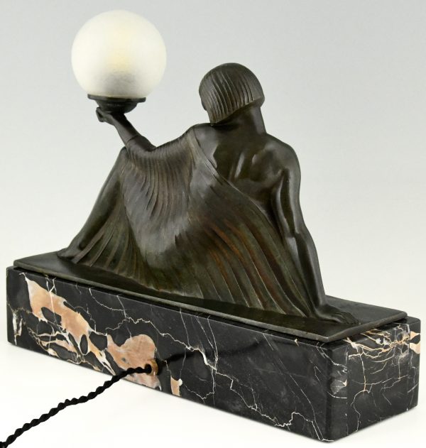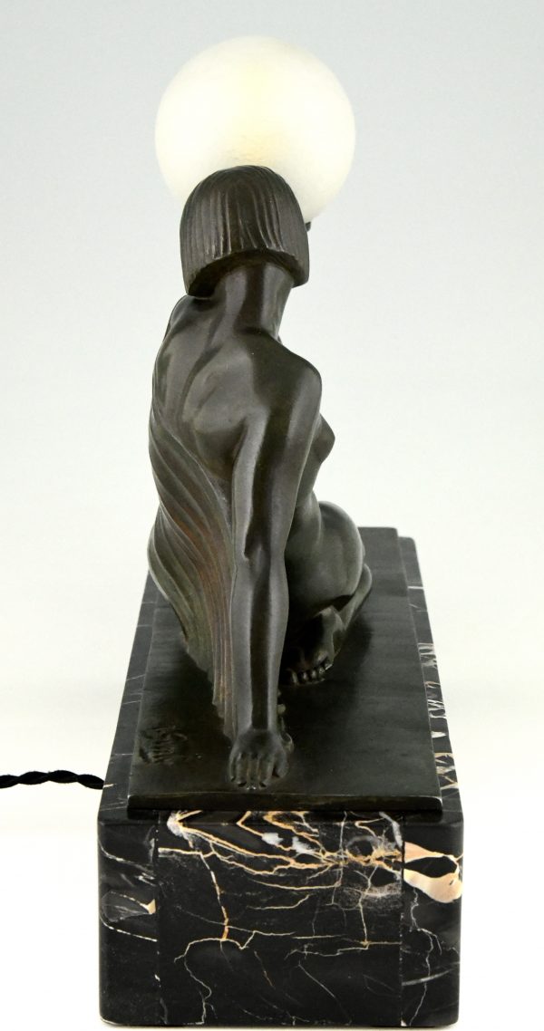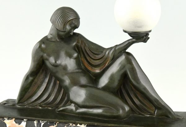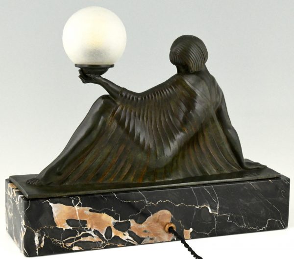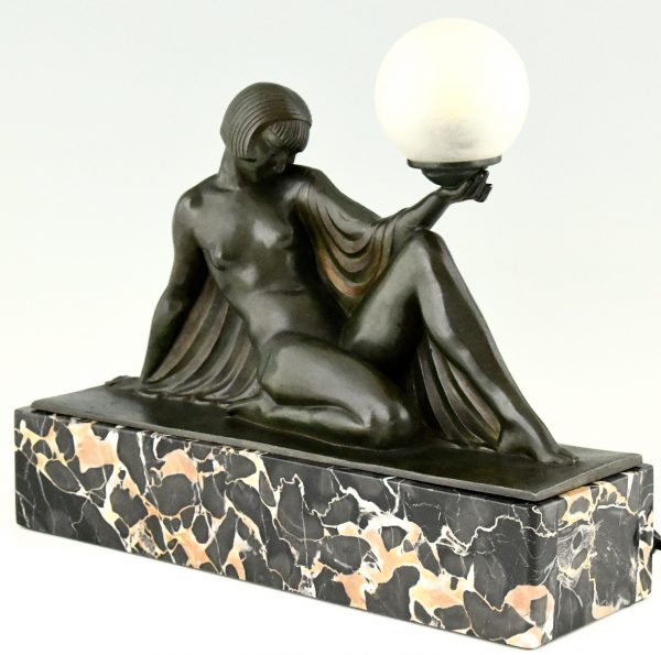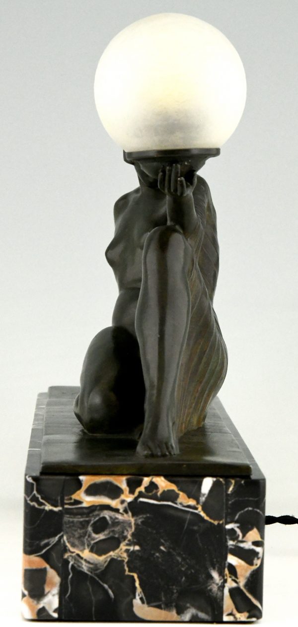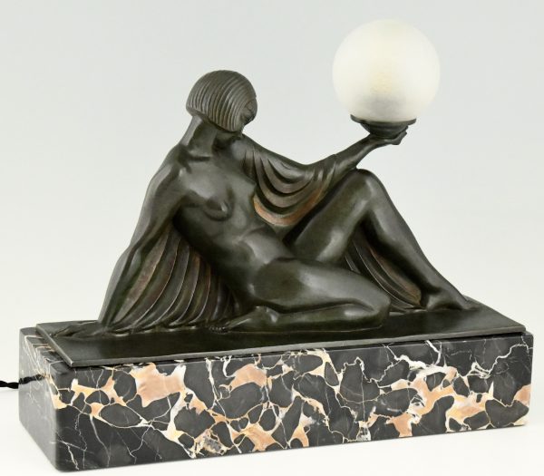 Lampe Rèverie Art Déco nu assis au drapé tenant un globe signé Raymonde Guerbe pour Max Le Verrier. Avec le globe en verre original signé par Daum Nancy, France.