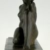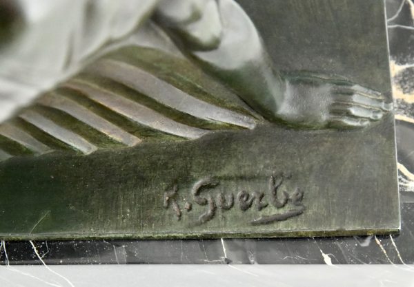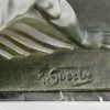 Sculpture d'art en métal à la patine verte foncé montée sur un socle en marbre Portor.