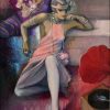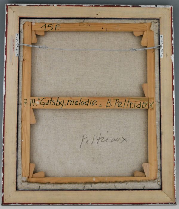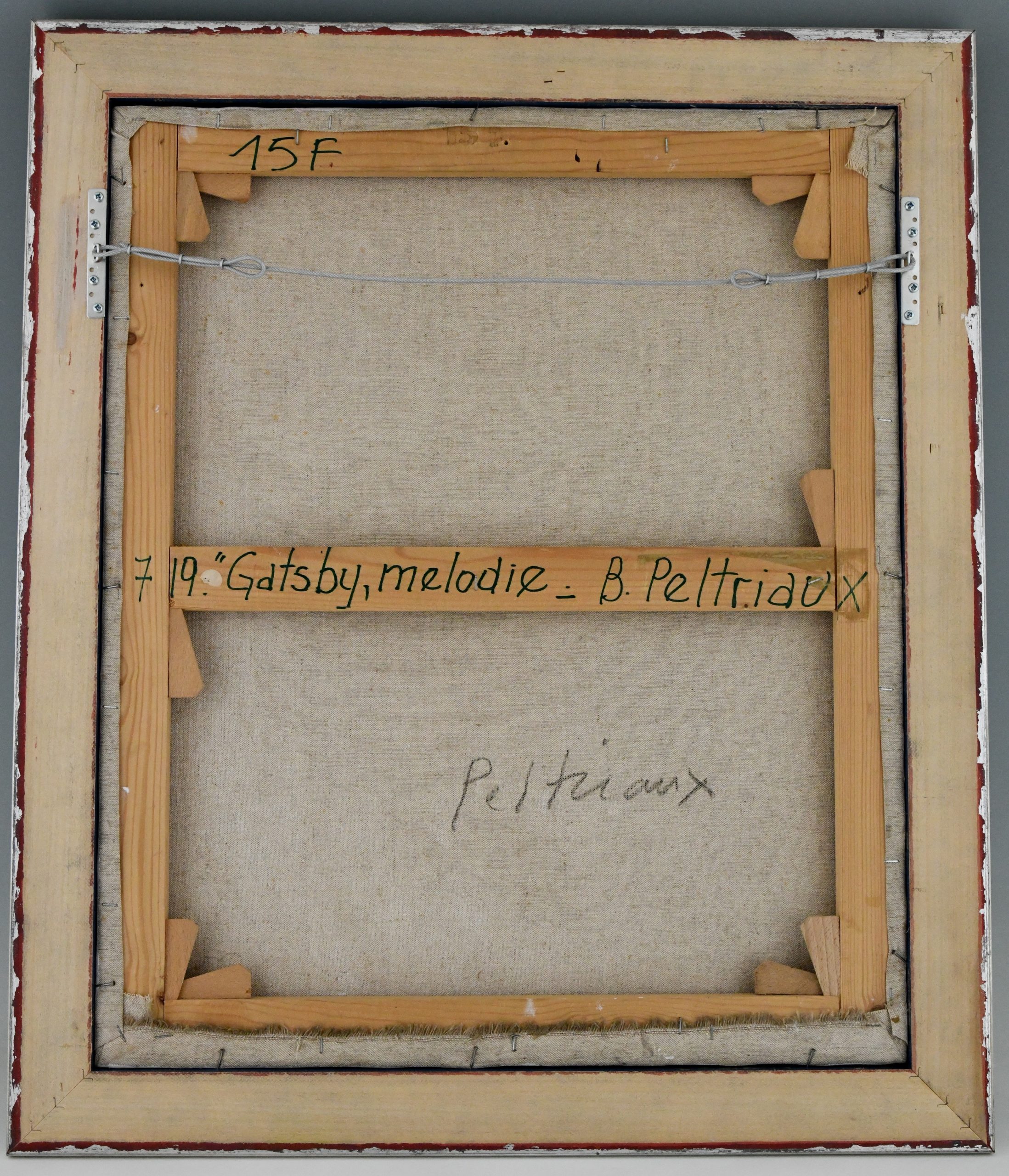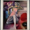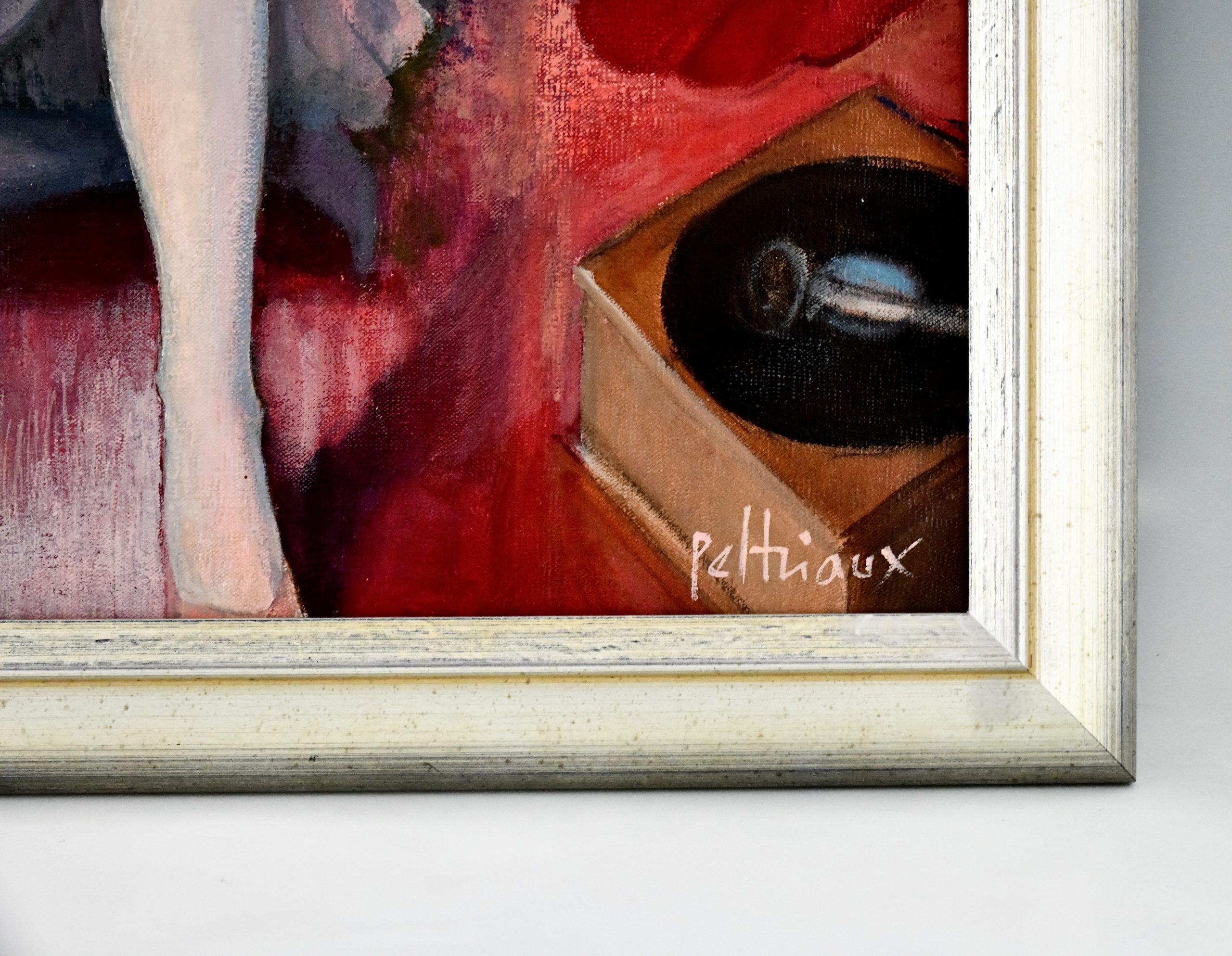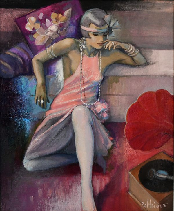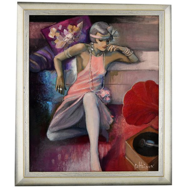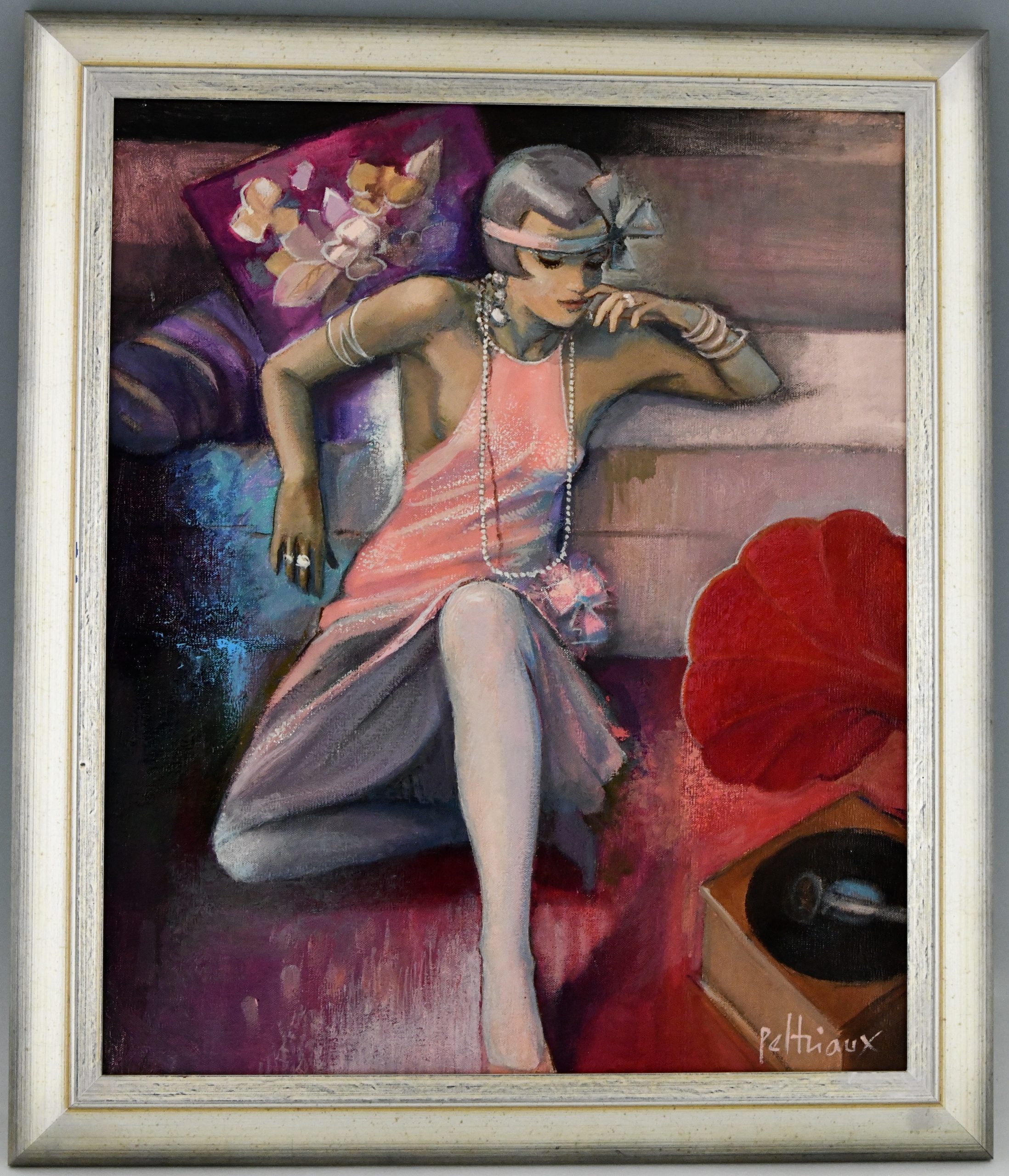 Peinture de style art déco femme en robe rose écoutant un gramophone. Mélodie Gatsby de Bernard Peltriaux. Né en 1921. Huile sur toile, cadre contemporain. France 20ème Siècle.