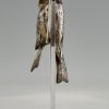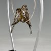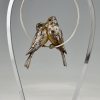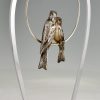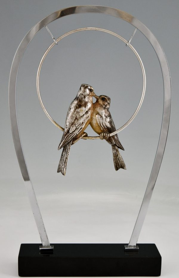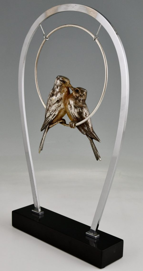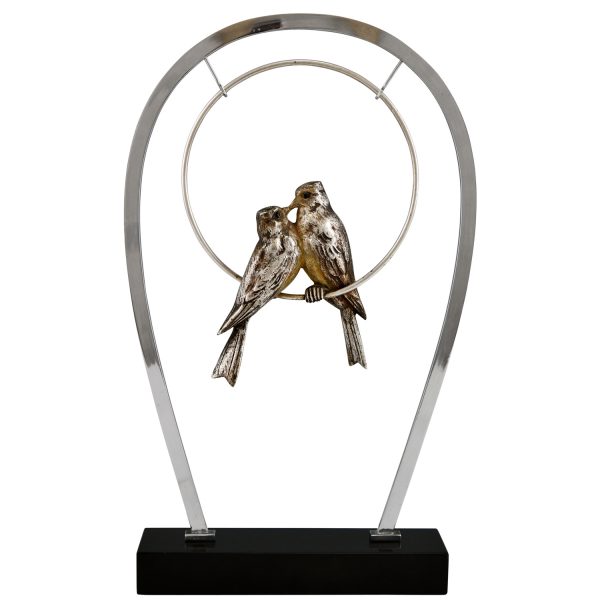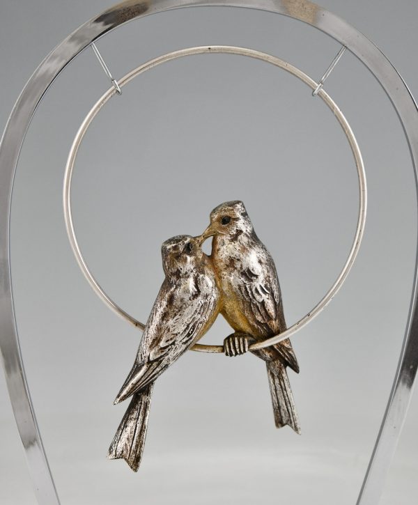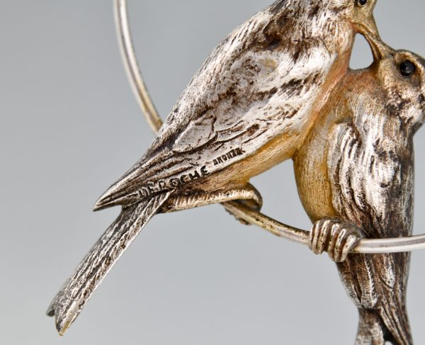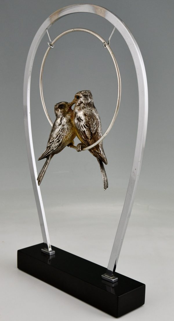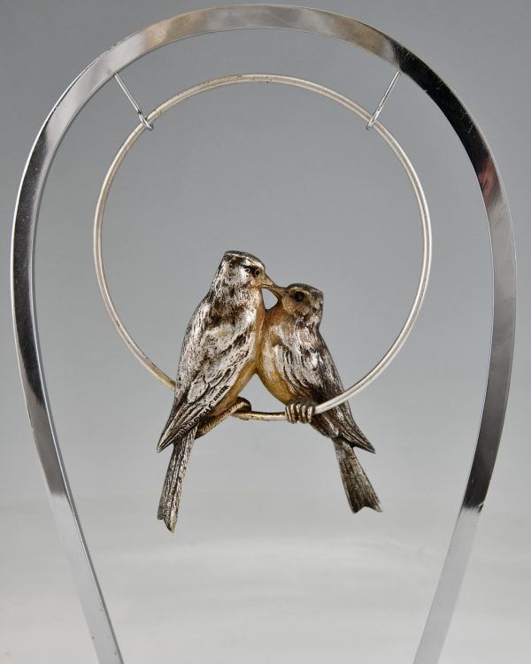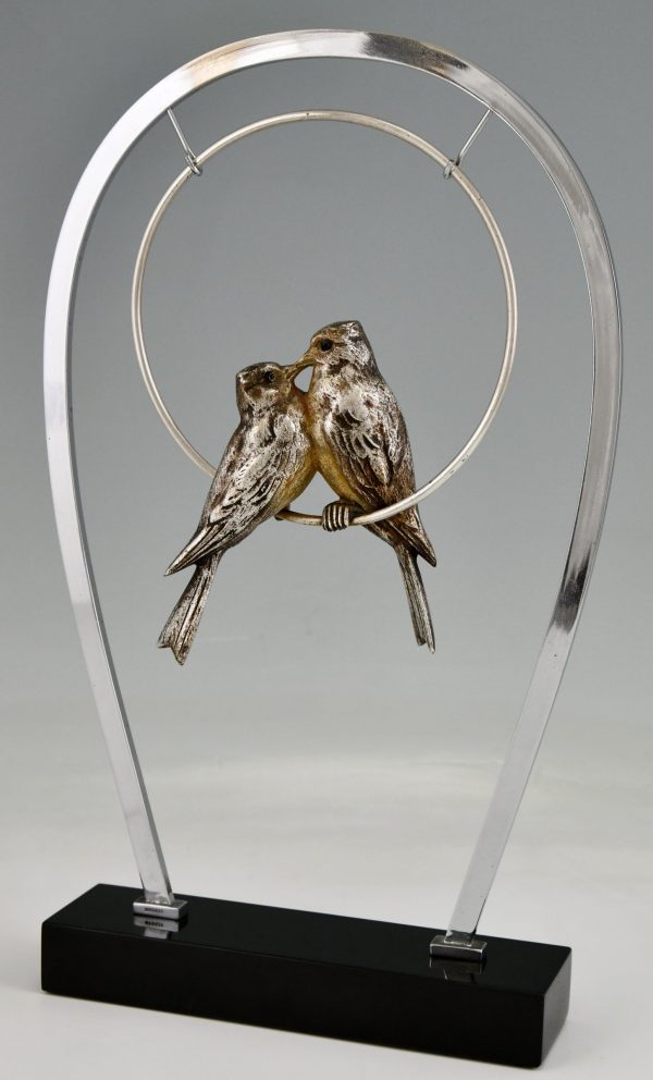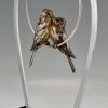 Sculpture Art Déco en bronze argenté représentant deux oiseaux sur une balançoire sur un socle en marbre noir de Belgique.