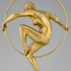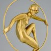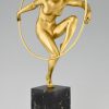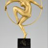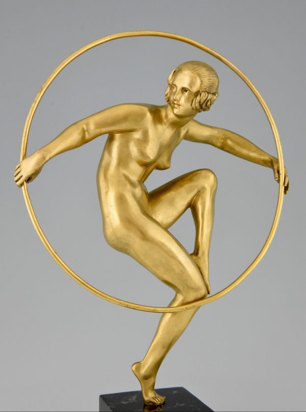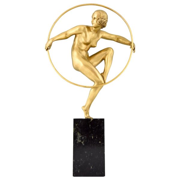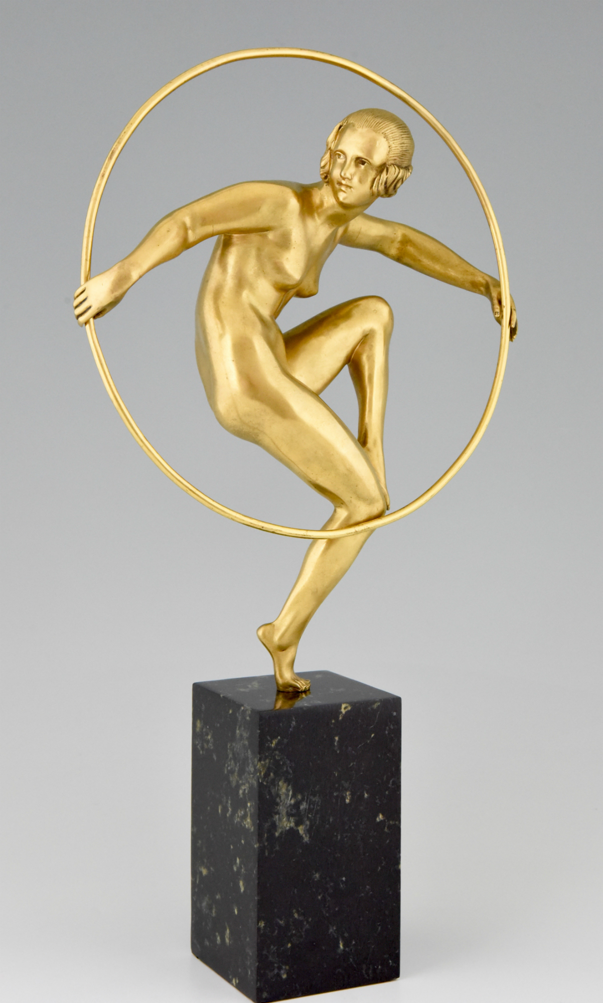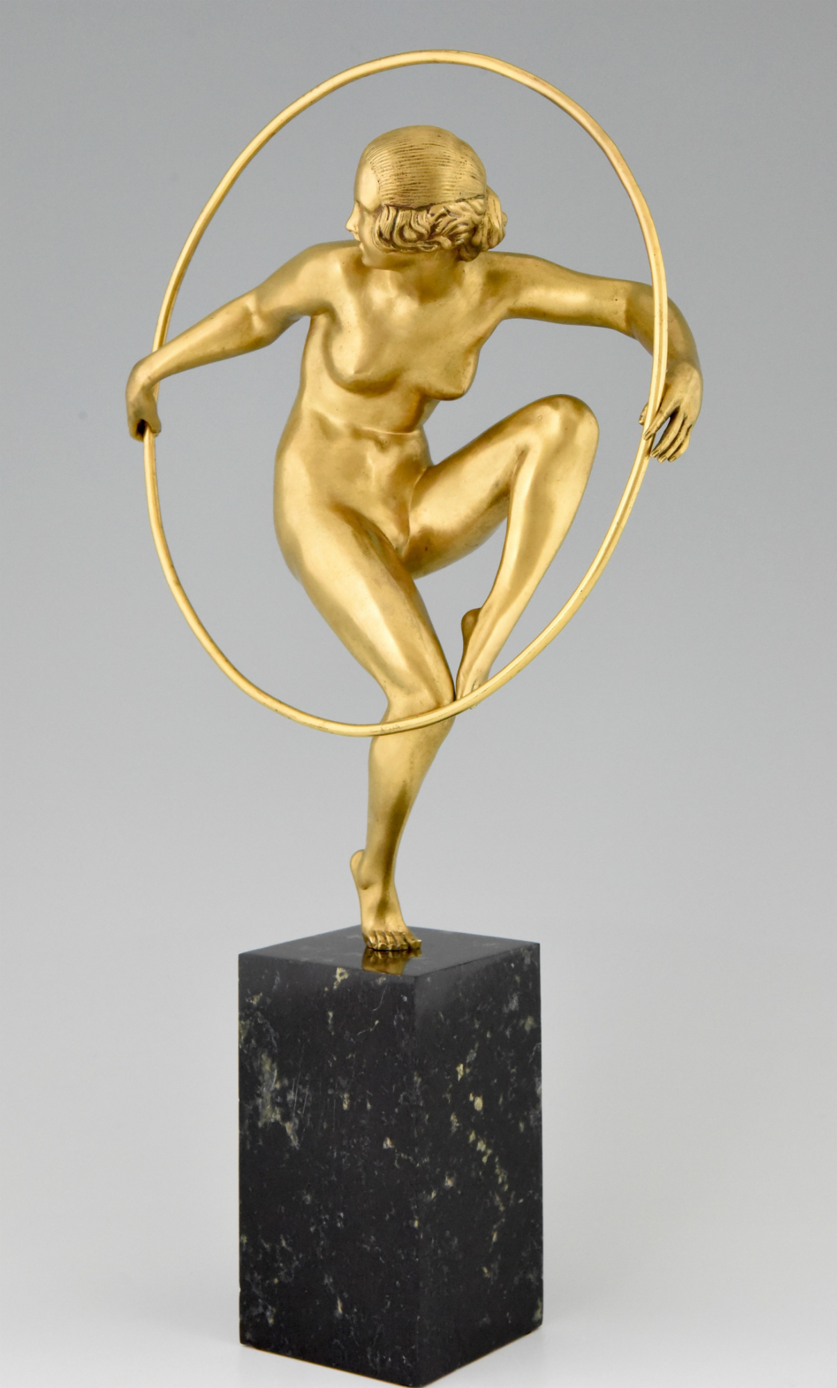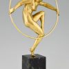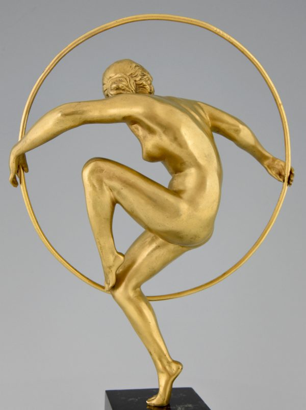 An elegant gilt bronze sculpture of a nude dancing on one leg holding a hoop by the French artist Marcel André Bouraine, 1886-1948.