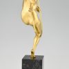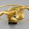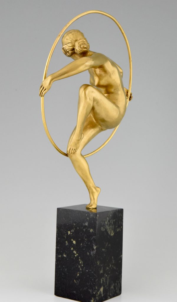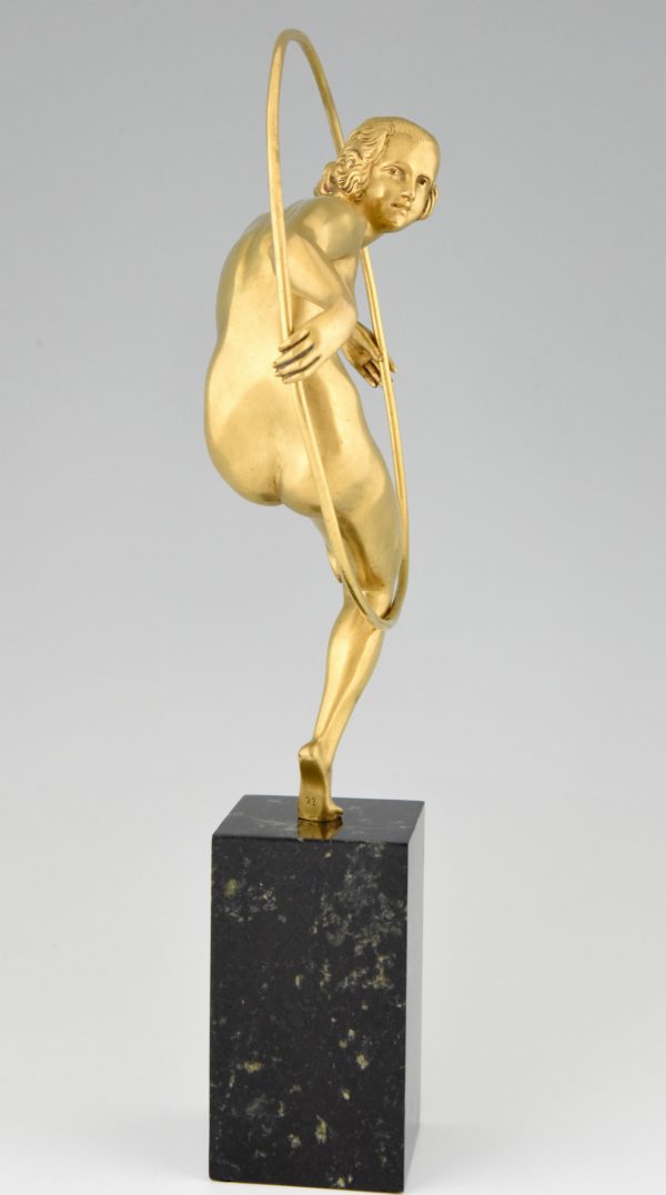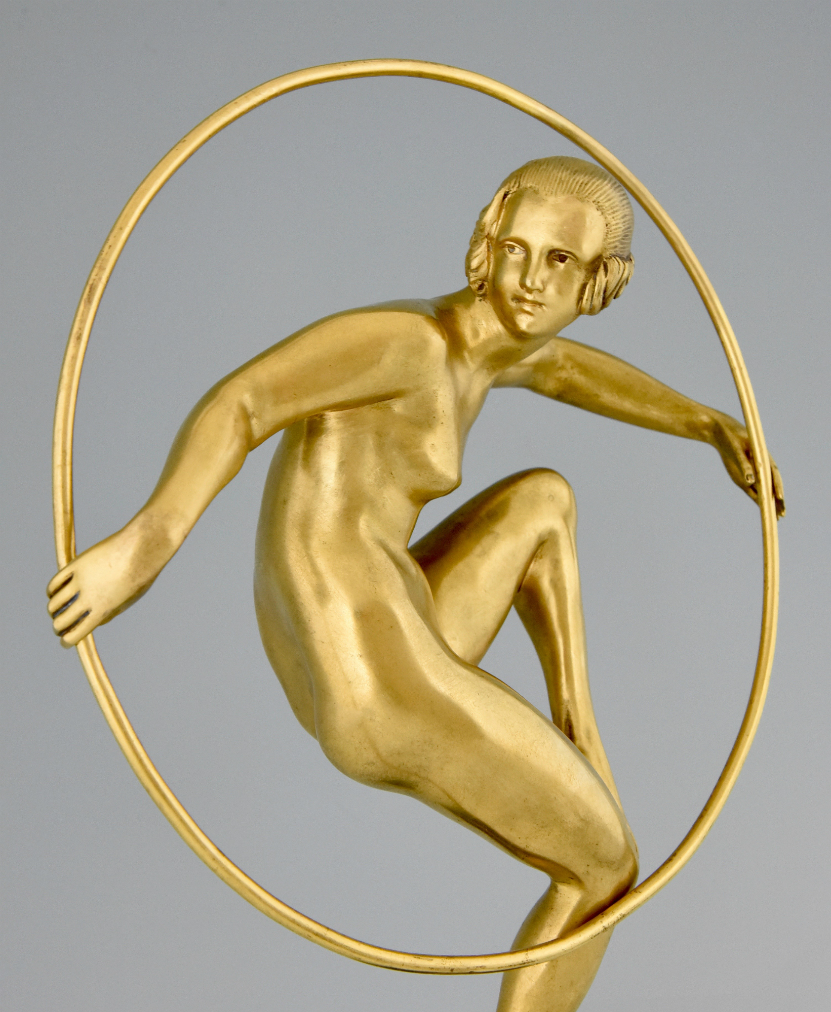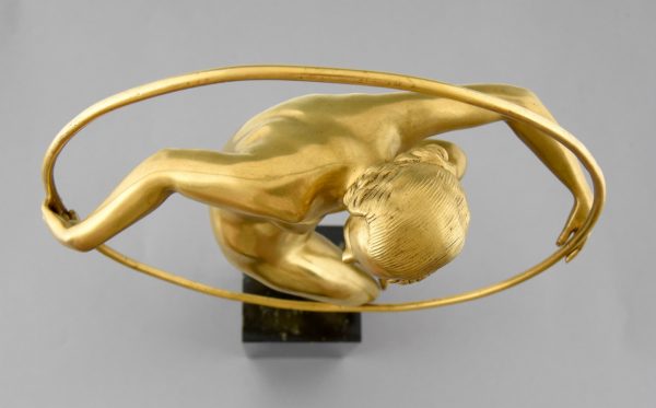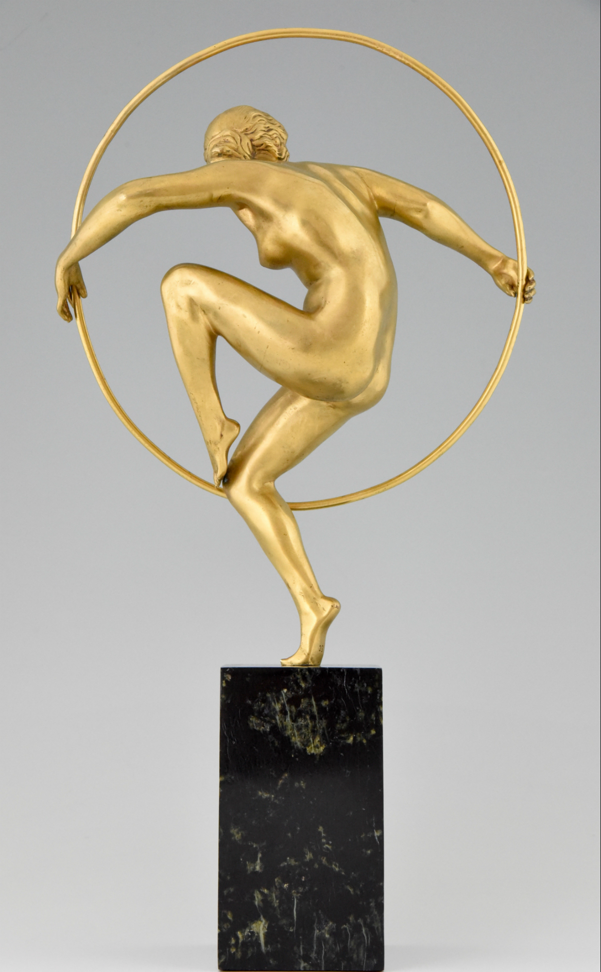 An elegant gilt bronze sculpture of a nude dancing on one leg holding a hoop by the French artist Marcel André Bouraine, 1886-1948.
