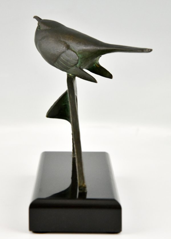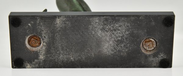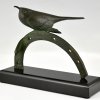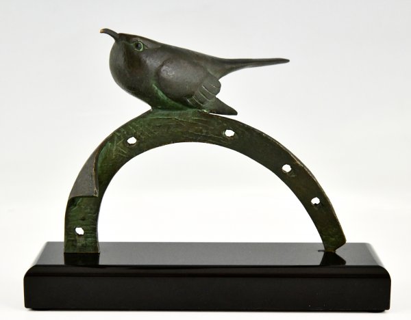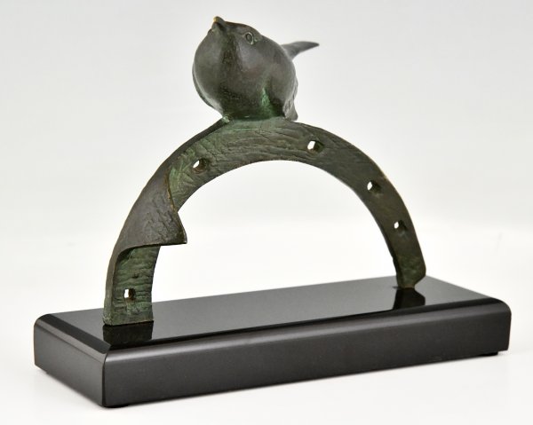 Sculpture en bronze Art Déco oiseau sur fer à cheval par André Vincent Becquerel, bronze à patine verte sur un socle en marbre noir belge.