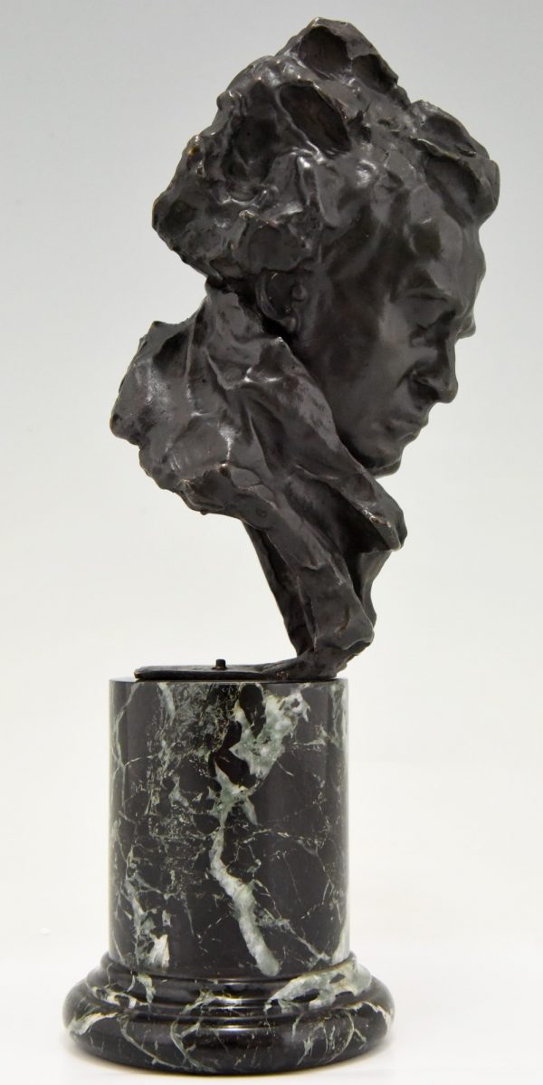 Antique bronze sculpture bust of Beethoven by Alfredo Pina, an Italian artist who worked in France. The bronze has a lovely patina and stands on a circular marble base. The work is signed and cast in the lost wax technique, with A.G. Paris foundry mark