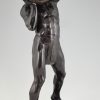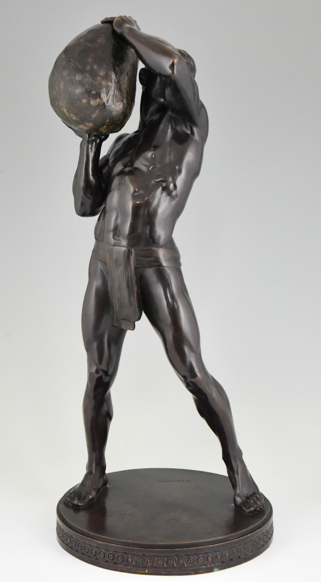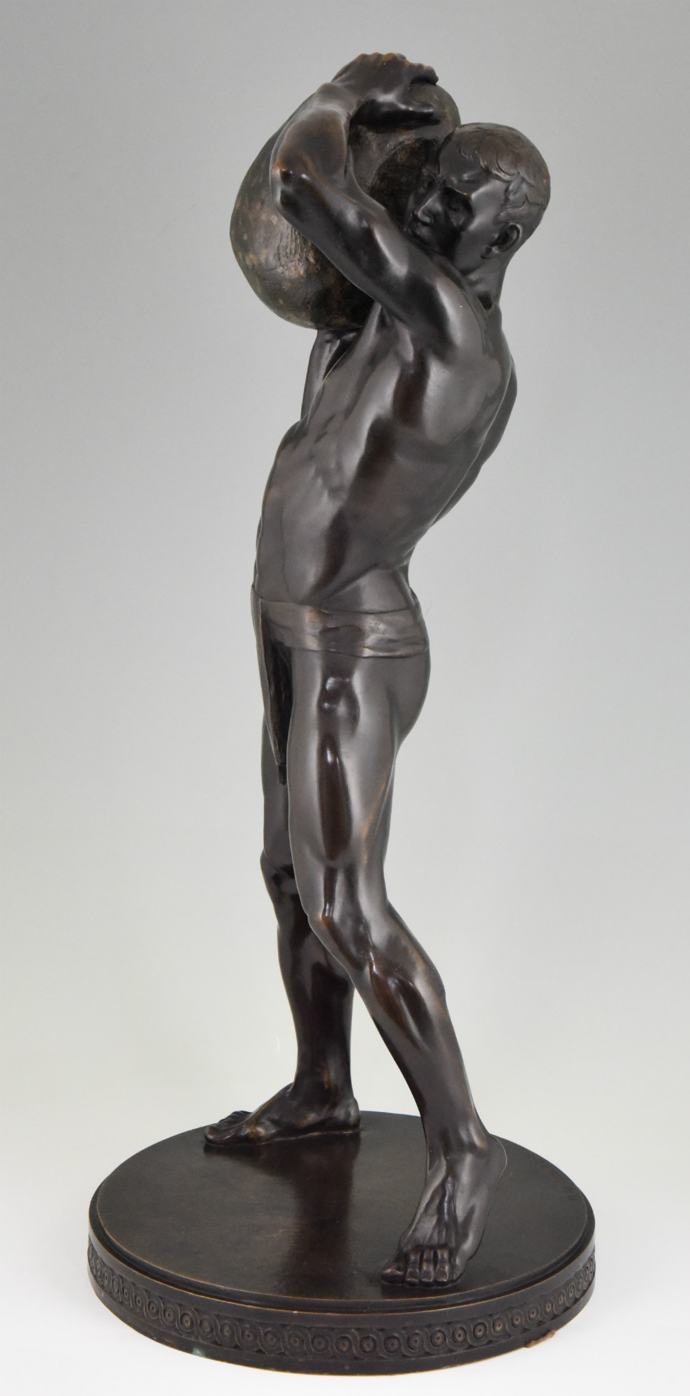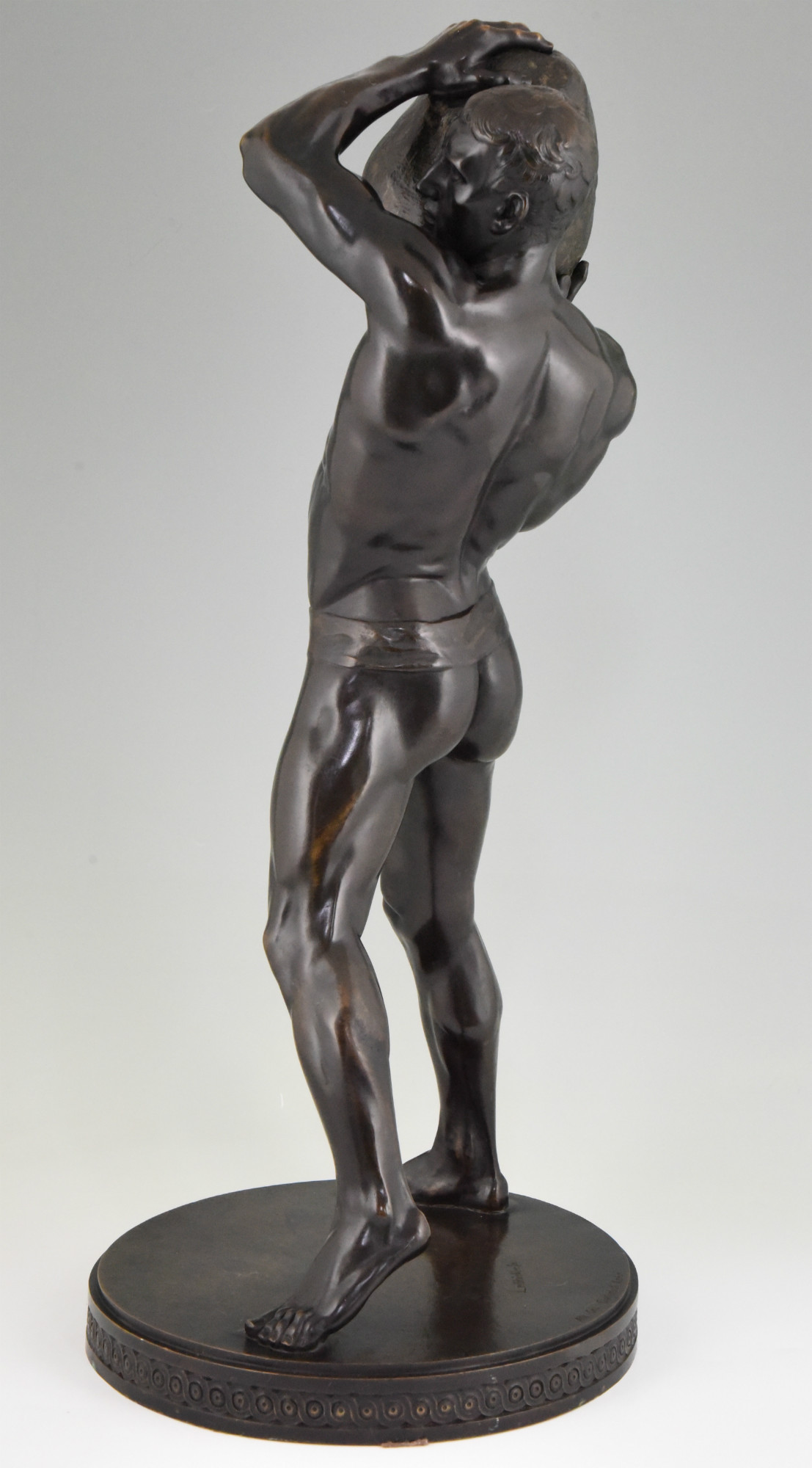 Sculpture en bronze nu masculin, athlète avec pierre.
