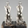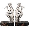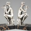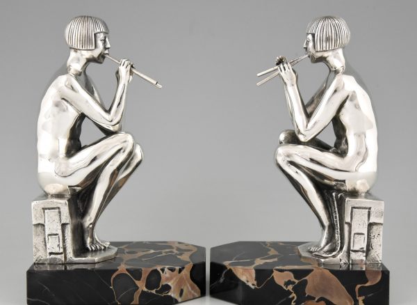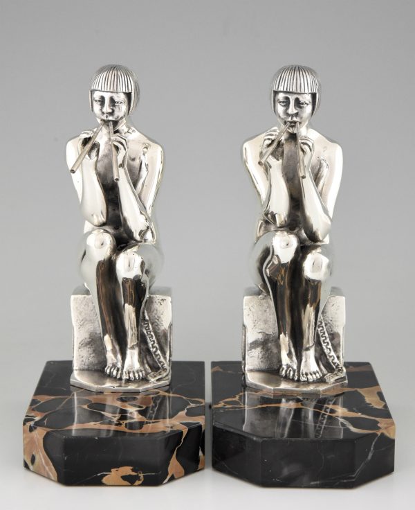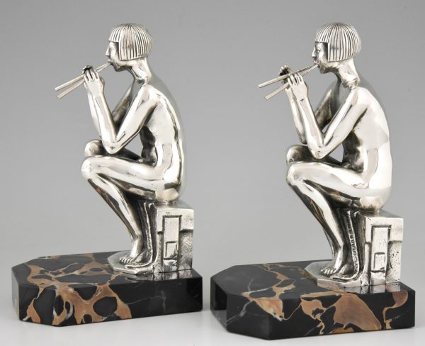 Stylish pair of silvered bronze Art deco bookends with nudes playing the flute, signed by the french artist Scribe and on a portor marble base.