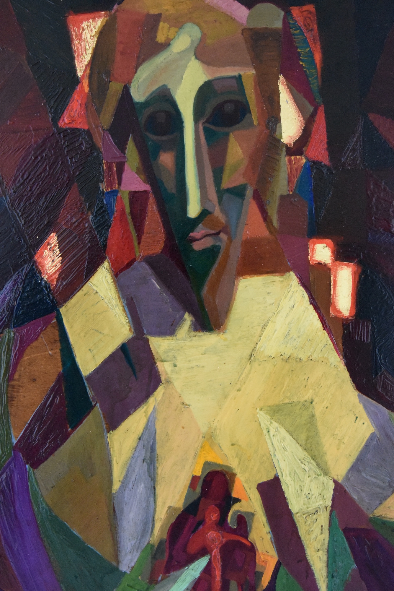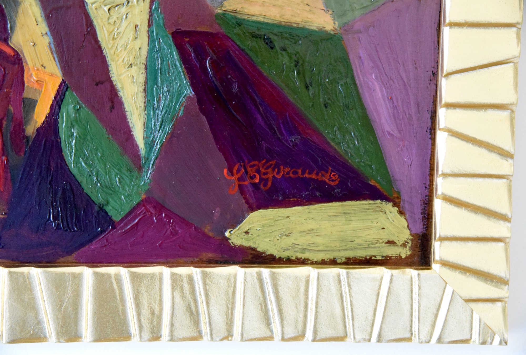 Mid Century Cubist portrait by the French artist Louis Giraud, signed and dated 1950 in a gold leaf frame. The colorful work has golden details and is painted on a wooden panel.