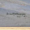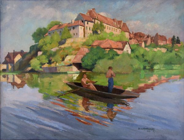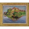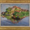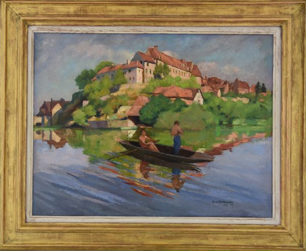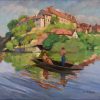 Beautiful French oil painting of a river village landscape with 2 young fisherman in a boat in the original frame.