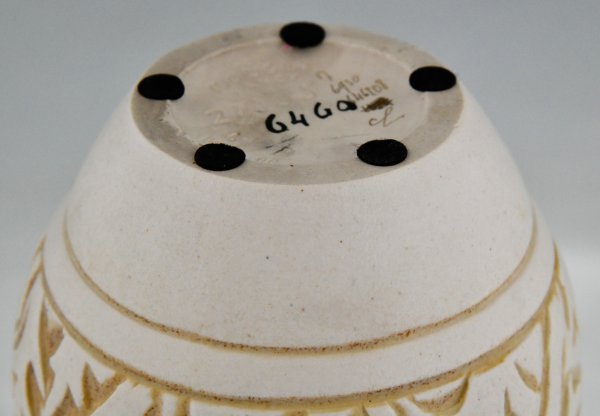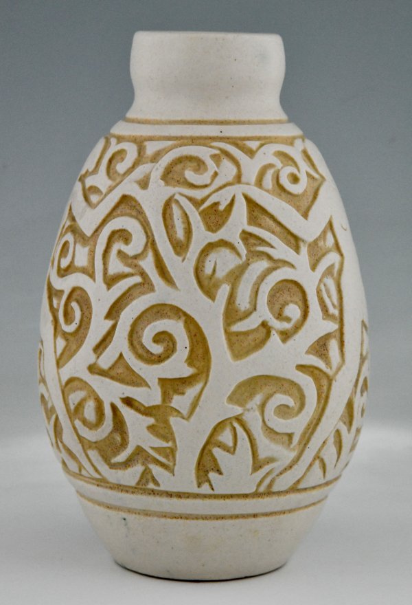 Grès Céramique à décor incisé de nus dansants et feuillages stylisés art déco dans les couleurs ivoire et jaune ocre.