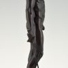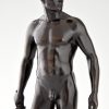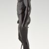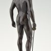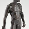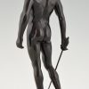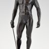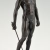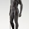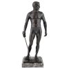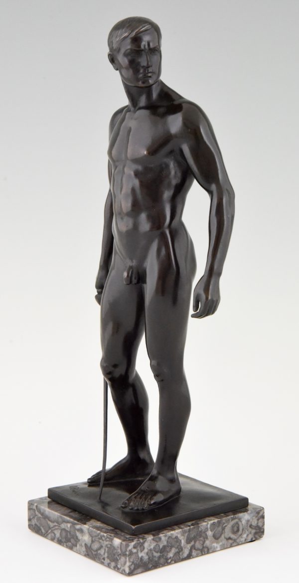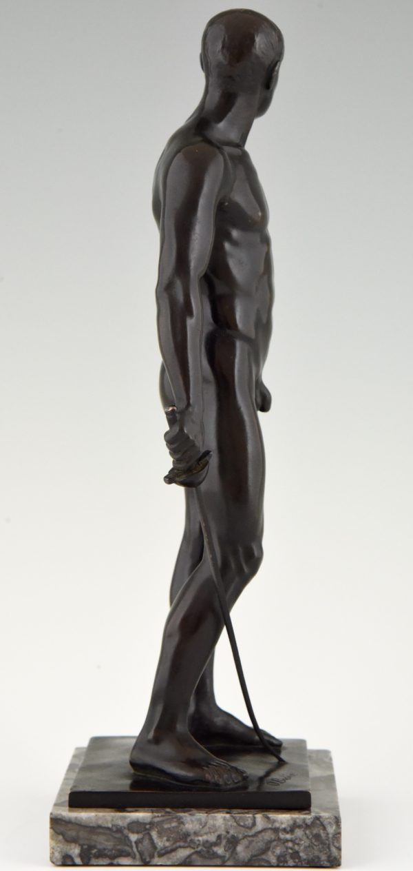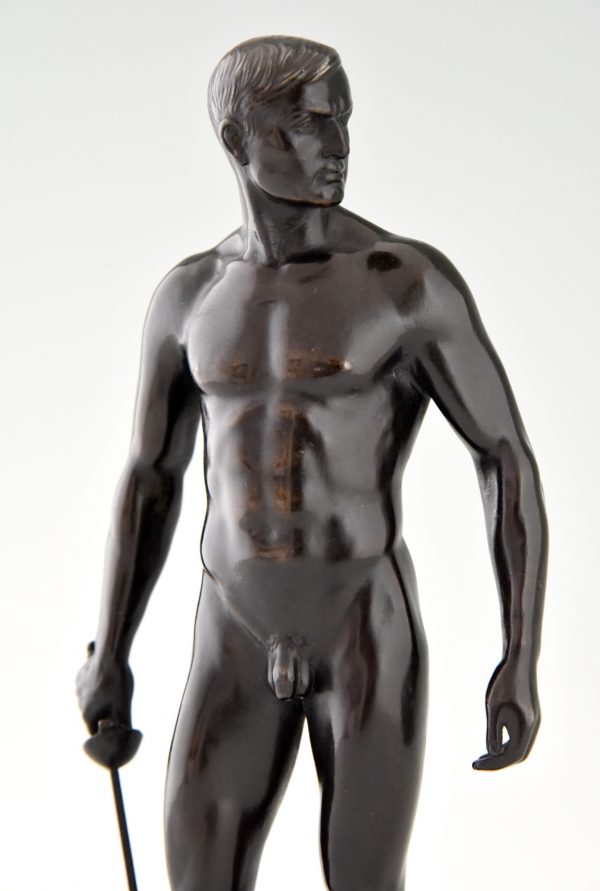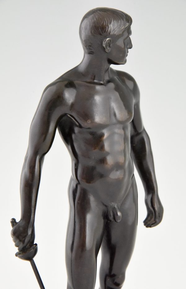 Beautiful antique bronze sculpture of a standing male nude fencer with foil by the German artsit Oskar Bodin, 1868-1940.