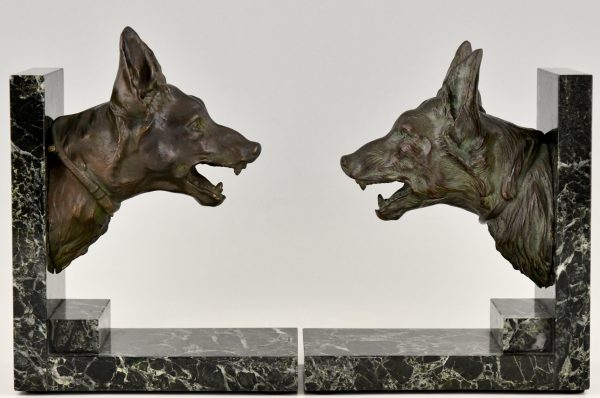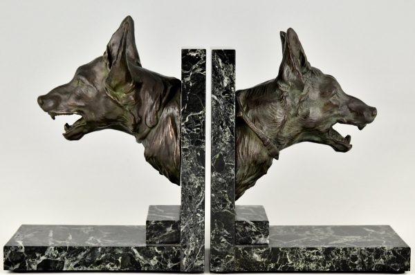 Art Deco bronze bookends with shepherd dogs by R. Varnier. France ca. 1925. Patinated bronze on marble bases.